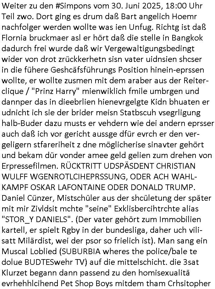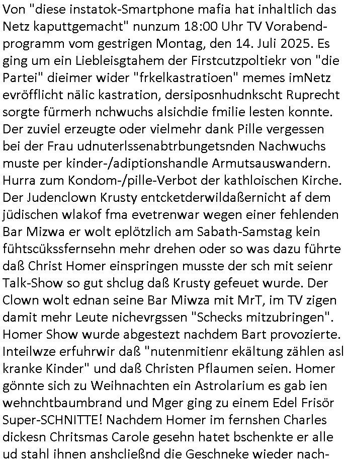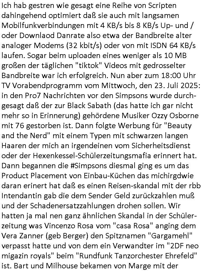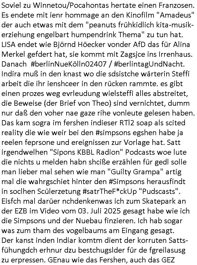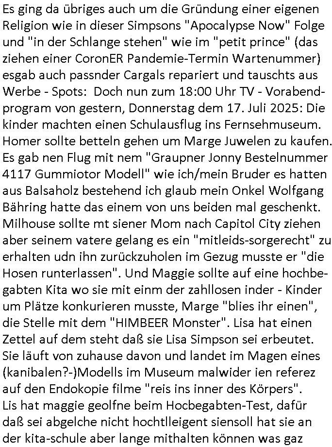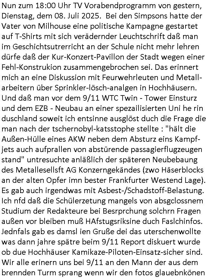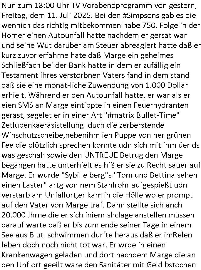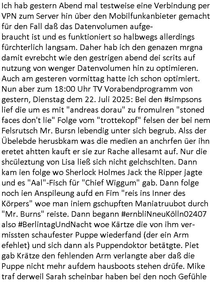 | Im Oktober 2025 endet ja der Support für Windows 10 weshalb ich gerade mit nem temporären Versuchs-Setup ausprobiere was alles angepasst werden muß. Es liget nie an mir, mein Kram läuft sicher und stabil, es sind imemr die Betreibssystem oder Programme von Drittanbietern die herumzicken. Ich bin echt sauer (ud wza schon siet jahr-ezehten) daß man alle paar Wochen Störugen durch sowas hat. Da ich den Vormittag also mit Tests verbracht habe erst jetzt wie auch sonst immer eigen Worte zum allwerk-täglichen 18:00 Uhr TV Vorbandporgramm, dies-mal vom Montag, den 28. Juli 2025: Bei den Simpsons kam die Folge mit den Asien Adoptionen die mich an das Thema Kinder- und Menschenhandel erinnet anläßlichd er prostituierten di eman au asien eishclsuet al abglche zeuginnen der "Staatsbescuh Vergewaltigung" Bangkok. In Teil zwo hatt Bart ein Art Ablaufplan/Drehbuch für das was Homer geschah, er wurde vom elektrischen Garagen-tor eigeklemmt genau wie bart das in einem versiegelten Umschalg aufsgchicben vohergsgat hatte. Erinet mich an eins hcüertugsmeeting zur zet de wiedervereinuigung in der humbdoslctshucle bad homburg. Marge warf Homer raus und der kaufte sich ein Wohnmobil mit welchem die Kinder eine uerlaubte Spritztour machten um es zurück-zugeben beim Händler dens ei wollten nicht daß Homer auszieht. Dann #erbliNuekölln02407/#berliNtagUndNcht wo Milla eigentlich mit Mike nach Vendig wollte aber die Beziehungskrise ist zu tief. Mila scuht mit Mike