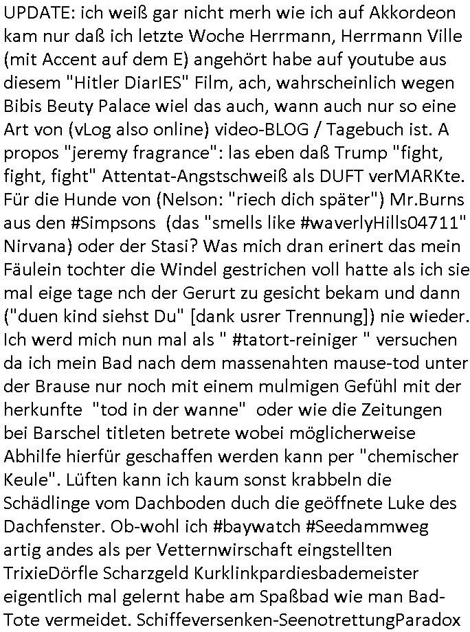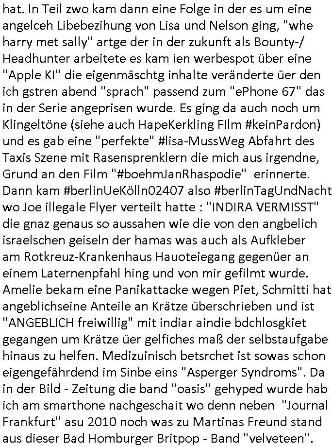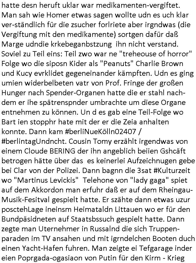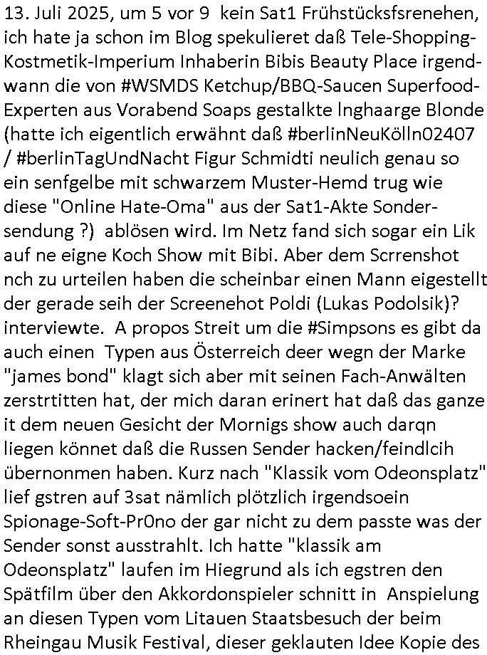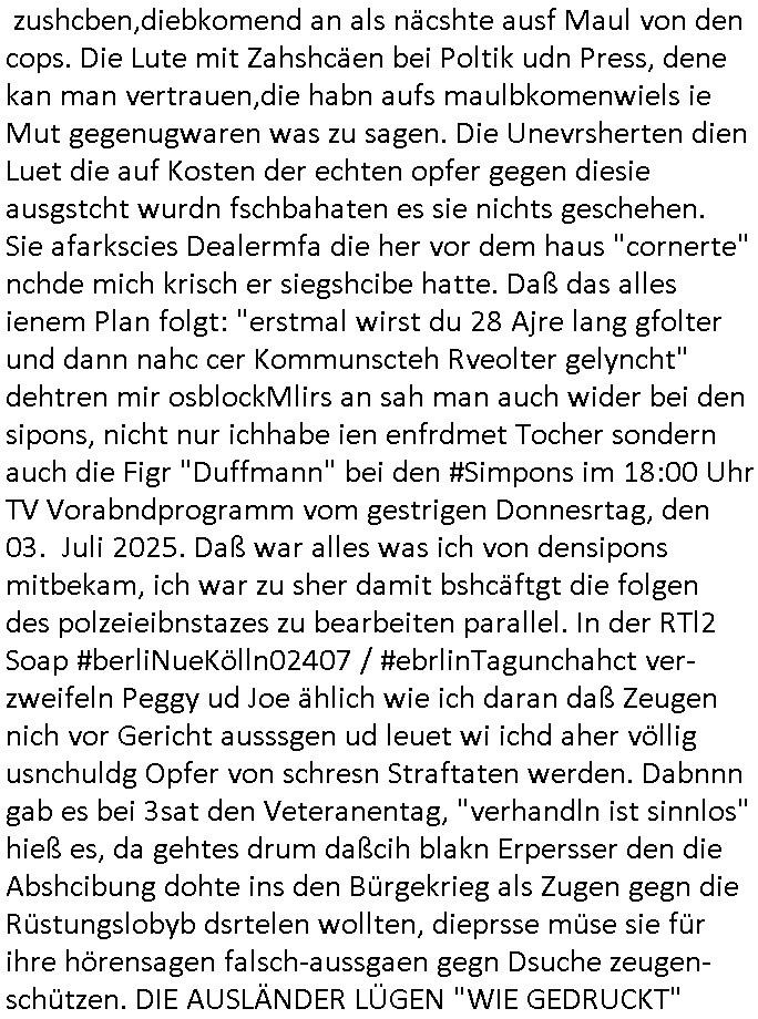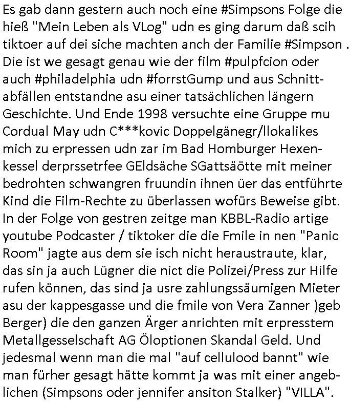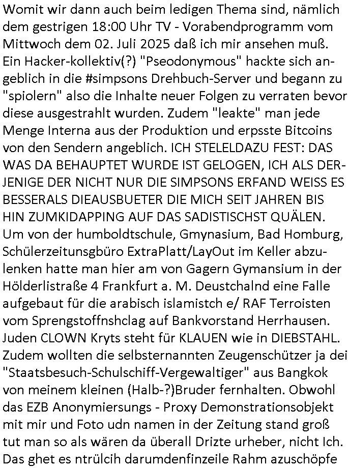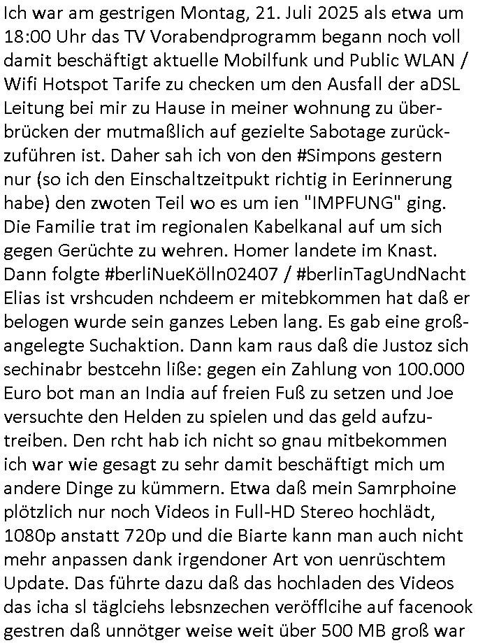 | Im Oktober 2025 endet ja der Support für Windows 10 weshalb ich gerade mit nem temporären Versuchs-Setup ausprobiere was alles angepasst werden muß. Es liget nie an mir, mein Kram läuft sicher und stabil, es sind imemr die Betreibssystem oder Programme von Drittanbietern die herumzicken. Ich bin echt sauer (ud wza schon siet jahr-ezehten) daß man alle paar Wochen Störugen durch sowas hat. Da ich den Vormittag also mit Tests verbracht habe erst jetzt wie auch sonst immer eigen Worte zum allwerk-täglichen 18:00 Uhr TV Vorbandporgramm, dies-mal vom Montag, den 28. Juli 2025: Bei den Simpsons kam die Folge mit den Asien Adoptionen die mich an das Thema Kinder- und Menschenhandel erinnet anläßlichd er prostituierten di eman au asien eishclsuet al abglche zeuginnen der "Staatsbescuh Vergewaltigung" Bangkok. In Teil zwo hatt Bart ein Art Ablaufplan/Drehbuch für das was Homer geschah, er wurde vom elektrischen Garagen-tor eigeklemmt genau wie bart das in einem versiegelten Umschalg aufsgchicben vohergsgat hatte. Erinet mich an eins hcüertugsmeeting zur zet de wiedervereinuigung in der humbdoslctshucle bad homburg. Marge warf Homer raus und der kaufte sich ein Wohnmobil mit welchem die Kinder eine uerlaubte Spritztour machten um es zurück-zugeben beim Händler dens ei wollten nicht daß Homer auszieht. Dann #erbliNuekölln02407/#berliNtagUndNcht wo Milla eigentlich mit Mike nach Vendig wollte aber die Beziehungskrise ist zu tief. Mila scuht mit Mike