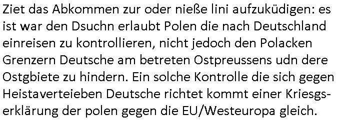 | Ziet das Abkommen zur oder nieße lini aufzuküdigen: es ist war den Dsuchn erlaubt Polen die nach Deutschland einreisen zu kontrollieren, nicht jedoch den Polacken Grenzern Deutsche am betreten Ostpreussens udn dere Ostgbiete zu hindern. Ein solche Kontrolle die sich gegen Heistaverteieben Deutsche richtet kommt einer Kriesgs-erklärung der polen gegen die EU/Westeuropa gleich.