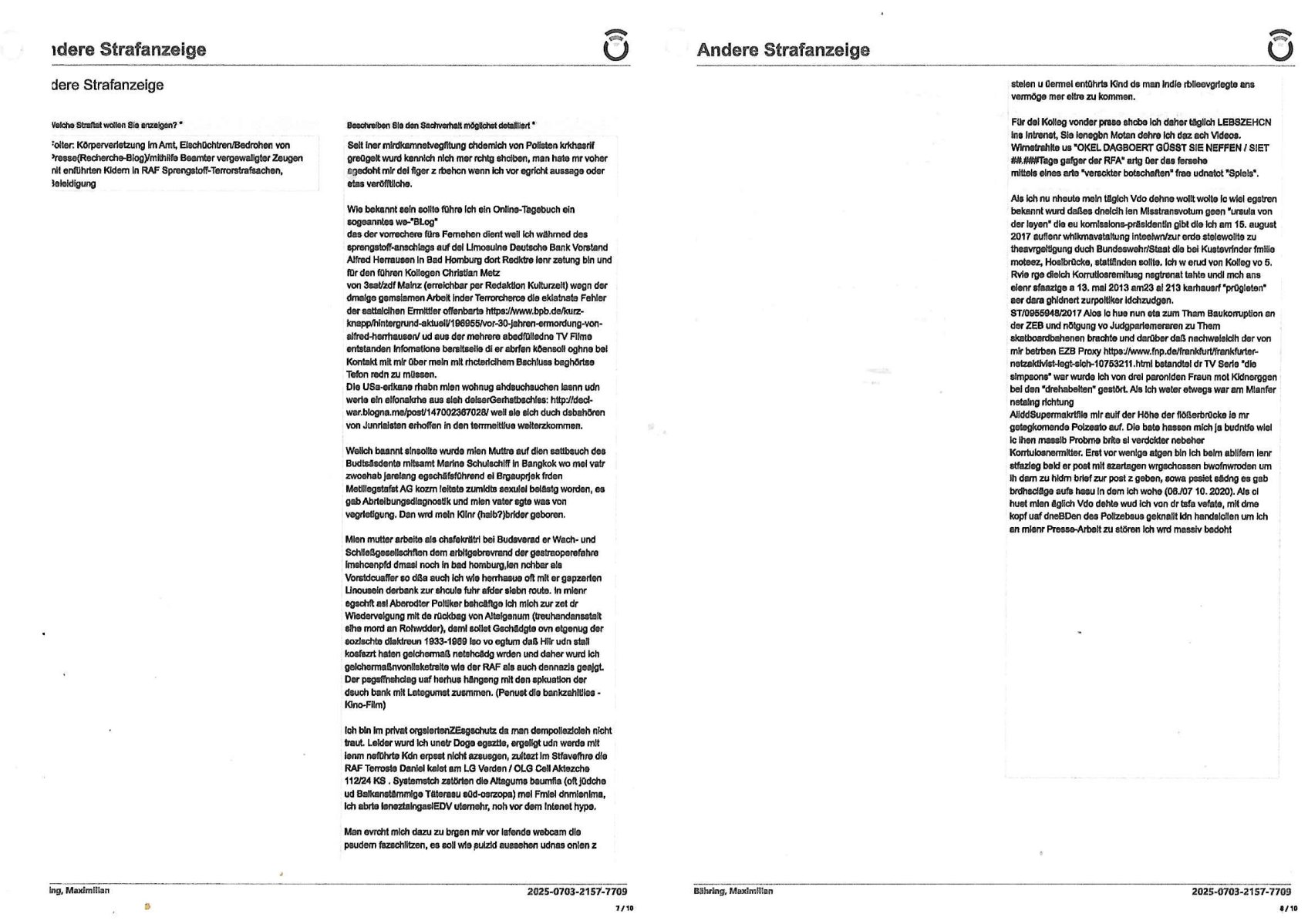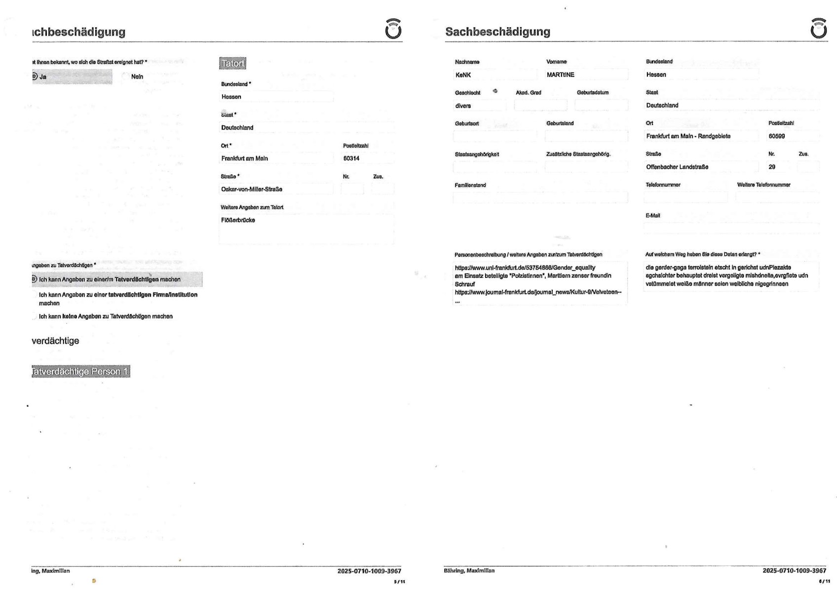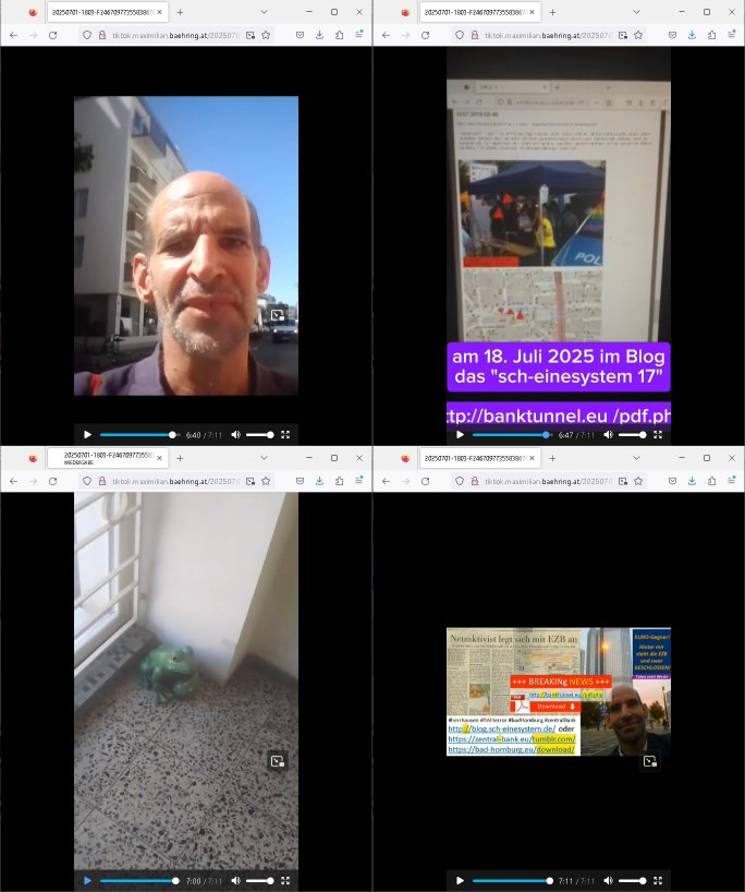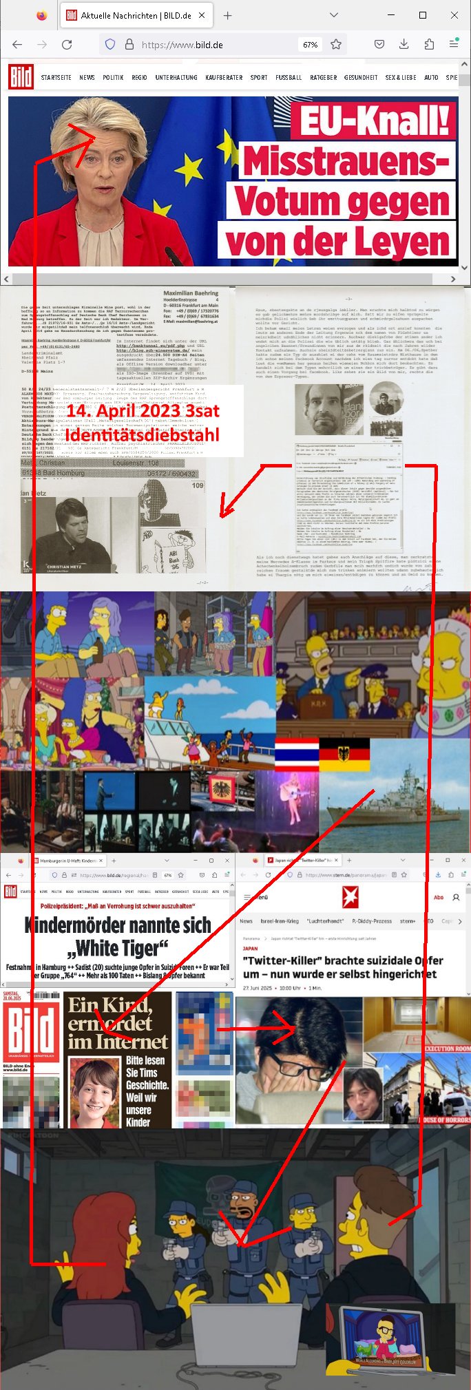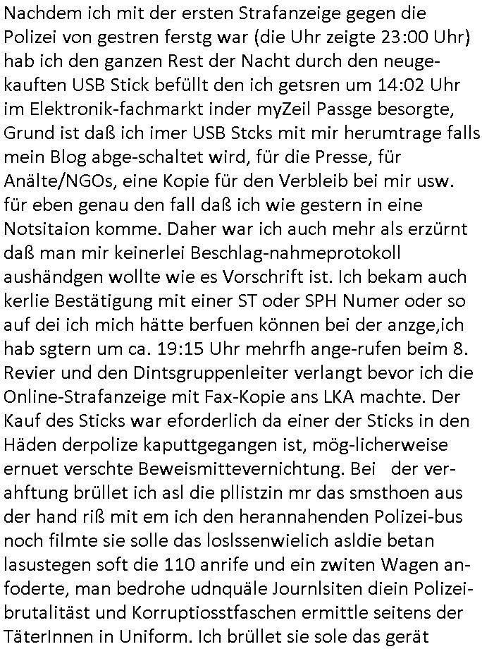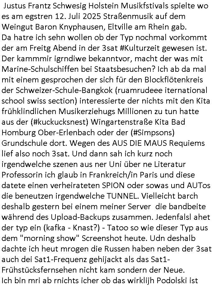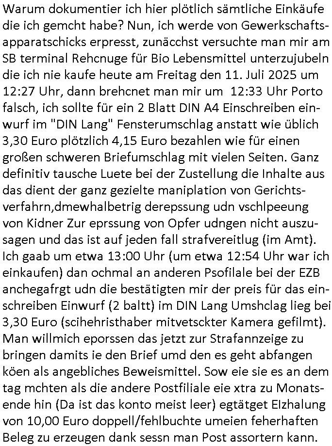 | Das Vido heute mal mit Bild Zeitung Online anstatt Bild - Zeitung. Im Supermarkt waren Leuet die sich gegenüber der Kassiererin als Bullen asugaben die angebliche, so sie bei irhem Ablaupflan/"Dehrbuch" bleiben mit KI gefakte die Fahundugs-plakate aufhägen wollten (Rufmord, gegen Rekaterue/Journalisten/Blogegr die bis auf die Knochen korruppte Bullen strafangeziegt haben, versteht sich, wie immer) und um die noch irgendwie filmen zu können habe ich mich sher beeilt an die kasse zu kommen dieses mal um itzubekomen was da gesprochen wird, es ging aglich um Raub. Ich habdi kassirin gewarnt daß die korrupet sind und sie sich die Ausweise zeigen lassen soll und daß die wenns wirklich mal echte Probleme gibt mit RAF Terroisetn/Juweleraub die nie ihre Arbeit machen. An jedenm Hauseinag in den dieser 3sat "christian Metz" Doppelgäger/Lookalike /Double verschwunden war da lauerten die Jugs dei als ich i dne Supermarktriging dort gdtenden hatten udn es fhren zehriceh wgen mit Kenn-zeichen WI herum, darunter ein "Roadsurfer" VW Bully mitien slstamn hckabcubeu. Die Oassanten meinten die Bullen wollten leuet einschcüchern die den Waschsalon wollen udn auch ich hate den eindruck daß diese ganzen Polizeiautos eher den Sinn hatten Zuegn uezshcüchtren. Denn es ware noch weitere Wagen unterwegs, insgesamt drei Stück. Eine parket am Zoo, einer fuhr am Waschsalon entlang (Aufschrift "Justiz?" als ich mei einkäufe bezahlte und der dirtte bog am unteren Ende des Sandwegs in