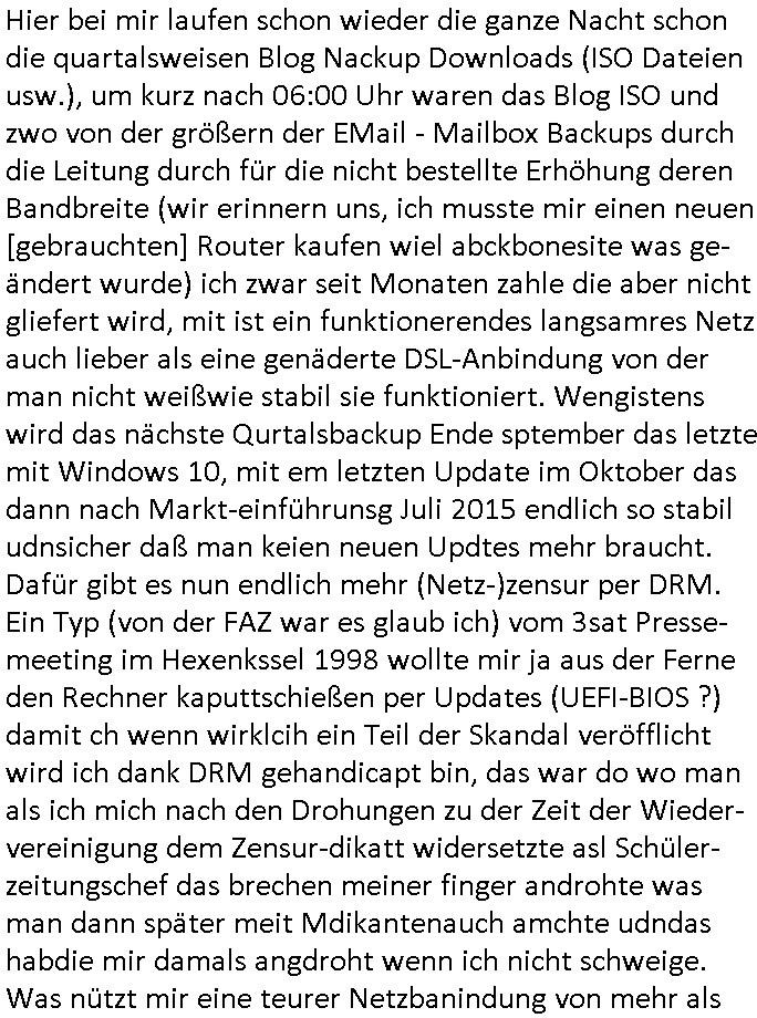 | Hier bei mir laufen schon wieder die ganze Nacht schon die quartalsweisen Blog Nackup Downloads (ISO Dateien usw.), um kurz nach 06:00 Uhr waren das Blog ISO und zwo von der größern der EMail - Mailbox Backups durch die Leitung durch für die nicht bestellte Erhöhung deren Bandbreite (wir erinnern uns, ich musste mir einen neuen [gebrauchten] Router kaufen wiel abckbonesite was ge-ändert wurde) ich zwar seit Monaten zahle die aber nicht gliefert wird, mit ist ein funktionerendes langsamres Netz auch lieber als eine genäderte DSL-Anbindung von der man nicht weißwie stabil sie funktioniert. Wengistens wird das nächste Qurtalsbackup Ende sptember das letzte mit Windows 10, mit em letzten Update im Oktober das dann nach Markt-einführunsg Juli 2015 endlich so stabil udnsicher daß man keien neuen Updtes mehr braucht. Dafür gibt es nun endlich mehr (Netz-)zensur per DRM. Ein Typ (von der FAZ war es glaub ich) vom 3sat Presse-meeting im Hexenkssel 1998 wollte mir ja aus der Ferne den Rechner kaputtschießen per Updates (UEFI-BIOS ?) damit ch wenn wirklcih ein Teil der Skandal veröfflicht wird ich dank DRM gehandicapt bin, das war do wo man als ich mich nach den Drohungen zu der Zeit der Wieder-vereinigung dem Zensur-dikatt widersetzte asl Schüler-zeitungschef das brechen meiner finger androhte was man dann später meit Mdikantenauch amchte udndas habdie mir damals angdroht wenn ich nicht schweige. Was nützt mir eine teurer Netzbanindung von mehr als