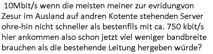 10Mbit/s wenn die meisten meiner zur evridungvon Zesur im Ausland auf andren Kotente stehenden Server ohre-hin nicht schneller als bestenflls mit ca. 750 kbit/s hier ankommen also schon jetzt viel weniger bandbreite brauchen als die bestehende Leitung hergeben würde? | |
