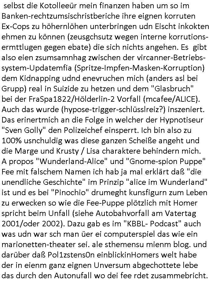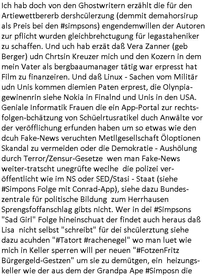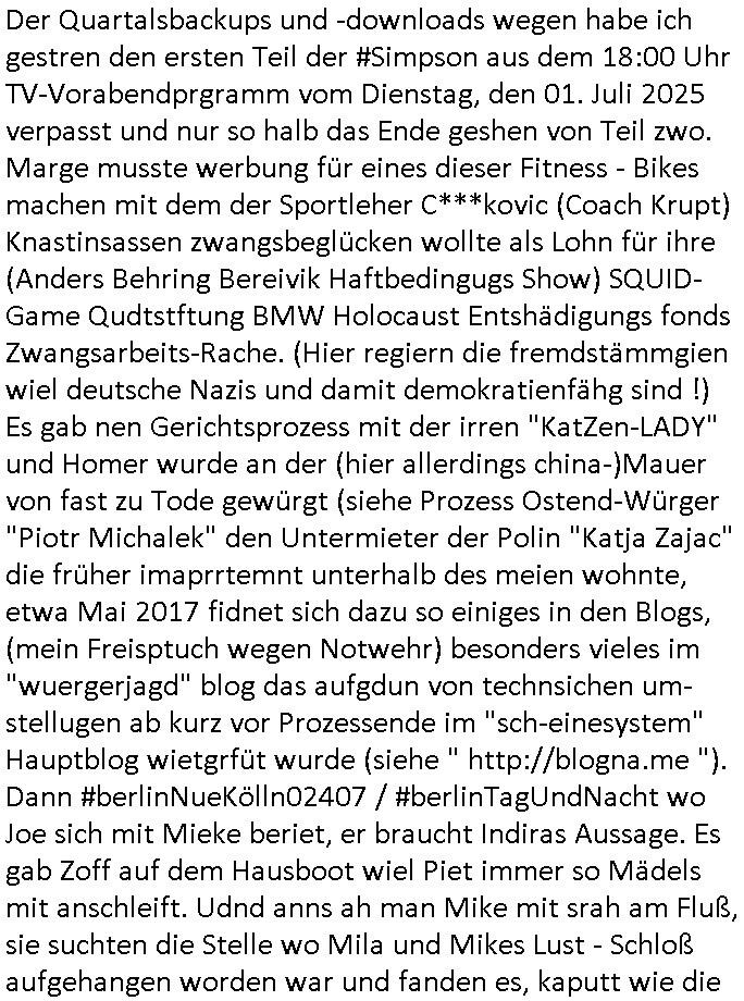 | Der Quartalsbackups und -downloads wegen habe ich gestren den ersten Teil der #Simpson aus dem 18:00 Uhr TV-Vorabendprgramm vom Dienstag, den 01. Juli 2025 verpasst und nur so halb das Ende geshen von Teil zwo. Marge musste werbung für eines dieser Fitness - Bikes machen mit dem der Sportleher C***kovic (Coach Krupt) Knastinsassen zwangsbeglücken wollte als Lohn für ihre (Anders Behring Bereivik Haftbedingugs Show) SQUID- Game Qudtstftung BMW Holocaust Entshädigungs fonds Zwangsarbeits-Rache. (Hier regiern die fremdstämmgien wiel deutsche Nazis und damit demokratienfähg sind !) Es gab nen Gerichtsprozess mit der irren "KatZen-LADY" und Homer wurde an der (hier allerdings china-)Mauer von fast zu Tode gewürgt (siehe Prozess Ostend-Würger "Piotr Michalek" den Untermieter der Polin "Katja Zajac" die früher imaprrtemnt unterhalb des meien wohnte, etwa Mai 2017 fidnet sich dazu so einiges in den Blogs, (mein Freisptuch wegen Notwehr) besonders vieles im "wuergerjagd" blog das aufgdun von technsichen um-stellugen ab kurz vor Prozessende im "sch-einesystem" Hauptblog wietgrfüt wurde (siehe " http://blogna.me "). Dann #berlinNueKölln02407 / #berlinTagUndNacht wo Joe sich mit Mieke beriet, er braucht Indiras Aussage. Es gab Zoff auf dem Hausboot wiel Piet immer so Mädels mit anschleift. Udnd anns ah man Mike mit srah am Fluß, sie suchten die Stelle wo Mila und Mikes Lust - Schloß aufgehangen worden war und fanden es, kaputt wie die
