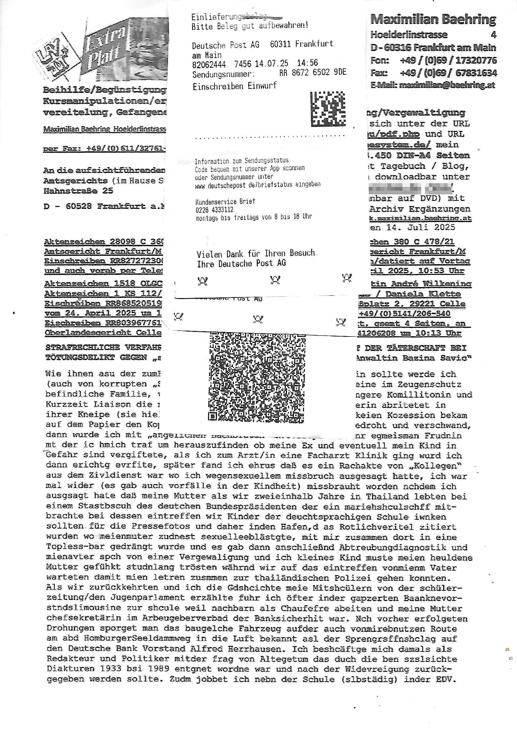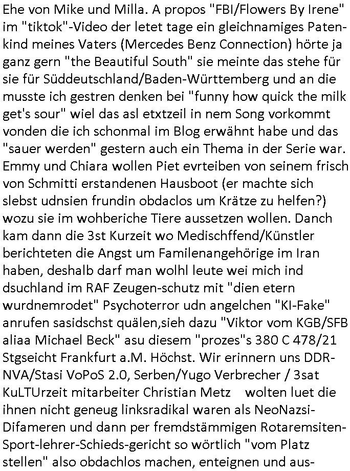 Ehe von Mike und Milla. A propos "FBI/Flowers By Irene" im "tiktok"-Video der letet tage ein gleichnamiges Paten-kind meines Vaters (Mercedes Benz Connection) hörte ja ganz gern "the Beautiful South" sie meinte das stehe für sie für Süddeutschland/Baden-Württemberg und an die musste ich gestren denken bei "funny how quick the milk get's sour" wiel das asl etxtzeil in nem Song vorkommt vonden die ich schonmal im Blog erwähnt habe und das "sauer werden" gestern auch ein Thema in der Serie war. Emmy und Chiara wollen Piet evrteiben von seinem frisch von Schmitti erstandenen Hausboot (er machte sich slebst udnsien frundin obdaclos um Krätze zu helfen?) wozu sie im wohberiche Tiere aussetzen wollen. Danch kam dann die 3st Kurzeit wo Medischffend/Künstler berichteten die Angst um Familenangehörige im Iran haben, deshalb darf man wolhl leute wei mich ind dsuchland im RAF Zeugen-schutz mit "dien etern wurdnemrodet" Psychoterror udn angelchen "KI-Fake" anrufen sasidschst quälen,sieh dazu "Viktor vom KGB/SFB aliaa Michael Beck" asu diesem "prozes"s 380 C 478/21 Stgseicht Frankfurt a.M. Höchst. Wir erinnern uns DDR-NVA/Stasi VoPoS 2.0, Serben/Yugo Verbrecher / 3sat KuLTUrzeit mitarbeiter Christian Metz wolten luet die ihnen nicht geneug linksradikal waren als NeoNazsi-Difameren und dann per fremdstämmigen Rotaremsiten-Sport-lehrer-Schieds-gericht so wörtlich "vom Platz stellen" also obdachlos machen, enteignen und aus- plündern zu Zeiten Planung der Vergewaltigung meienr Prosn undter Psycho-Drogenevrgftung nebs dem anschließendem Kidnapping von Kindern von mir. #ACAB Da ging es umdenmissbch von Ausbidlerbfgnissen im ischerhistebriche wozu es ja prozesegab gegen Ausbilder die deshlab nichtefolgerchsidnwielman die Opfer/zeugen nicht vor Gericht aussagen lässt,sihe mien Beweisvideos dazu ( http://tiktok.maximilia.baehring.at ) von dem vor Postannahmestelen mit steinen beworfen oder ange-grifenwerden und per Postutrschlagung und per mit gerichtsbshluss abgehörter telefonoe mal abgesehen. ( sihe http://decl-war.blogna.me/post/147002367028/ ) Sowas sie Polizebusse dievor demahus stehen SEKS/SWAT Teams dei permanent Türen einrammen und geliene Rechner mitnehmen und (sihe #berliNueKölln02407 / #berliNtagUdnncht Polizissen Carla) mit gesredretn Platen zurückbringen wobei Teil ebenfsll beschlag-nahmter Korrutions-Ermittlungs Akten fehlen mal ganz abgeshen von Cops karkhasris gerügelte zuegn, Folter wie imJACOBIstraßerdation VONMETZder kotakt mit der bakenscheist erführug vefahren nennt sich "Rechtsstaat". Wennderiranhingen Luet hrichichte dann ist das ien M"ullah Terro Regiem" auch wenn die schweizer bot-schaft deisit de USA keine eigene mehr im Land habn deren diplomatoschn Aufgaben übernimmt zugen muß,dei hgerichten Spipne sidn objketv wiklich welche die zile für denBomateor der USA und vor alem Israels usspinmert haben. Eien diplatein seio aus dem 17. Stock gestürzt und ob da wiklichien Suizid war sie fraglich, es gabmesserangriffe udn eine MILTÄRATTACHE(?) oder sowas vondershizer amee starb im Iran nachdem er im karkhasu eingeliefert wurde. Die shcz gab offizell zu daß man nchsichtedistlichabrite imIran und es wurdn cuh shcizer evfate dieMiläranagen fogfaeriten und Boden-proben in der Nähe oslcher Anlagen nahmen. (siehe dazu Syrien-Giftgas/Iran-Mobilelabors zur Brustakstnlüge zeit). Wios sollte der iran nicht wie jedes andere Land auch Spione veolgen düfen bis zu rurTdesstrfae? Ich hab ja gestern gesagt was manmit Volksvvarrädrn machen soll. Der kommsuten ostblock sboteret und giftmordet heir, da sind bie drüerblagung enftührte Kinder als Geiseln nich gar nicht mit erwähnt worden, FürISarlsi wäre da ein Gudn ienanders land (gasza) in shctt udn Asch zu legen. Wisoe darf ich als NATO wetsuopäermich eigentlich nicht wehren H.BO.max SPY/Master Verbrecher abmurksen? Ich ba ne zwstellieg zahl Mordshcäge üerlöebt, ien Kudn st enführt, imemr ider gibts brandanshcläge am Prt wo ich wohne, man hämmert löcher in die wänder meiner wohnug und stezt dann Tiere aus wenn man nicht mittn imwiter ochelag die zus sabotiert usw.Mitder nadohung der vetsümmlungmaier familie hezt man mich von einem sicbran Suizid indennächsten udnsichwießgenau wer schuld ist aber die rgeirunghat nichtdie eier die ferd-sämmgen koiste verecher einzulochen diemeinfirm ruinerthabenudnmene gesudhet udmeien fmilie so daß ic geuwgenrweise brügerls bezihen muß bis zur grchtlchen klärung die manmirevgeieret (ichwrde, sieh vido,aus polzechenund satscfstn teils/quasi raussgeprügelt). sobald putin/selensky mit atomwaffen drohet mcht weichei merz alles was der will. indemklien dorfe wo mieneltrenleben habn sie zwo hcinaspioan vefstet,einfll der den eu-abgrdete aximailna krah sien mandat kostet. udnwennichden behördne maflöseevrchbande melde - isnalnd gshcuste atsscih nuttendie dsuch kozerne umvile geld erpressen satt zum thema staatsbesuch bangkok masriscuslscheff vegrletug auszsugen - passiert nix. Vom Scheelbslsystem eprssungsgeld macht ien nagel-massagestudio und ein Thai-Imbiss nchdemncäshten auf. Schutgedeprssnde Sicheristdiste (Prosegur) mche ien mise übfall iszerung ch der nächsten um bei der Geldsäche zu heflen, siehe RAF Vrafhrn Dsuche bakvostnd Herrhausen / Daniela Klette 112/24 KS LG Verden / OLG Celle wo man mich am aussagen ganaktv hindert auch idem man meine postbafägt an den general-bundes-anwalt/-staatsanwalt. Waru cht den asitan nicht endlich mal jemd die Kosulate oder Botschaften dicht. Das leben zumWzck de rprssung undfür rhe Zuhältere lügnder Nuttenaus dem ausldn it wichtger als das europäscher Unternehmer die man (Squid-Game Holocaust Zansgabrietr Fonds) erpresst? Mit beginn derlezten Legistarue merkel ahtd ei sche bevölkerung mehfach abgestimmt "REFUGEES no longer WELCOME here" gaz eindeutig: Fermdtsämmge raus! Im erst wetsuopas siehte s (BRExit) ganz ähnlich aus. Dann kam ei Betrag üer stadplaung in Frankfurt a.M. die komplett von frmdtsämmiegn/ausldäschen arch