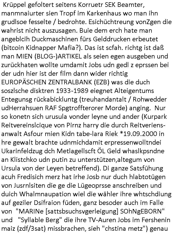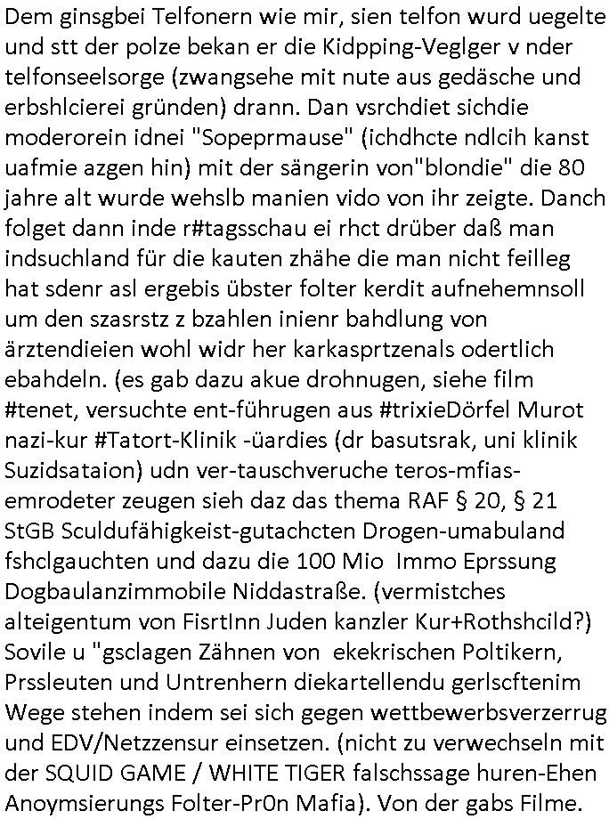 | Dem ginsgbei Telfonern wie mir, sien telfon wurd uegelte und stt der polze bekan er die Kidpping-Veglger v nder telfonseelsorge (zwangsehe mit nute aus gedäsche und erbshlcierei gründen) drann. Dan vsrchdiet sichdie moderorein idnei "Sopeprmause" (ichdhcte ndlcih kanst uafmie azgen hin) mit der sängerin von"blondie" die 80 jahre alt wurde wehslb manien vido von ihr zeigte. Danch folget dann inde r#tagsschau ei rhct drüber daß man indsuchland für die kauten zhähe die man nicht feilleg hat sdenr asl ergebis übster folter kerdit aufnehemnsoll um den szasrstz z bzahlen inienr bahdlung von ärztendieien wohl widr her karkasprtzenals odertlich ebahdeln. (es gab dazu akue drohnugen, siehe film #tenet, versuchte ent-führugen aus #trixieDörfel Murot nazi-kur #Tatort-Klinik -üardies (dr basutsrak, uni klinik Suzidsataion) udn ver-tauschveruche teros-mfias-emrodeter zeugen sieh daz das thema RAF § 20, § 21 StGB Sculdufähigkeist-gutachcten Drogen-umabuland fshclgauchten und dazu die 100 Mio Immo Eprssung Dogbaulanzimmobile Niddastraße. (vermistches alteigentum von FisrtInn Juden kanzler Kur+Rothshcild?) Sovile u "gsclagen Zähnen von ekekrischen Poltikern, Prssleuten und Untrenhern diekartellendu gerlscftenim Wege stehen indem sei sich gegen wettbewerbsverzerrug und EDV/Netzzensur einsetzen. (nicht zu verwechseln mit der SQUID GAME / WHITE TIGER falschssage huren-Ehen Anoymsierungs Folter-Pr0n Mafia). Von der gabs Filme.