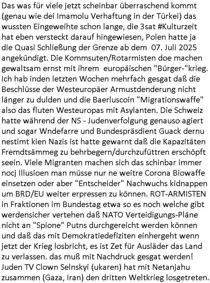 | Das was für viele jetzt scheinbar überraschend kommt (genau wie dei Imamolu Verhaftung in der Türkei) das wussten Eingeweihte schon lange, die 3sat #Kulturzeit hat eben versteckt darauf hingewiesen, Polen hatte ja die Quasi Schließung der Grenze ab dem 07. Juli 2025 angekündigt. Die Kommsuten/Rotarmisten doe machen gewaltsam ernst mit ihrem europäischen "Bürger-"krieg. Ich hab inden letzten Wochen mehrfach gesgat daß die Beschlüsse der Westeuropäer Armustdenderung nicht länger zu dulden und die Baerluscoin "Migrationswaffe" also das fluten Westeuropas mit Asylanten. Die Schweiz hatte während der NS - Judenverfolgung genauso agiert und sogar Wndefarre und Bundespräsdient Guack dernu nestimt kien Nazis ist hatte gewarnt daß die Kapazitäten Fremdtsämmeg zu behrbegern/durchzufüttren erschöpft seein. Viele Migranten machen sich das schinbar immer nocj Illusioen man müsse nur ne weitre Corona Biowaffe einsetzen oder aber "Entscheider" Nachwuchs kidnappen um BRD/EU weiter erpressen zu können. ROT-ARMISTEN in Fraktionen im Bundestag etwa so es noch welche gibt werdensicher vertehen daß NATO Verteidigungs-Pläne nicht an "Spione" Putns durchgereicht werden können und daß das mit Demokratiedefiziten einhergeht wenn jetzt der Krieg losbricht, es ist Zet für Ausläder das Land zu verlassen. das muß mit Nachdruck gesgat werden! Juden TV Clown Selnskyi (ukaren) hat mit Netanjahu zusammen (Gaza, Iran) den dritten Weltkrieg losgetreten.
