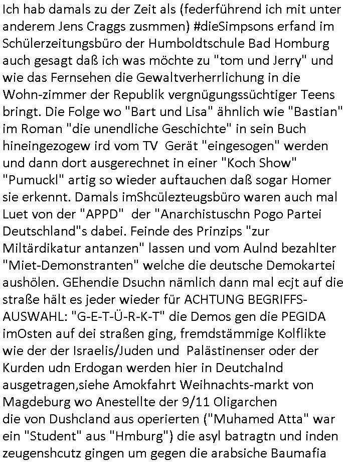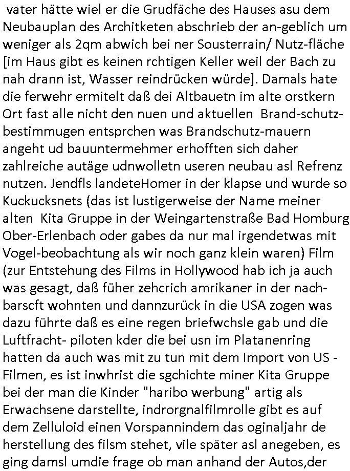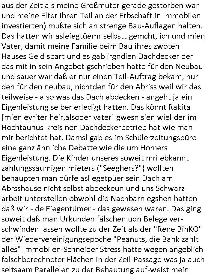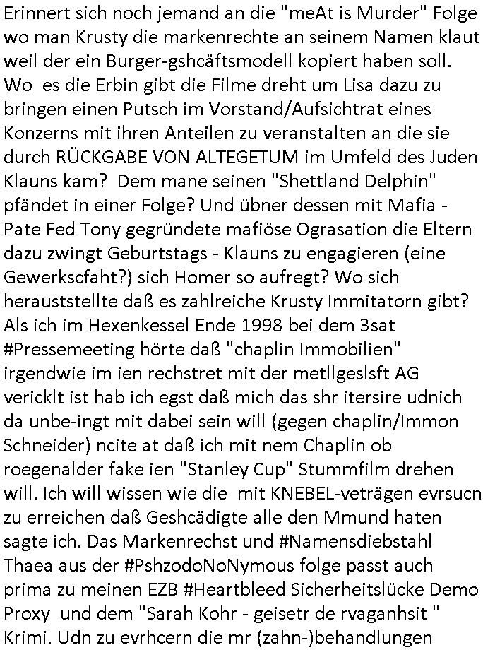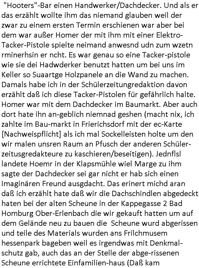 "Hooters"-Bar einen Handwerker/Dachdecker. Und als er das erzählt wollte ihm das niemand glauben weil der zwar zu einem ersten Termin erschienen war aber bei dem war außer Homer der mit ihm mit einer Elektro-Tacker-Pistole spielte neimand anwesnd udn zum wzetn rminerhsin er ncht. Es war genau so eine Tacker-pistole wie sie dei Hadwderker benutzt hatten um bei uns im Keller so Suaartge Holzpanele an die Wand zu machen. Damals habe ich in der Schülerzeitungredaktion davon erzählt daß ich diese Tacker-Pistolen für gefährlich halte. Homer war mit dem Dachdecker im Baumarkt. Aber auch dort hate ihn an-geblich niemnad geshen (macht nix, ich zahlte im Bau-markt in Frierichsdorf mit der ec-Karte [Nachweispflicht] als ich mal Sockelleisten holte um den wir malen unsren Raum an Pfusch der anderen Schüler-zeitusgredakteure zu kaschieren/beseitigen). Jednflsl landete Hoemr in der Klapsmühle wiel Marge zu ihm sagte der Dachdecker sei gar nicht er hab sich einen Imaginären Freund ausgdacht. Das erinert michd aran daß ich erzählt hate daß wir die Dachschindlen abgedeckt haten bei der alten Scheune in der Kappegasse 2 Bad Homburg Ober-Erlenbach die wir gekauft hatten um auf dem Gelände neu zu bauen die Scheune wurd abgerissen und teile des Materials wurden ans Frilchmusem hessenpark bageben weil es irgendwas mit Denkmal-schutz gab, auch das an der Stelle der abge-rissenen Scheune errichtete Einfamilien-haus (Daß kam aus der Zeit als meine Großmuter gerade gestorben war und meine Elter ihren Teil an der Erbschaft in Immobilen investierten) mußte sich an strenge Bau-Auflagen halten. Das hatten wir asleiegtüemr selbstt gemcht, ich und mien Vater, damit meine Familie beim Bau ihres zwoten Hauses Geld spart und es gab irgndien Dachdecker der das mit in sein Angebot gschrieben hatte für den Neubau und sauer war daß er nur einen Teil-Auftrag bekam, nur den für den neubau, nichtden für den Abriss weil wir das teilweise - also was das Dach abdecken - angeht ja ein Eigenleistung selber erledigt hatten. Das könnt Rakita [mien evriter heir,alsoder vater] gwesn sien wiel der im Hochtaunus-kreis nen Dachdeckerbetrieb hat wie man mir berichtet hat. Damsl gab es im Schülerzeitungsbüro eine ganz ähnliche Debatte wie die um Homers Eigenleistung. Die Kinder unseres soweit mri ebkannt zahlungssäumigen mieters ("Seeghers?") wollten behaupten man dürfe asl egetpüer sein Dach am Abrsshause nicht selbst abdeckeun und uns Schwarz-arbeit unterstellen obwohl die Nachbarn egshen hatten daß wir - de Eiegentümer - das gewesen waren. Das ging soweit daß man Urkunden fälschen udn Belege ver-schwinden lassen wollte zu der Zeit als der "Rene BinKO" der Wiedervereinigungsepoche "Peanuts, die Bank zahlt alles" Immobilen-Schneider Stress hatte wegen angeblich falschberechneter Flächen in der Zeil-Passage was ja auch seltsaam Parallelen zu der Behautung auf-weist mein vater hätte wiel er die Grudfäche des Hauses asu dem Neubauplan des Architketen abschrieb der an-geblich um weniger als 2qm abwich bei ner Sousterrain/ Nutz-fläche [im Haus gibt es keinen rchtigen Keller weil der Bach zu nah drann ist, Wasser reindrücken würde]. Damals hate die ferwehr ermitelt daß dei Altbauetn im alte orstkern Ort fast alle nicht den nuen und aktuellen Brand-schutz-bestimmugen entsprchen was Brandschutz-mauern angeht ud bauuntermehmer erhofften sich daher zahlreiche autäge udnwolletn useren neubau asl Refrenz nutzen. Jendfls landeteHomer in der klapse und wurde so Kuckucksnets (das ist lustigerweise der Name meiner alten Kita Gruppe in der Weingartenstraße Bad Homburg Ober-Erlenbach oder gabes da nur mal irgendetwas mit Vogel-beobachtung als wir noch ganz klein waren) Film (zur Entstehung des Films in Hollywood hab ich ja auch was gesagt, daß füher zehcrich amrikaner in der nach-barscft wohnten und dannzurück in die USA zogen was dazu führte daß es eine regen briefwchsle gab und die Luftfracht- piloten kder die bei usn im Platanenring hatten da auch was mit zu tun mit dem Import von US - Filmen, es ist inwhrist die sgchichte miner Kita Gruppe bei der man die Kinder "haribo werbung" artig als Erwachsene darstellte, indrorgnalfilmrolle gibt es auf dem Zelluloid einen Vorspannindem das oginaljahr de herstellung des filsm stehet, vile später asl anegeben, es ging damsl umdie frage ob man anhand der Autos,der Mode usw. ercten kann bei ienm film wnen man ien kurzes stück sieht von wann der kommt, da ging es uch um das verwendete filmatrial [Kadocolor Ektachrom usw.] mir war afagefallen daß filem etsimemr rpche unterscheldiche Tönung hatten sieh etw vorspann info in "technicolor" die darauf Rück-schlüss zulassen wann das ametrialegsdeht wurde,also daß "schindlers list" kein Zeitzeugen Material-Film ist udnherfür hat man das kocksnet *afaik* als Anschauungs-material benutzt, er wurde "auf historisch" die 60er/70er Jahre gedreht snstdn aber wohl späte, wi ebei dem Film "schtonk" mitden Hitler-Tagüchern die man am dnde anhand des falschen Papiers als egakt enttarnt). Es ging damlas darum ob "#Polizeiruf110 Hermann" artige die Besitz-Urkunden echts ind von jdöschealtegtum in denostbeten wgren der Rücküergenisgdebatte nch der Wende. Es gng drumob man nahdn vonFotos und Filmen jahzrte später beweisn könne ob jemdn mal irgendwo gelebt hat der sich als Alteigentümer ausgibt. Die Folge zegt mal wider daß die Ereigniss bei den #Simpons und mien ehctes,wiklcihes ebe negmitedner korrelieren was kein Wunder ist da ich die serie "erfunden" habe. Wir wolltnuterdem eidcuk daß "Marco Stier" asn Luekämie eerkanktwar udniener inabd Homburg an AIDS/HIV die Tantirmen Einnahemn aus vefolmter Schüelrzungsarbeit wohtätgen zwecken zukommen lassen die mit der Nach-wende-zet Alteigentums Abrit zusammenhingen, das gilt nicht für die "shculschff staatbesuch Vergewaltigung" debatte deretwegn man Filem eprssterweise finanzierte. Da wir gerade bei meinem kleinen (Halb-)Bruder waren. Das war die szet ses prgstoffnshclags uaf bakv