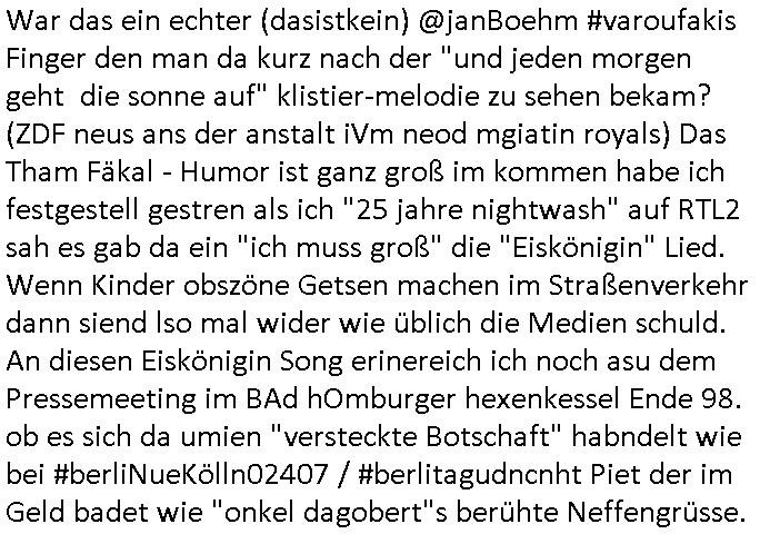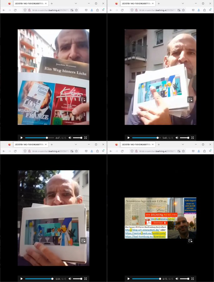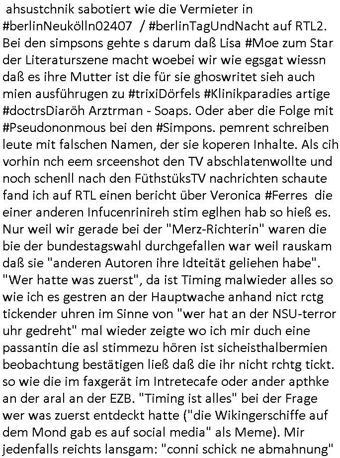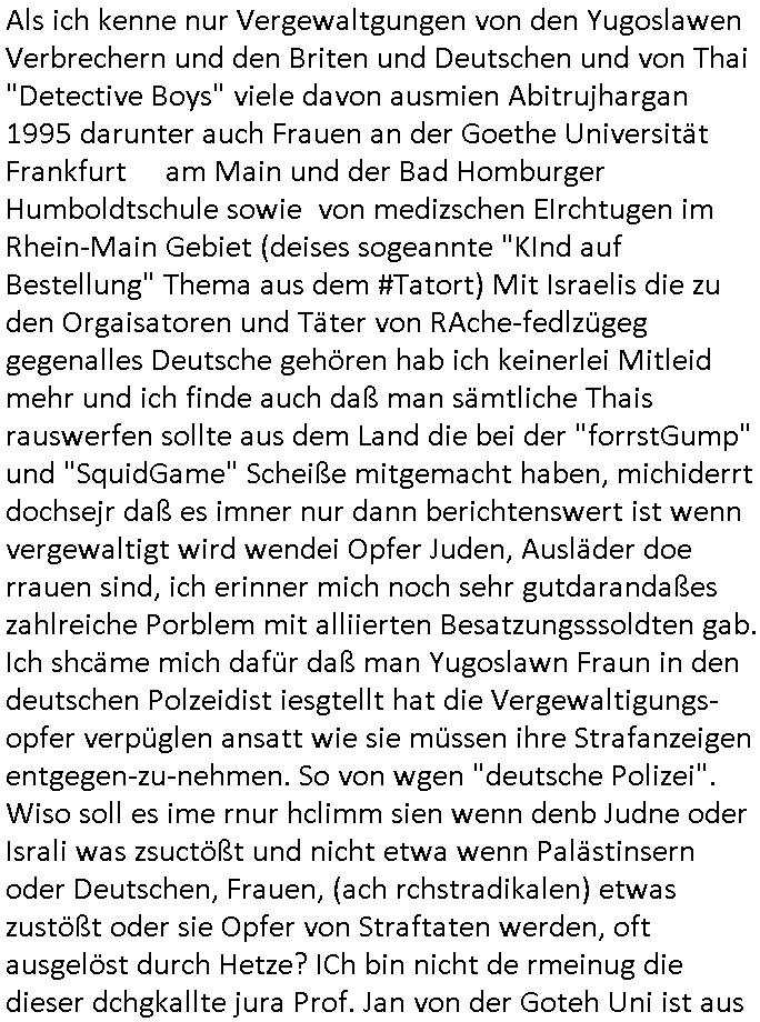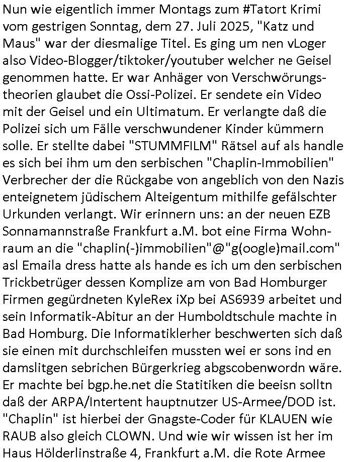 | Nun wie eigentlich immer Montags zum #Tatort Krimi vom gestrigen Sonntag, dem 27. Juli 2025, "Katz und Maus" war der diesmalige Titel. Es ging um nen vLoger also Video-Blogger/tiktoker/youtuber welcher ne Geisel genommen hatte. Er war Anhäger von Verschwörungs-theorien glaubet die Ossi-Polizei. Er sendete ein Video mit der Geisel und ein Ultimatum. Er verlangte daß die Polizei sich um Fälle verschwundener Kinder kümmern solle. Er stellte dabei "STUMMFILM" Rätsel auf als handle es sich bei ihm um den serbischen "Chaplin-Immobilien" Verbrecher der die Rückgabe von angeblich von den Nazis enteignetem jüdischem Alteigentum mithilfe gefälschter Urkunden verlangt. Wir erinnern uns: an der neuen EZB Sonnamannstraße Frankfurt a.M. bot eine Firma Wohn-raum an die "chaplin(-)immobilien"@"g(oogle)mail.com" asl Emaila dress hatte als hande es ich um den serbischen Trickbetrüger dessen Komplize am von Bad Homburger Firmen gegürdneten KyleRex iXp bei AS6939 arbeitet und sein Informatik-Abitur an der Humboldtschule machte in Bad Homburg. Die Informatiklerher beschwerten sich daß sie einen mit durchschleifen mussten wei er sons ind en damslitgen sebrichen Bürgerkrieg abgscobenwordn wäre. Er machte bei bgp.he.net die Statitiken die beeisn solltn daß der ARPA/Intertent hauptnutzer US-Armee/DOD ist. "Chaplin" ist hierbei der Gnagste-Coder für KLAUEN wie RAUB also gleich CLOWN. Und wie wir wissen ist her im Haus Hölderlinstraße 4, Frankfurt a.M. die Rote Armee