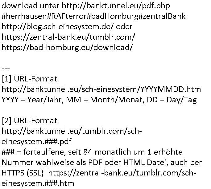 http://banktunnel.eu/sch-einesystem/20250702.htm ([1] auch als PDF-Datei (sch-einesystem.163) ([2] zum download unter http://banktunnel.eu/pdf.php #herrhausen#RAFterror#badHomburg#zentralBank http://blog.sch-einesystem.de/ oder https://zentral-bank.eu/tumblr.com/ https://bad-homburg.eu/download/ http://blogna.me/ --- [1] URL-Format http://banktunnel.eu/sch-einesystem/YYYYMMDD.htm YYYY = Year/Jahr, MM = Month/Monat, DD = Day/Tag [2] URL-Format http://banktunnel.eu/tumblr.com/sch-einesystem.###.pdf ### = fortaulfene, seit 84 monatlich um 1 erhöhte Nummer wahlweise als PDF oder HTML Datei, auch per HTTPS (SSL) https://zentral-bank.eu/tumblr.com/sch-einesystem.###.htm | |