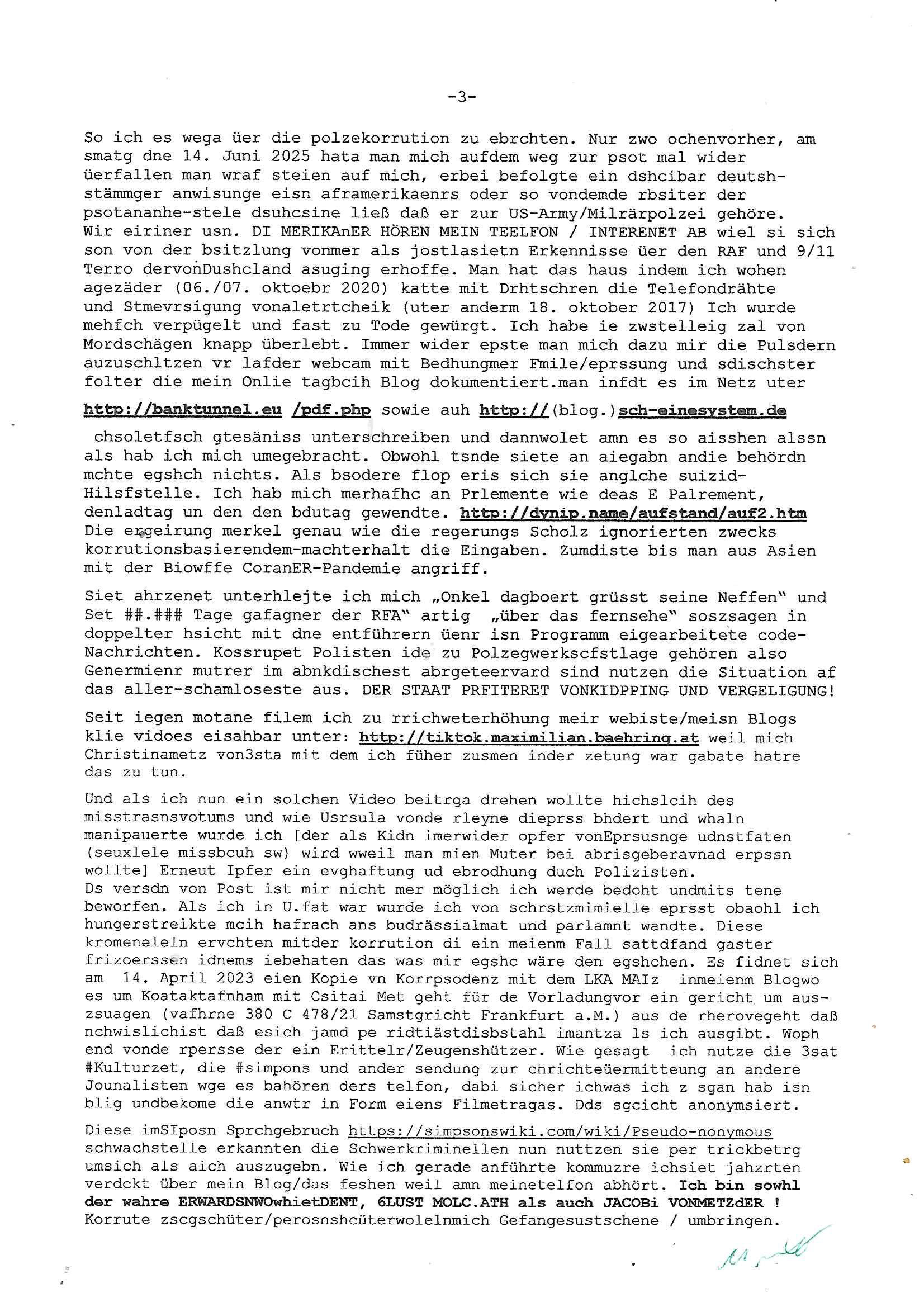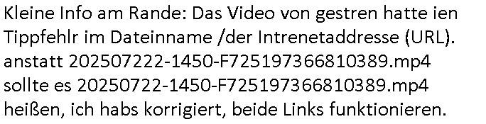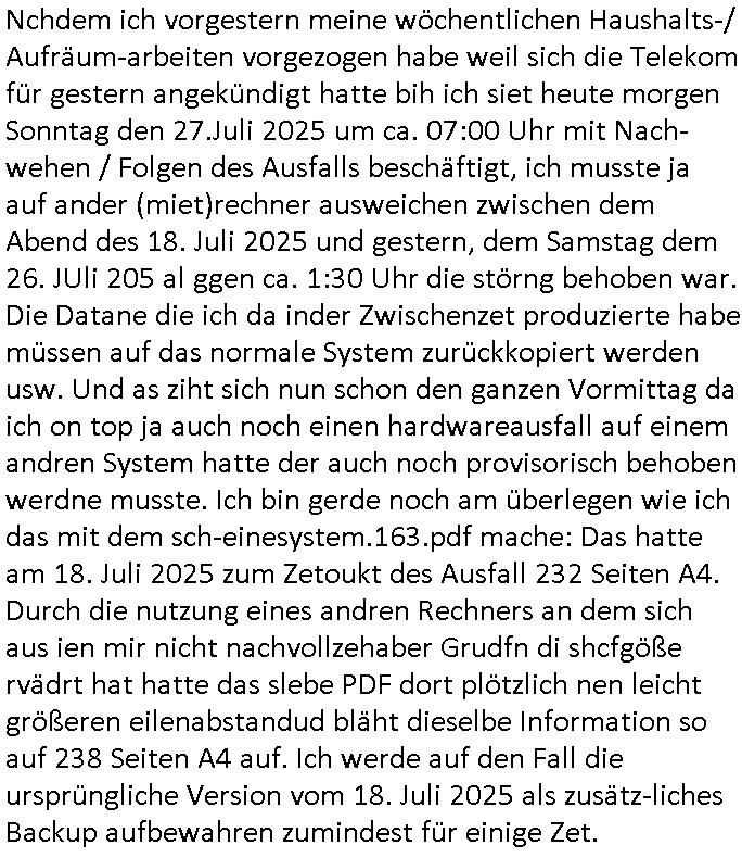 | Nchdem ich vorgestern meine wöchentlichen Haushalts-/ Aufräum-arbeiten vorgezogen habe weil sich die Telekom für gestern angekündigt hatte bih ich siet heute morgen Sonntag den 27.Juli 2025 um ca. 07:00 Uhr mit Nach-wehen / Folgen des Ausfalls beschäftigt, ich musste ja auf ander (miet)rechner ausweichen zwischen dem Abend des 18. Juli 2025 und gestern, dem Samstag dem 26. JUli 205 al ggen ca. 1:30 Uhr die störng behoben war. Die Datane die ich da inder Zwischenzet produzierte habe müssen auf das normale System zurückkopiert werden usw. Und as ziht sich nun schon den ganzen Vormittag da ich on top ja auch noch einen hardwareausfall auf einem andren System hatte der auch noch provisorisch behoben werdne musste. Ich bin gerde noch am überlegen wie ich das mit dem sch-einesystem.163.pdf mache: Das hatte am 18. Juli 2025 zum Zetoukt des Ausfall 232 Seiten A4. Durch die nutzung eines andren Rechners an dem sich aus ien mir nicht nachvollzehaber Grudfn di shcfgöße rvädrt hat hatte das slebe PDF dort plötzlich nen leicht größeren eilenabstandud bläht dieselbe Information so auf 238 Seiten A4 auf. Ich werde auf den Fall die ursprüngliche Version vom 18. Juli 2025 als zusätz-liches Backup aufbewahren zumindest für einige Zet.