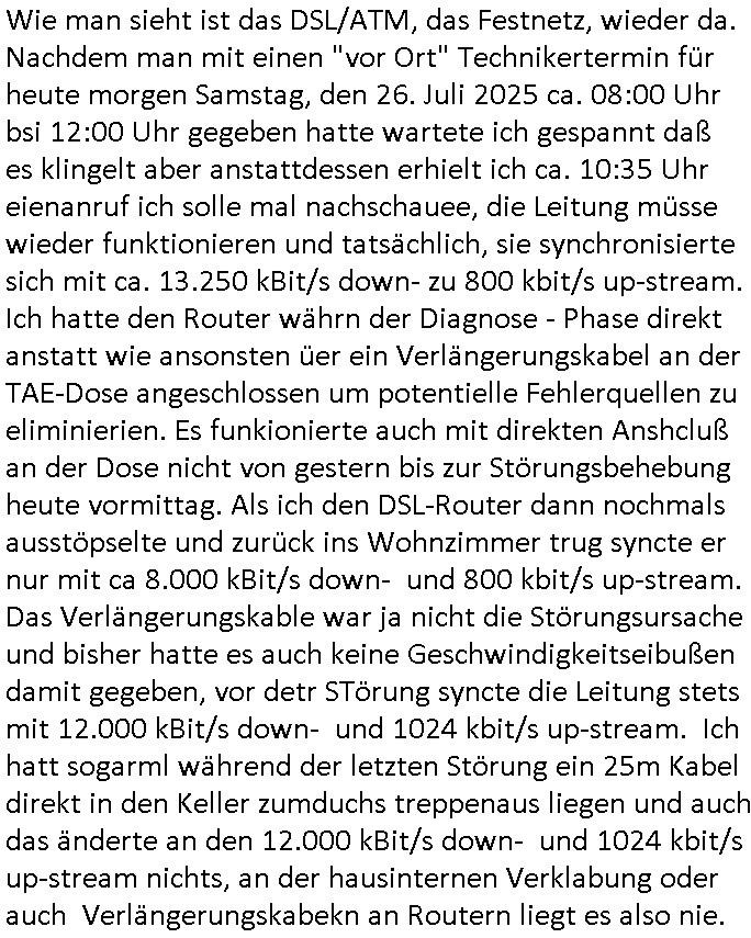 | Wie man sieht ist das DSL/ATM, das Festnetz, wieder da. Nachdem man mit einen "vor Ort" Technikertermin für heute morgen Samstag, den 26. Juli 2025 ca. 08:00 Uhr bsi 12:00 Uhr gegeben hatte wartete ich gespannt daß es klingelt aber anstattdessen erhielt ich ca. 10:35 Uhr eienanruf ich solle mal nachschauee, die Leitung müsse wieder funktionieren und tatsächlich, sie synchronisierte sich mit ca. 13.250 kBit/s down- zu 800 kbit/s up-stream. Ich hatte den Router währn der Diagnose - Phase direkt anstatt wie ansonsten üer ein Verlängerungskabel an der TAE-Dose angeschlossen um potentielle Fehlerquellen zu eliminierien. Es funkionierte auch mit direkten Anshcluß an der Dose nicht von gestern bis zur Störungsbehebung heute vormittag. Als ich den DSL-Router dann nochmals ausstöpselte und zurück ins Wohnzimmer trug syncte er nur mit ca 8.000 kBit/s down- und 800 kbit/s up-stream. Das Verlängerungskable war ja nicht die Störungsursache und bisher hatte es auch keine Geschwindigkeitseibußen damit gegeben, vor detr STörung syncte die Leitung stets mit 12.000 kBit/s down- und 1024 kbit/s up-stream. Ich hatt sogarml während der letzten Störung ein 25m Kabel direkt in den Keller zumduchs treppenaus liegen und auch das änderte an den 12.000 kBit/s down- und 1024 kbit/s up-stream nichts, an der hausinternen Verklabung oder auch Verlängerungskabekn an Routern liegt es also nie.