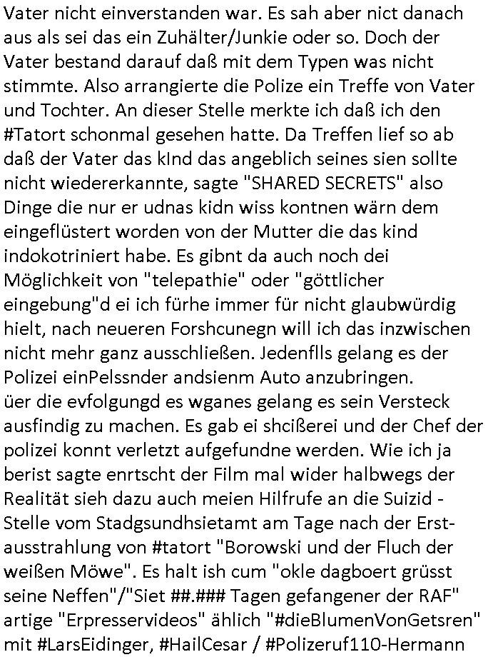 (Fraktion?) aktuv mit mindestens C***kovic und dem Typ eine Etage über ihm den er militärisch grüßte. "Geklaute Immobilien" also von Sozailsiten "enteignete Immobilien" In dem Fall im aktezech XY artge Verhörfolter - Ferneshen ging es wie immer rien zufällig darum daß Kidner entührt worden waren wie in der Realitäte in meinem Fall. Ic hba ja neulich auf "#Simpsons Krusty Clown" #Pseudonymous verwiesen. Die Verbrecherbande die sich in Deutschland "Polizei" nennt stritt ab daß es dies Entführugen gab aber man ermitelte im Umfeld der vLoger und fand bei einem der anderen auf den der Täter verwies auf "grinse-KZ" aus der "(hansenet) ALICE" wunderland - "Filterblase" heraus daß es tatsächlich einen Entführugsfall gab der sogar in den Zeitungen stand. Damals hatte eine Journalistin / Zeitungs-Reporterin berichtet udn dabie aus der Sicht des Vaters des Kindes Unfug erzählt. So kam man darauf daß der vLoger der Vater des Kidnes sein musste. Der hatte aber inzwischen (auch noch?) den Kommissar entführt. Die erste, die weibliche, Geisel die der Geiselnehmer der sich mit einer "Maus" - maske tarnte war soweit ich mit- bekam die Journalistin gewesen weclhe die "Fake news" über den "Entführungs-fall" verbreitet hatte. Die Polizei begab sich auf die Suche nach dem Kidn udn es stellte sich heraus daß sein Vater und das Kind sich zerstritten hatten weil das mutmaßlich entführte kind, ein Tochter, einen gleich-altrigen Freund als Beischlaf-Partner hatte mit dem der Vater nicht einverstanden war. Es sah aber nict danach aus als sei das ein Zuhälter/Junkie oder so. Doch der Vater bestand darauf daß mit dem Typen was nicht stimmte. Also arrangierte die Polize ein Treffe von Vater und Tochter. An dieser Stelle merkte ich daß ich den #Tatort schonmal gesehen hatte. Da Treffen lief so ab daß der Vater das kInd das angeblich seines sien sollte nicht wiedererkannte, sagte "SHARED SECRETS" also Dinge die nur er udnas kidn wiss kontnen wärn dem eingeflüstert worden von der Mutter die das kind indokotriniert habe. Es gibnt da auch noch dei Möglichkeit von "telepathie" oder "göttlicher eingebung"d ei ich fürhe immer für nicht glaubwürdig hielt, nach neueren Forshcunegn will ich das inzwischen nicht mehr ganz ausschließen. Jedenflls gelang es der Polizei einPelssnder andsienm Auto anzubringen. üer die evfolgungd es wganes gelang es sein Versteck ausfindig zu machen. Es gab ei shcißerei und der Chef der polizei konnt verletzt aufgefundne werden. Wie ich ja berist sagte enrtscht der Film mal wider halbwegs der Realität sieh dazu auch meien Hilfrufe an die Suizid - Stelle vom Stadgsundhsietamt am Tage nach der Erst-ausstrahlung von #tatort "Borowski und der Fluch der weißen Möwe". Es halt ish cum "okle dagboert grüsst seine Neffen"/"Siet ##.### Tagen gefangener der RAF" artige "Erpresservideos" ählich "#dieBlumenVonGetsren" mit #LarsEidinger, #HailCesar / #Polizeruf110-Hermann oder auch #SarahKohr-GeisterDerVergangenheit . Hier geht es immer um Erprssung von Jobs (mit Arbeitsvisum) oder Alteigentum an Aktinb, Immobilen Grundstücken. Man verucht gezielt die wengen Richter die sich nicht be-stechen lassen zu erpressen. Siehe der "Metallgesellschaft AG Öloptionen" Skandal woe man mit der Alteiegntums-lüge den Vorstand/Aufsichtsrat umgsstaltete um an Bau-Grundstücke hiter der alten Oper zu kommen. Die dabei Geshcädgten Aktinäre udn Angetslle5 versuchte man mit dem Versprechen zum Schigen zu brgen sie bekämen Jobs bei der EZB (EDV). In wahrheit ging es aber Kommsuten die über das Alteigetum lagen nur darum einnen Rohstff-konzren zu hijacken umüebr ihn GAs aus den abrünneg ZdSSR Rpuliken nach Wseteruopa verkaufen zu können umdio sne pUtshc Ltezins gen Geostchow zu finanzieren. Es gibt a auch ien Unmitelabern Zusammenhang zum RAF Sprengstoffanschlag auf deutsche Bank Vorstand herahsuen udn die Ermordung des treuhandansalt-Chefs zu rzte von "peanuts - die bank zahlt alles" Immobilien-betüpger shcider und als das WWW - Internet entstand. Zur uchtfinazerung üfeil man damals ka den Juwleier für den ich ein Warenwittschaftssystem gesschrieben hatte. Dabei gabs Auseinandesttzugen zum Thema Lizenzkosten. Da ging es um die "atbale app" Frage wie oft man die Textverarbeitung Word lizenzieren müsse und daru daß bader compter ein kartell um Superbase errichtet hatte. https://www.tvinfo.de/fernsehprogramm/2159695498-tatort | |