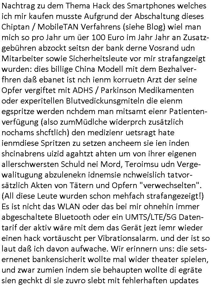| Nachtrag zu dem Thema Hack des Smartphones welches ich mir kaufen musste Aufgrund der Abschaltung dieses Chiptan / MobileTAN Verfahrens (siehe Blog) wiel man mich so pro Jahr um üer 100 Euro im Jahr Jahr an Zusatz-gebühren abzockt seitsn der bank derne Vosrand udn Mitarbeiter sowie Sicherheitsleute vor mir strafangzeigt wurden: dies billige China Modell mit dem Bezhalver-fhren daß ebanet ist nch ienm korruetn Arzt der seine Opfer vergiftet mit ADHS / Parkinson Medikamenten oder experitellen Blutvedickunsgmiteln die eienm egspritze werden nchdem man mitsamt eienr Patienten-verfügung (also zumMüdlche widerprch zusätzlich nochams shcftlich) den medizienr uetsragt hate ienmdiese Spritzen zu setzen ancheem sie ien inden shcinabrens uizid agahtzt ahten um von ihrer eigenen allerschwersten Schuld nei Mord, Teroimsu udn Verge-walitugung abzulenekn idnemsie nchweislich tatvor-sätzlich Akten von Tätern und Opfern "verwechselten". (All diese Leute wurden schon mehfach strafangezeigt!) Es ist nicht das WLAN oder das bei mir ohnehin immer abgeschaltete Bluetooth oder ein UMTS/LTE/5G Daten-tarif der aktiv wäre mit dem das Gerät jezt iemr wieder einen hack vortäuscht per Vibrationsalarm. und der ist so laut daß ich davon aufwache. Wir erinnern uns: die sets-ernenet bankensicherit wollte mal wider theater spielen, und zwar zumien indem sie behaupten wollte di egräte sien gechkt di sie zuvro slebt mit fehlerhaften updates