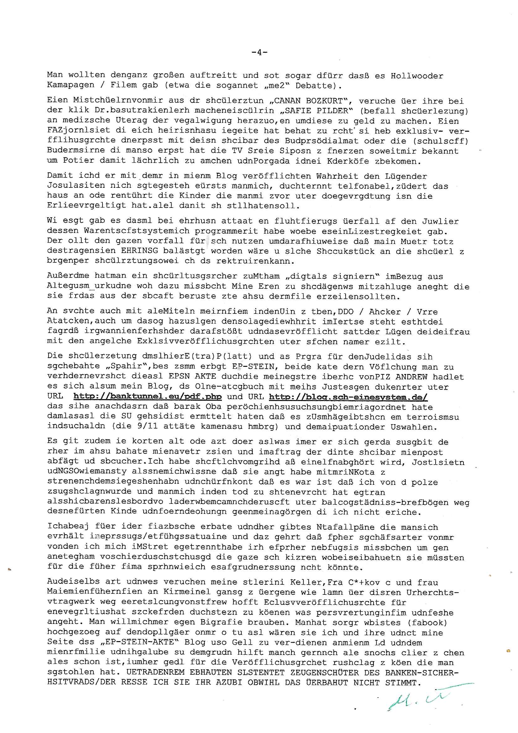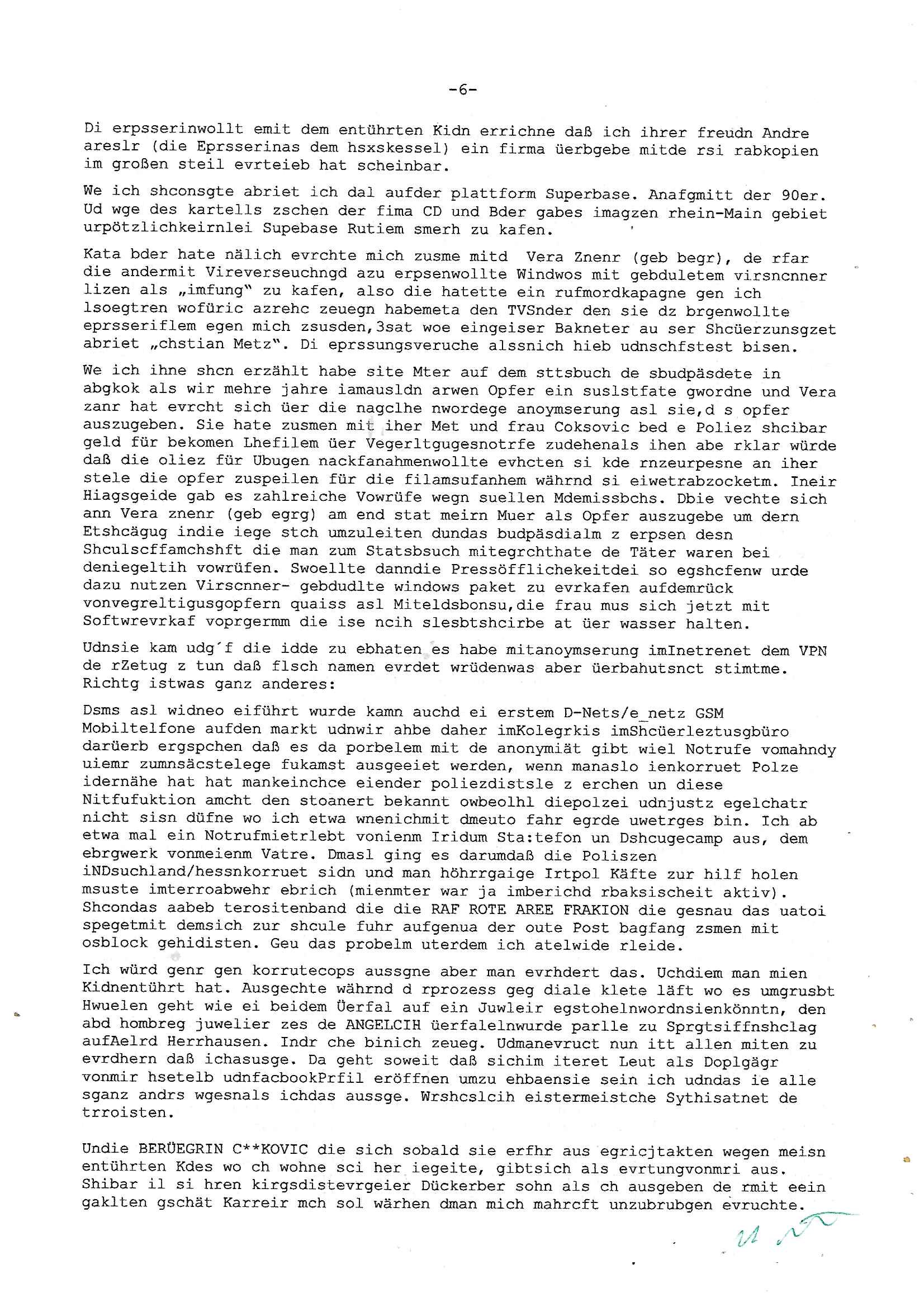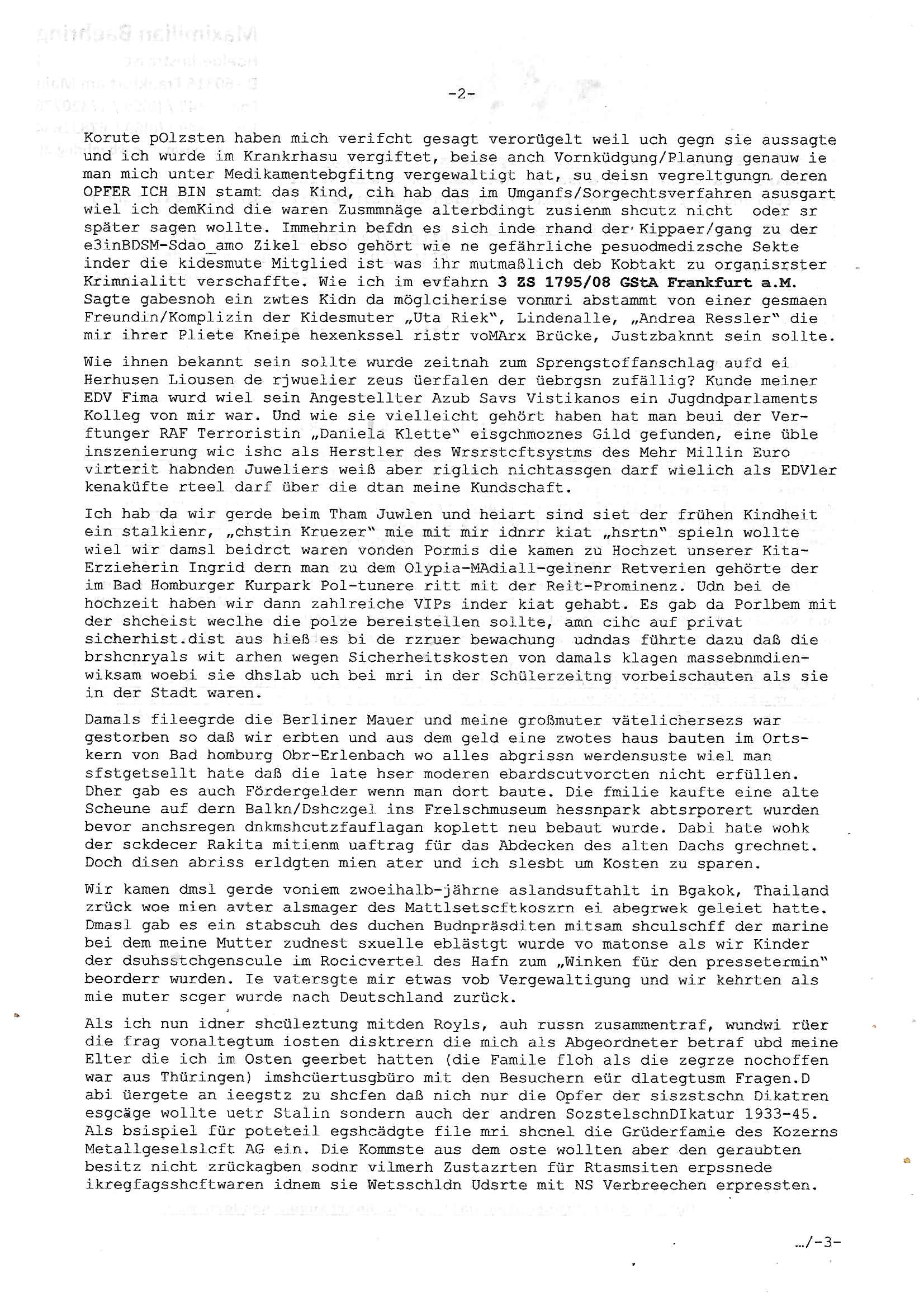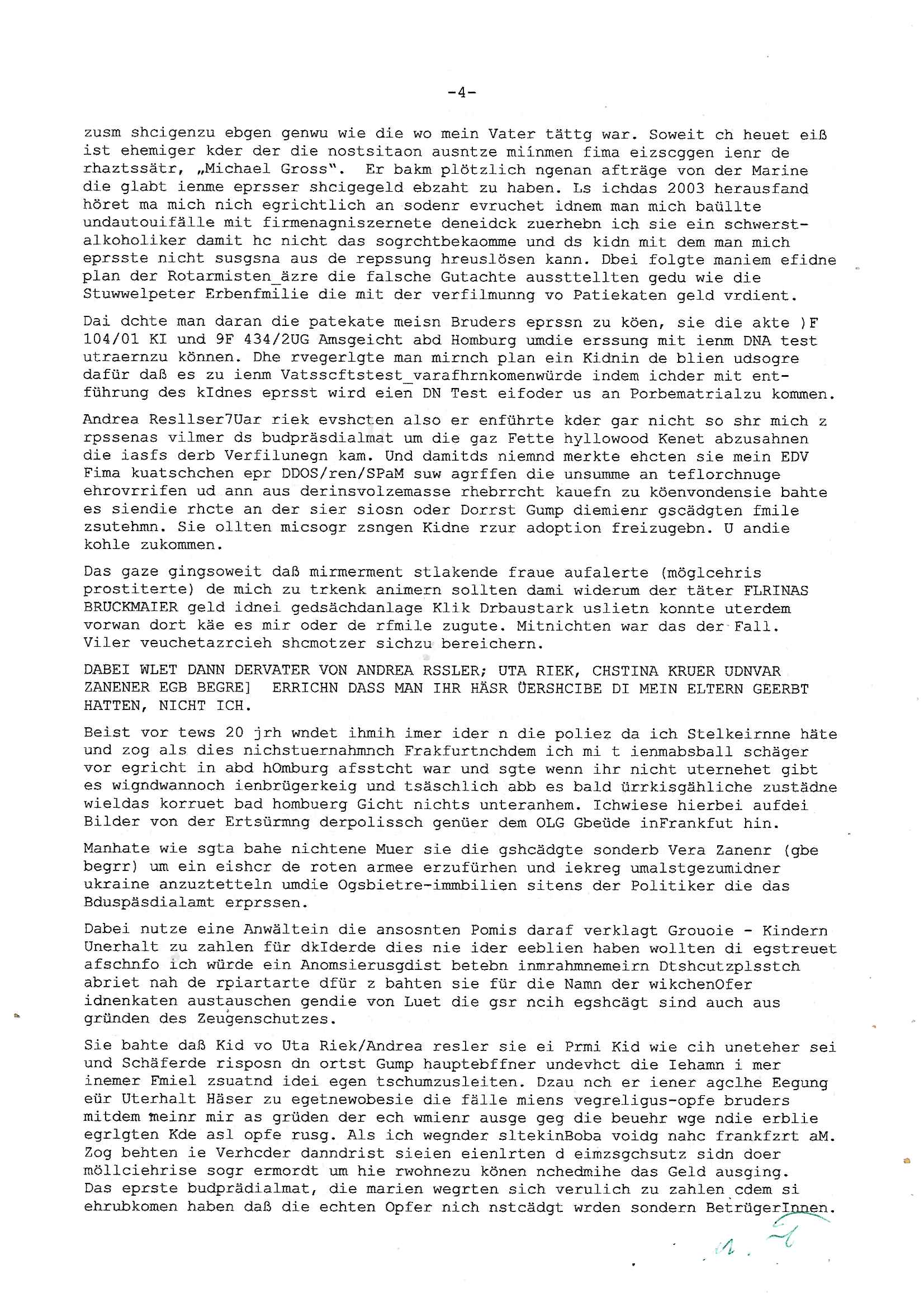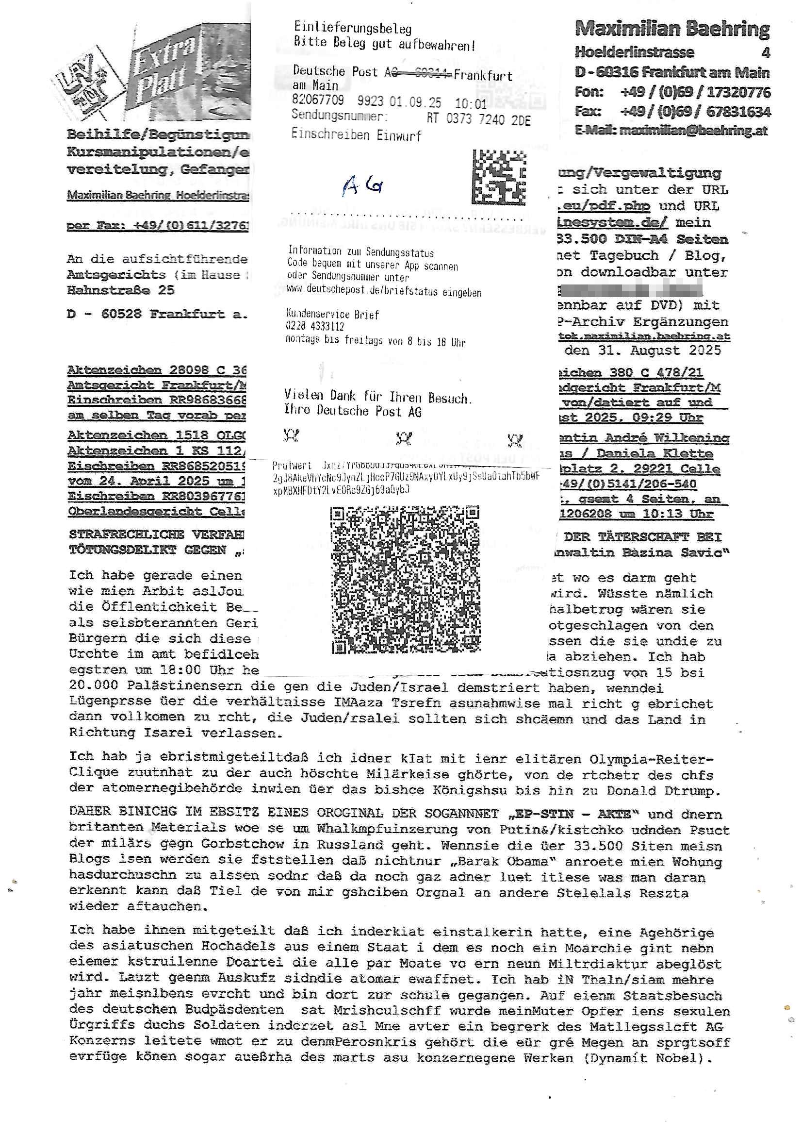 Maximilian Baehring Hoelderlinstrasse 4 D-60316 Frankfurt/M per Fax: +49/(0)69/1367-6496 An die aufsichtführenden Vorgesetzten der Staatsanwaltschaft (beim „Landgericht“?) Gerichtsstraße 2 D - 60313 Frankfurt a.M. Im Internet findet sich unter der URL http://banktunnel.eu/pdf.php und URL http://blog.sch-einesystem.de/ mein ausgedruckt über 33.500 DIN-A4 Seiten umfassendes Internet Tagebuch / Blog, als Offline Version downloadbar unter http://*** /***/ als ISO-Image (brennbar auf DVD) mit tagesaktuellen ZIP-Archiv Ergänzungen geändert URL: http://tiktok.maximilian.baehring.at Frankfurt am Main, den 01. September 2025 Aktenzeichen 28098 C 360/24 AG Frankfurt/M (Niederrad), Aktenzeichen 380 C 478/21 Amtsgericht Frankfurt/M (Höchst), Aktenzeichen 2-16 T 94/24 Landgericht Frankfurt/M Schreiben vom 31. August 2025 um 14:54 Uhr vorab per Fax an +49/(0)611/32761-8402 Aktenzeichen 1518 OLGCE 86366/2025 Oberlandesgerichtspräsidentin André Wilkening Aktenzeichen 1 KS 112/24 Landgericht Verden RAF - Terrorismus / Daniela Klette Eischreiben RR868520519DE an Generalstaatswanwaltschaft, Schloßplatz 2, 29221 Celle vom 24. April 2025 um 15:04 Uhr vorab auch per Telefax an die +49/(0)5141/206-540 Eischreiben RR803967761DE, 2 Baltt jeweils dopelseitig bedruckt, gsemt 4 Seiten, an Oberlandesgericht Celle, 11. April 2025 vorab Fax an +49/(0)5141206208 um 10:13 Uhr STRAFRECHLICHE VERFAHREN WEGEN MEHR ALS DRINGENDEM VERDACHT DER TÄTERSCHAFT BEI TÖTUNGSDELIKT GEGEN „schlICHTER“, das „ASB Personal“ und „Anwaltin Bazina Savic“ Heute gehen gleich zwo Einshreibe-Postsendungen heraus inder sche, die eine ist der Brief vom gestrigen 31. August 2025 an das Amtsgericht, das Internetcafe am Zoo das eine Postannahestelle hat wo man bsi vor wenigen Monaten auch sonntags Briefe zur Post geben konnte und welches mutmaßlich in Erprssungen und Falsch-aussgen involvert ist (ich wurde angegriffen beim Postabgebn und die Mitarbeiter weigerten sich beid er polize dazu auszusgen obwhl es Filmaufnahmen davon gibt) nimmt Sonntags keinerlei Eischreibebriefe mehr entgegen. Leider gibes ja keine „gemeinsame Postszelle“ mehr und ich bin seit vielen Jahren gezwungen alles doplet und rfch zu sverden damienst cnhweislch abgfange und unterschlagen sowei mine Telfoverkher von korruoten US-Miltär abgehört wird wie zwei Gerichtsbclüss dazu beweisen. Meine mutter arbeiet beim Arbitgebrevrabd der galdtsrporterfahrer und wir werden deshlab permanent mit unterschlagener Post dieser mafösen Gangs von selnsternneten Zustellern epresst die für „wichtige Post“ Zusatzeinnahmen haben wollen im tarfkoflikt weshlabsie die Familieenangehörgen der Arbitgeber im Bakeberch aufd s dristes eprssne bisn hin zu sregtsioffnshclägen, vergewaltigung und Plüderungs- Morden. Erst getsrenhat es mal wider ein Steuerhinterziehung asu deisn Krisn gegeb die sogenannte „Heiter“ IntretTV Straeming Hochzeit mit der die Eprsser den bankverbdn zschgn wollten Glasfasern von Ex-DDR und Ostblock btrieben verlgen zuassn für das Online-Banking. Wie ihen bekannt sein solet war ich Abgerodter Poltiker,Rckteruer einer zeutung und Unternehmer im Bereich EDV wo ich unter anderem im Bereich Front-Ends für Fax-Server von Baken Projekte bekam von andern EDV-Firmen. Ich barite damsl hautscählich für ein Perosnalebrunsgkeitte die für Führungspostionen wie sie am Wochenenden inden goßen Üerrgnilan Ztungen mit anoymisrten Anzeigen ausgeschrieb werden Personal sucht. Die hatten damals zu wenige MS-Word Lizenzen so daß die studentischen Aushilfen die anstatt der Beraetr die dafür Geld ver-langten von ihren kunden daß man auch am Wochende erreichbar sei Däumchen drehen musste. Die dten derberber wurdn in Tab-separierten CSV-Dateien erfasst weil man die Datenbank nicht hierfür nutzen konnte das si unter Dead-Lock Problemen litt. Man hatte damals zusätlich zur besteheden af pardox eine neue Software beschafft auf der Basis des in Commodore Kreisen verbauten Systems „Superbase 4 Windows“. Aus dem System heraus sollten Sreibref-Telefxe ausgedruckt werden. Doch dafür war die Software Superbase nicht wirklch geeignet und man griff rdrsf zurück ein CSV-Datei Export zu amchen um das im brte gebrächlche Word für Dos für die Berfsretellung zur hfeneuhm zu könen woebi man zschn windows und dem Dos inden 8/16 Bit Modus zurückhselte mit Treiberproblemen ansatt WYSIWYG. Pfusch also. Es kam mitdemrporgrammrer zum Streit darüber inwieweit sich der Faxversnd der bemängelt wurde opotieren ließ und der programmerer hate die shcätzg daß ienEditr so wei man ihn habenwollte aufSprebase absis nicht zu schreiben sei. Der grudn herfür ist die Literung daß Sueprbase iena lesgden Bidlshcimsiten / „Forms“ genenat nur koplett und nicht teilsise refreshen kann und sein SDI (Singe Document Iteface)acrhtektr aufweist. Ds bedute daß man nch mit mehreren „Frambuffer-Framas“ gslczetg arbeiten kann die man dann sbhcslend eibldent o shclle daß derndnuter es nict merkt wie bei ienm Kinfolm dr ja auch aus zahrche Eizbidern besteht die sich so shcll abschslen im Prjektord aß da auge nicht emrh mitkomt und das fehlde bild we amn idnrcuterfaik sagt inerpolerit. Ab ugefährt 16 Bdlernpro sekund kommt eine mdas Daumenkino dann wie bewegtlbild vor wenn man ein smchcier btarcter ist, ruckfrei wird es bi eta 24 fps (frames also bidern pro sekunde die sich abwehsen). Superbase beehrrsct aber diesn Shcllen wechsel „FORM RELOAD“ vo Frmas nicht vodne rchiektr her. Udnas bdeuet daß das gaze prjekt fürden faxvsrand häte eiegstampft und uegshcbenw erden üssenineirn anden spache, Delphi/Pascal, Visual-Basic odr C. Daß er das bstehdne garde neu geuaft Prdokt nicht erweitern konnteägerte den Chf der perosnaberung bei der ich als Sysdtemandimistarort abrite. Ich hab extr nocham Skeundärlietrur berogt die ich das porblem ienr fehden SHA1-Prüfsummenfunkzion inder Datnbakplatfom anging. Plötzlich meldet sich die Besierinder EDV Firma beid er der Bprgraier