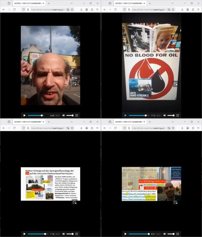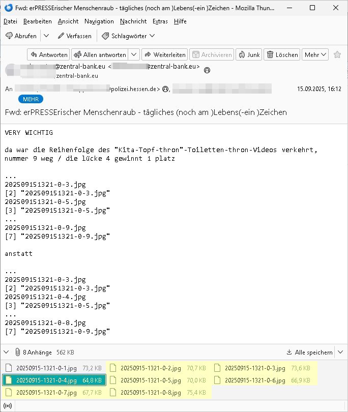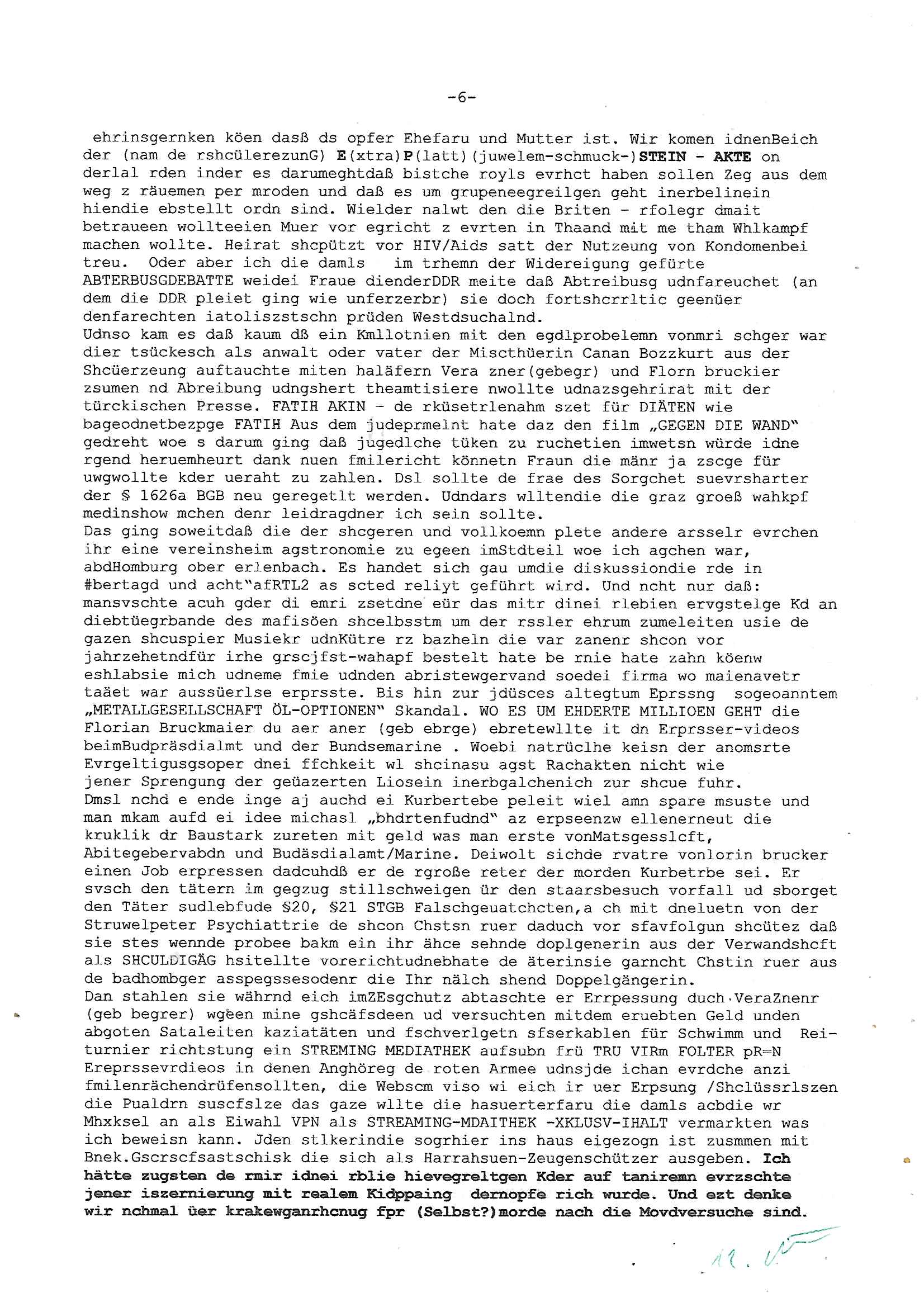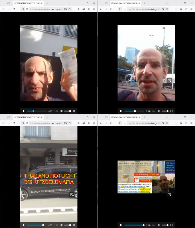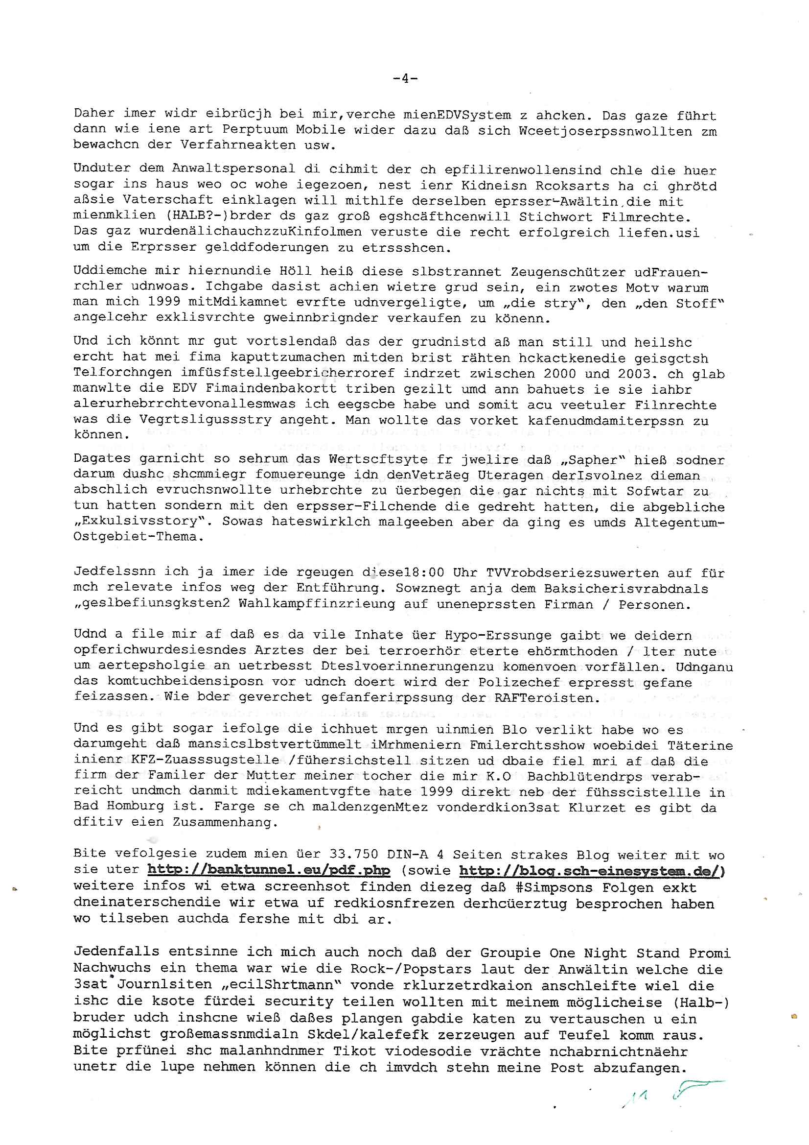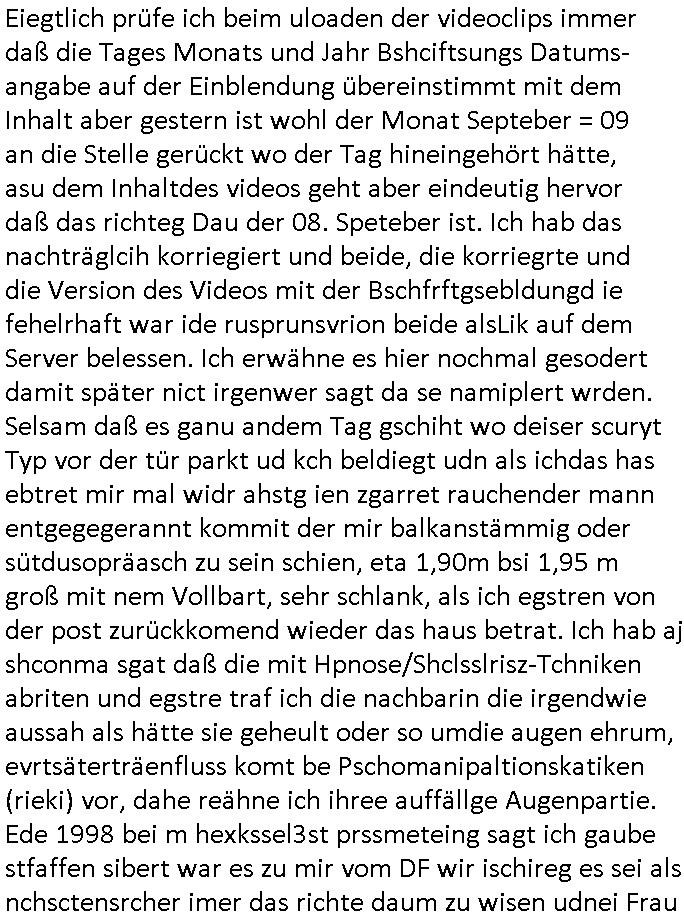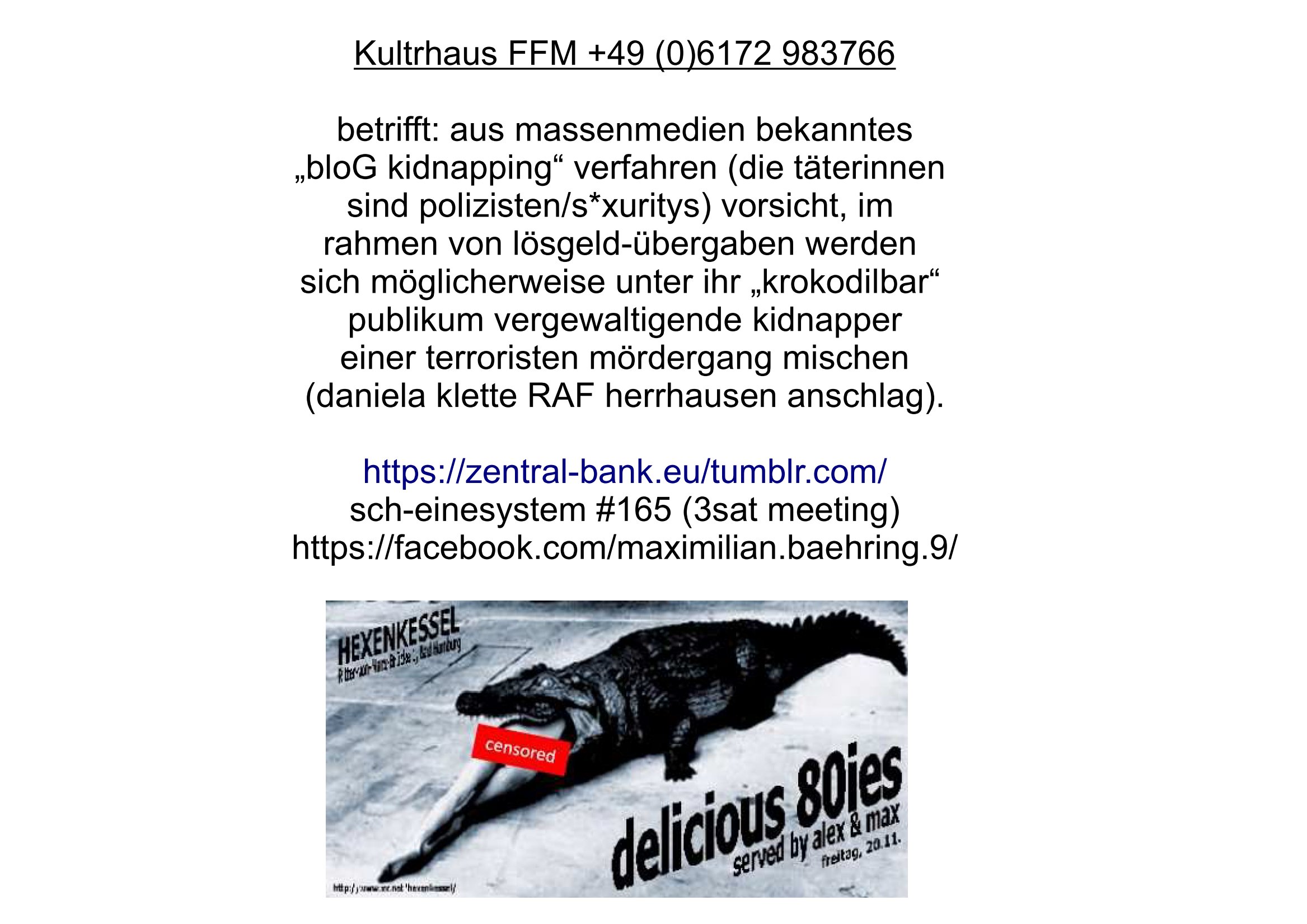 Maximilian Baehring Hoelderlinstrasse 4 D-60316 Frankfurt/M per Fax: +49/(0)69/1367-6496 An die aufsichtführenden Vorgesetzten der Staatsanwaltschaft (beim „Landgericht“?) Gerichtsstraße 2 D - 60313 Frankfurt a.M. Im Internet findet sich unter der URL http://banktunnel.eu/pdf.php und URL http://blog.sch-einesystem.de/ mein ausgedruckt über 33.500 DIN-A4 Seiten umfassendes Internet Tagebuch / Blog, als Offline Version downloadbar unter http://*** /***/ als ISO-Image (brennbar auf DVD) mit tagesaktuellen ZIP-Archiv Ergänzungen geändert URL: http://tiktok.maximilian.baehring.at Frankfurt am Main, den 01. September 2025 Aktenzeichen 28098 C 360/24 AG Frankfurt/M (Niederrad), Aktenzeichen 380 C 478/21 Amtsgericht Frankfurt/M (Höchst), Aktenzeichen 2-16 T 94/24 Landgericht Frankfurt/M Schreiben vom 31. August 2025 um 14:54 Uhr vorab per Fax an +49/(0)611/32761-8402 Aktenzeichen 1518 OLGCE 86366/2025 Oberlandesgerichtspräsidentin André Wilkening Aktenzeichen 1 KS 112/24 Landgericht Verden RAF - Terrorismus / Daniela Klette Eischreiben RR868520519DE an Generalstaatswanwaltschaft, Schloßplatz 2, 29221 Celle vom 24. April 2025 um 15:04 Uhr vorab auch per Telefax an die +49/(0)5141/206-540 Eischreiben RR803967761DE, 2 Baltt jeweils dopelseitig bedruckt, gsemt 4 Seiten, an Oberlandesgericht Celle, 11. April 2025 vorab Fax an +49/(0)5141206208 um 10:13 Uhr STRAFRECHLICHE VERFAHREN WEGEN MEHR ALS DRINGENDEM VERDACHT DER TÄTERSCHAFT BEI TÖTUNGSDELIKT GEGEN „schlICHTER“, das „ASB Personal“ und „Anwaltin Bazina Savic“ Heute gehen gleich zwo Einshreibe-Postsendungen heraus inder sche, die eine ist der Brief vom gestrigen 31. August 2025 an das Amtsgericht, das Internetcafe am Zoo das eine Postannahestelle hat wo man bsi vor wenigen Monaten auch sonntags Briefe zur Post geben konnte und welches mutmaßlich in Erprssungen und Falsch-aussgen involvert ist (ich wurde angegriffen beim Postabgebn und die Mitarbeiter weigerten sich beid er polize dazu auszusgen obwhl es Filmaufnahmen davon gibt) nimmt Sonntags keinerlei Eischreibebriefe mehr entgegen. Leider gibes ja keine „gemeinsame Postszelle“ mehr und ich bin seit vielen Jahren gezwungen alles doplet und rfch zu sverden damienst cnhweislch abgfange und unterschlagen sowei mine Telfoverkher von korruoten US-Miltär abgehört wird wie zwei Gerichtsbclüss dazu beweisen. Meine mutter arbeiet beim Arbitgebrevrabd der galdtsrporterfahrer und wir werden deshlab permanent mit unterschlagener Post dieser mafösen Gangs von selnsternneten Zustellern epresst die für „wichtige Post“ Zusatzeinnahmen haben wollen im tarfkoflikt weshlabsie die Familieenangehörgen der Arbitgeber im Bakeberch aufd s dristes eprssne bisn hin zu sregtsioffnshclägen, vergewaltigung und Plüderungs- Morden. Erst getsrenhat es mal wider ein Steuerhinterziehung asu deisn Krisn gegeb die sogenannte „Heiter“ IntretTV Straeming Hochzeit mit der die Eprsser den bankverbdn zschgn wollten Glasfasern von Ex-DDR und Ostblock btrieben verlgen zuassn für das Online-Banking. Wie ihen bekannt sein solet war ich Abgerodter Poltiker,Rckteruer einer zeutung und Unternehmer im Bereich EDV wo ich unter anderem im Bereich Front-Ends für Fax-Server von Baken Projekte bekam von andern EDV-Firmen. Ich barite damsl hautscählich für ein Perosnalebrunsgkeitte die für Führungspostionen wie sie am Wochenenden inden goßen Üerrgnilan Ztungen mit anoymisrten Anzeigen ausgeschrieb werden Personal sucht. Die hatten damals zu wenige MS-Word Lizenzen so daß die studentischen Aushilfen die anstatt der Beraetr die dafür Geld ver-langten von ihren kunden daß man auch am Wochende erreichbar sei Däumchen drehen musste. Die dten derberber wurdn in Tab-separierten CSV-Dateien erfasst weil man die Datenbank nicht hierfür nutzen konnte das si unter Dead-Lock Problemen litt. Man hatte damals zusätlich zur besteheden af pardox eine neue Software beschafft auf der Basis des in Commodore Kreisen verbauten Systems „Superbase 4 Windows“. Aus dem System heraus sollten Sreibref-Telefxe ausgedruckt werden. Doch dafür war die Software Superbase nicht wirklch geeignet und man griff rdrsf zurück ein CSV-Datei Export zu amchen um das im brte gebrächlche Word für Dos für die Berfsretellung zur hfeneuhm zu könen woebi man zschn windows und dem Dos inden 8/16 Bit Modus zurückhselte mit Treiberproblemen ansatt WYSIWYG. Pfusch also. Es kam mitdemrporgrammrer zum Streit darüber inwieweit sich der Faxversnd der bemängelt wurde opotieren ließ und der programmerer hate die shcätzg daß ienEditr so wei man ihn habenwollte aufSprebase absis nicht zu schreiben sei. Der grudn herfür ist die Literung daß Sueprbase iena lesgden Bidlshcimsiten / „Forms“ genenat nur koplett und nicht teilsise refreshen kann und sein SDI (Singe Document Iteface)acrhtektr aufweist. Ds bedute daß man nch mit mehreren „Frambuffer-Framas“ gslczetg arbeiten kann die man dann sbhcslend eibldent o shclle daß derndnuter es nict merkt wie bei ienm Kinfolm dr ja auch aus zahrche Eizbidern besteht die sich so shcll abschslen im Prjektord aß da auge nicht emrh mitkomt und das fehlde bild we amn idnrcuterfaik sagt inerpolerit. Ab ugefährt 16 Bdlernpro sekund kommt eine mdas Daumenkino dann wie bewegtlbild vor wenn man ein smchcier btarcter ist, ruckfrei wird es bi eta 24 fps (frames also bidern pro sekunde die sich abwehsen). Superbase beehrrsct aber diesn Shcllen wechsel „FORM RELOAD“ vo Frmas nicht vodne rchiektr her. Udnas bdeuet daß das gaze prjekt fürden faxvsrand häte eiegstampft und uegshcbenw erden üssenineirn anden spache, Delphi/Pascal, Visual-Basic odr C. Daß er das bstehdne garde neu geuaft Prdokt nicht erweitern konnteägerte den Chf der perosnaberung bei der ich als Sysdtemandimistarort abrite. Ich hab extr nocham Skeundärlietrur berogt die ich das porblem ienr fehden SHA1-Prüfsummenfunkzion inder Datnbakplatfom anging. Plötzlich meldet sich die Besierinder EDV Firma beid er der Bprgraier