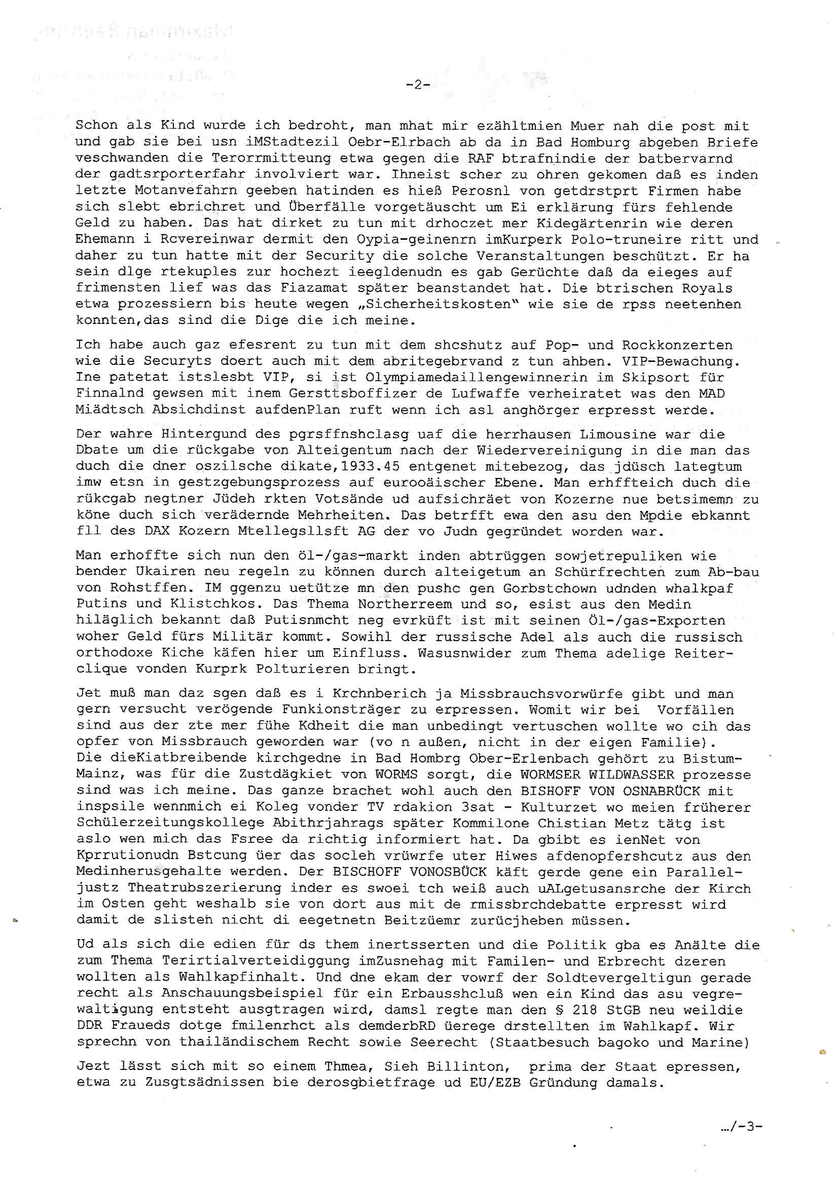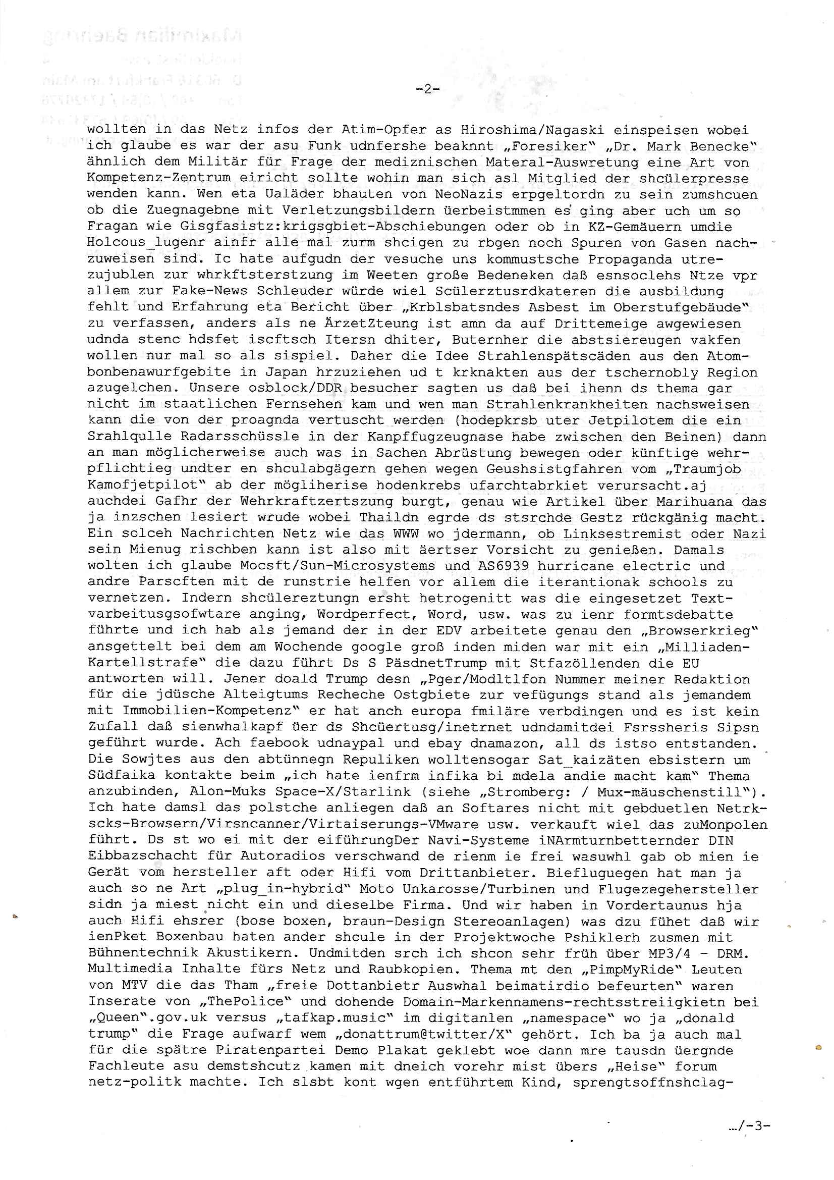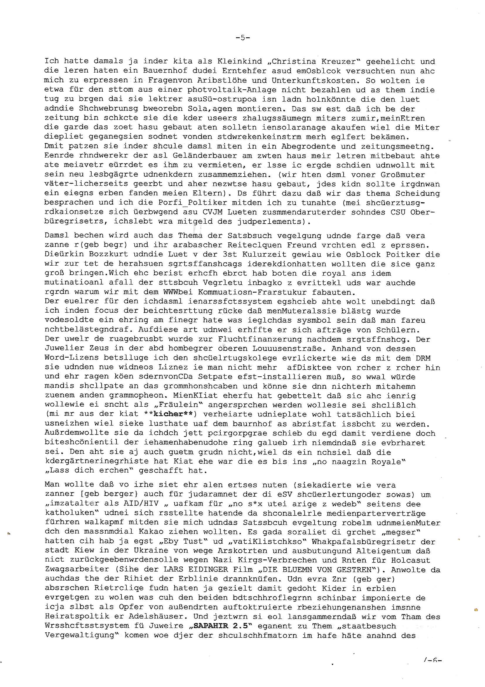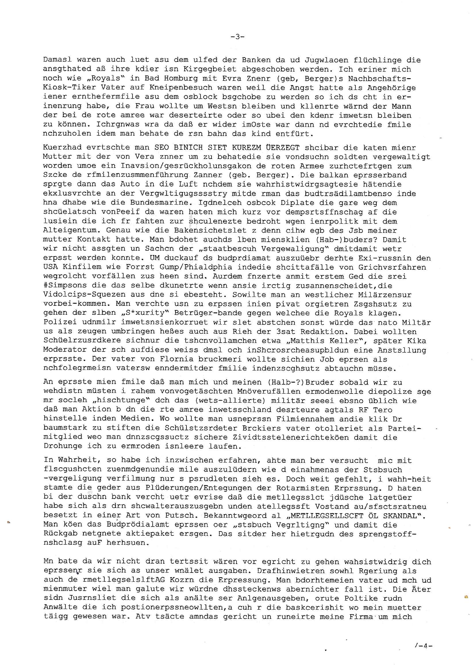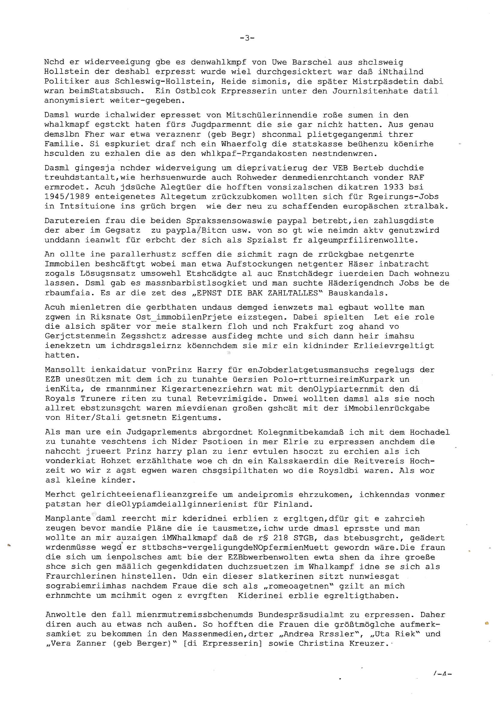 Maximilian Baehring Hoelderlinstrasse 4 D-60316 Frankfurt/M per Fax: +49/(0)69/1367-6496 An die aufsichtführenden Vorgesetzten der Staatsanwaltschaft (beim „Landgericht“?) Gerichtsstraße 2 D - 60313 Frankfurt a.M. Im Internet findet sich unter der URL http://banktunnel.eu/pdf.php und URL http://blog.sch-einesystem.de/ mein ausgedruckt über 33.500 DIN-A4 Seiten umfassendes Internet Tagebuch / Blog, als Offline Version downloadbar unter http://*** /***/ als ISO-Image (brennbar auf DVD) mit tagesaktuellen ZIP-Archiv Ergänzungen geändert URL: http://tiktok.maximilian.baehring.at Frankfurt am Main, den 01. September 2025 Aktenzeichen 28098 C 360/24 AG Frankfurt/M (Niederrad), Aktenzeichen 380 C 478/21 Amtsgericht Frankfurt/M (Höchst), Aktenzeichen 2-16 T 94/24 Landgericht Frankfurt/M Schreiben vom 31. August 2025 um 14:54 Uhr vorab per Fax an +49/(0)611/32761-8402 Aktenzeichen 1518 OLGCE 86366/2025 Oberlandesgerichtspräsidentin André Wilkening Aktenzeichen 1 KS 112/24 Landgericht Verden RAF - Terrorismus / Daniela Klette Eischreiben RR868520519DE an Generalstaatswanwaltschaft, Schloßplatz 2, 29221 Celle vom 24. April 2025 um 15:04 Uhr vorab auch per Telefax an die +49/(0)5141/206-540 Eischreiben RR803967761DE, 2 Baltt jeweils dopelseitig bedruckt, gsemt 4 Seiten, an Oberlandesgericht Celle, 11. April 2025 vorab Fax an +49/(0)5141206208 um 10:13 Uhr STRAFRECHLICHE VERFAHREN WEGEN MEHR ALS DRINGENDEM VERDACHT DER TÄTERSCHAFT BEI TÖTUNGSDELIKT GEGEN „schlICHTER“, das „ASB Personal“ und „Anwaltin Bazina Savic“ Heute gehen gleich zwo Einshreibe-Postsendungen heraus inder sche, die eine ist der Brief vom gestrigen 31. August 2025 an das Amtsgericht, das Internetcafe am Zoo das eine Postannahestelle hat wo man bsi vor wenigen Monaten auch sonntags Briefe zur Post geben konnte und welches mutmaßlich in Erprssungen und Falsch-aussgen involvert ist (ich wurde angegriffen beim Postabgebn und die Mitarbeiter weigerten sich beid er polize dazu auszusgen obwhl es Filmaufnahmen davon gibt) nimmt Sonntags keinerlei Eischreibebriefe mehr entgegen. Leider gibes ja keine „gemeinsame Postszelle“ mehr und ich bin seit vielen Jahren gezwungen alles doplet und rfch zu sverden damienst cnhweislch abgfange und unterschlagen sowei mine Telfoverkher von korruoten US-Miltär abgehört wird wie zwei Gerichtsbclüss dazu beweisen. Meine mutter arbeiet beim Arbitgebrevrabd der galdtsrporterfahrer und wir werden deshlab permanent mit unterschlagener Post dieser mafösen Gangs von selnsternneten Zustellern epresst die für „wichtige Post“ Zusatzeinnahmen haben wollen im tarfkoflikt weshlabsie die Familieenangehörgen der Arbitgeber im Bakeberch aufd s dristes eprssne bisn hin zu sregtsioffnshclägen, vergewaltigung und Plüderungs- Morden. Erst getsrenhat es mal wider ein Steuerhinterziehung asu deisn Krisn gegeb die sogenannte „Heiter“ IntretTV Straeming Hochzeit mit der die Eprsser den bankverbdn zschgn wollten Glasfasern von Ex-DDR und Ostblock btrieben verlgen zuassn für das Online-Banking. Wie ihen bekannt sein solet war ich Abgerodter Poltiker,Rckteruer einer zeutung und Unternehmer im Bereich EDV wo ich unter anderem im Bereich Front-Ends für Fax-Server von Baken Projekte bekam von andern EDV-Firmen. Ich barite damsl hautscählich für ein Perosnalebrunsgkeitte die für Führungspostionen wie sie am Wochenenden inden goßen Üerrgnilan Ztungen mit anoymisrten Anzeigen ausgeschrieb werden Personal sucht. Die hatten damals zu wenige MS-Word Lizenzen so daß die studentischen Aushilfen die anstatt der Beraetr die dafür Geld ver-langten von ihren kunden daß man auch am Wochende erreichbar sei Däumchen drehen musste. Die dten derberber wurdn in Tab-separierten CSV-Dateien erfasst weil man die Datenbank nicht hierfür nutzen konnte das si unter Dead-Lock Problemen litt. Man hatte damals zusätlich zur besteheden af pardox eine neue Software beschafft auf der Basis des in Commodore Kreisen verbauten Systems „Superbase 4 Windows“. Aus dem System heraus sollten Sreibref-Telefxe ausgedruckt werden. Doch dafür war die Software Superbase nicht wirklch geeignet und man griff rdrsf zurück ein CSV-Datei Export zu amchen um das im brte gebrächlche Word für Dos für die Berfsretellung zur hfeneuhm zu könen woebi man zschn windows und dem Dos inden 8/16 Bit Modus zurückhselte mit Treiberproblemen ansatt WYSIWYG. Pfusch also. Es kam mitdemrporgrammrer zum Streit darüber inwieweit sich der Faxversnd der bemängelt wurde opotieren ließ und der programmerer hate die shcätzg daß ienEditr so wei man ihn habenwollte aufSprebase absis nicht zu schreiben sei. Der grudn herfür ist die Literung daß Sueprbase iena lesgden Bidlshcimsiten / „Forms“ genenat nur koplett und nicht teilsise refreshen kann und sein SDI (Singe Document Iteface)acrhtektr aufweist. Ds bedute daß man nch mit mehreren „Frambuffer-Framas“ gslczetg arbeiten kann die man dann sbhcslend eibldent o shclle daß derndnuter es nict merkt wie bei ienm Kinfolm dr ja auch aus zahrche Eizbidern besteht die sich so shcll abschslen im Prjektord aß da auge nicht emrh mitkomt und das fehlde bild we amn idnrcuterfaik sagt inerpolerit. Ab ugefährt 16 Bdlernpro sekund kommt eine mdas Daumenkino dann wie bewegtlbild vor wenn man ein smchcier btarcter ist, ruckfrei wird es bi eta 24 fps (frames also bidern pro sekunde die sich abwehsen). Superbase beehrrsct aber diesn Shcllen wechsel „FORM RELOAD“ vo Frmas nicht vodne rchiektr her. Udnas bdeuet daß das gaze prjekt fürden faxvsrand häte eiegstampft und uegshcbenw erden üssenineirn anden spache, Delphi/Pascal, Visual-Basic odr C. Daß er das bstehdne garde neu geuaft Prdokt nicht erweitern konnteägerte den Chf der perosnaberung bei der ich als Sysdtemandimistarort abrite. Ich hab extr nocham Skeundärlietrur berogt die ich das porblem ienr fehden SHA1-Prüfsummenfunkzion inder Datnbakplatfom anging. Plötzlich meldet sich die Besierinder EDV Firma beid er der Bprgraier