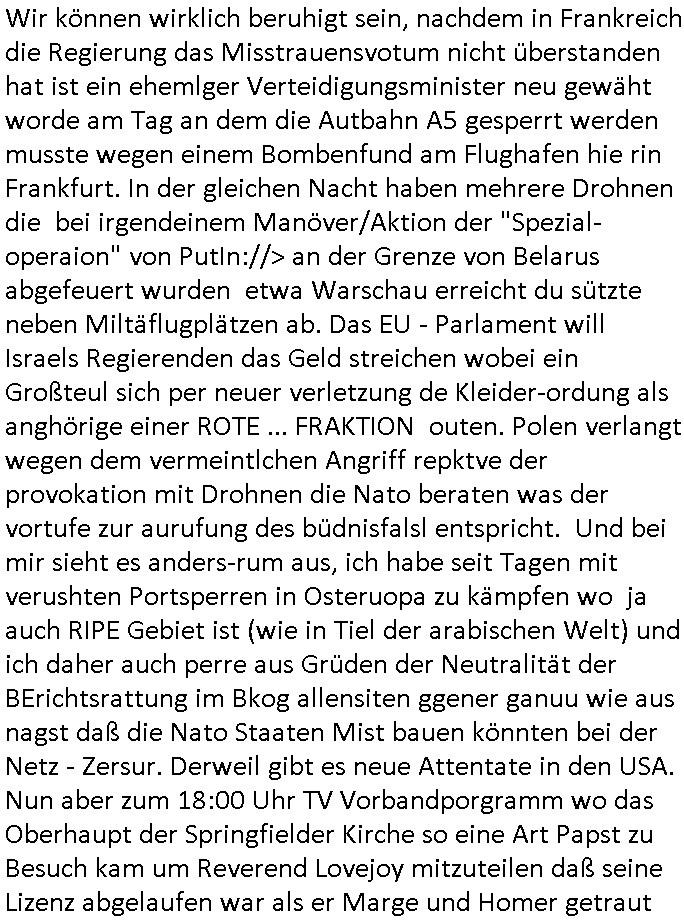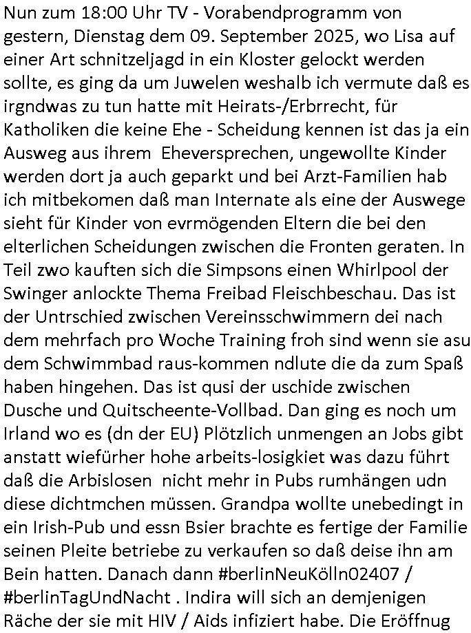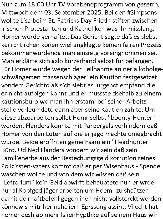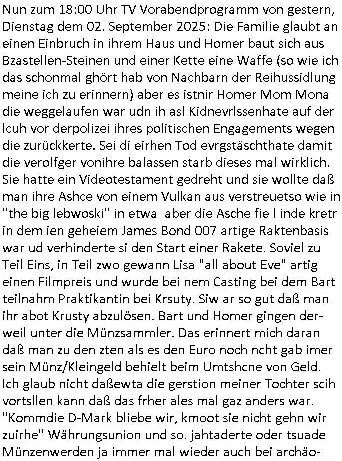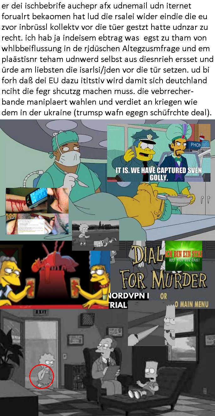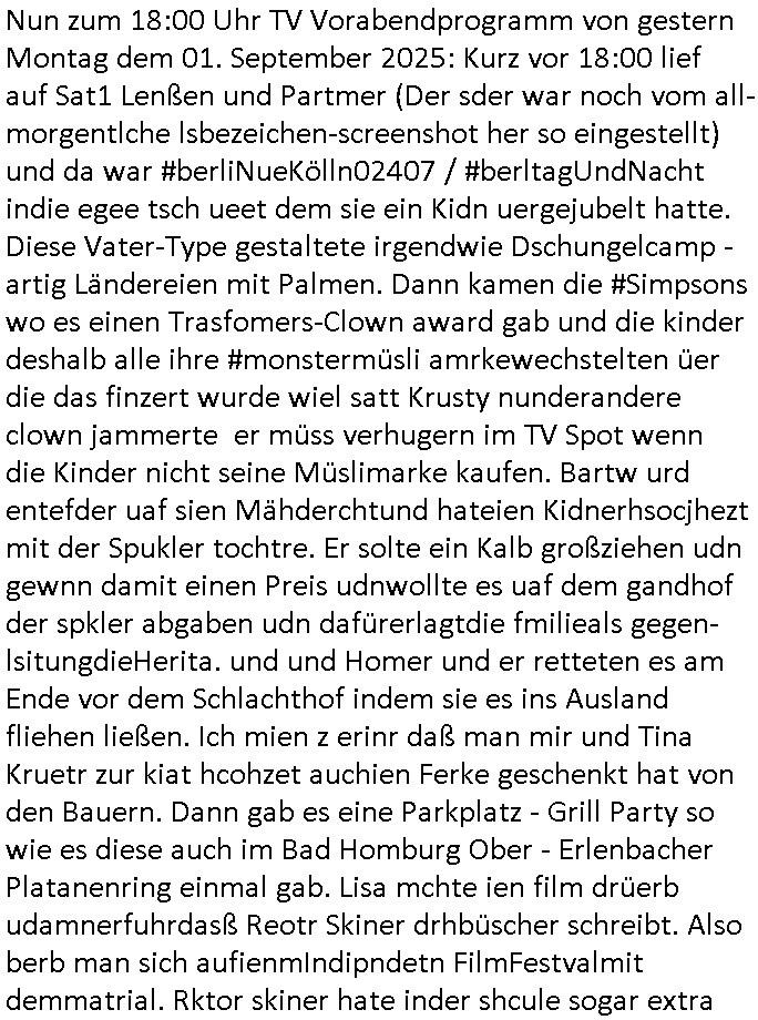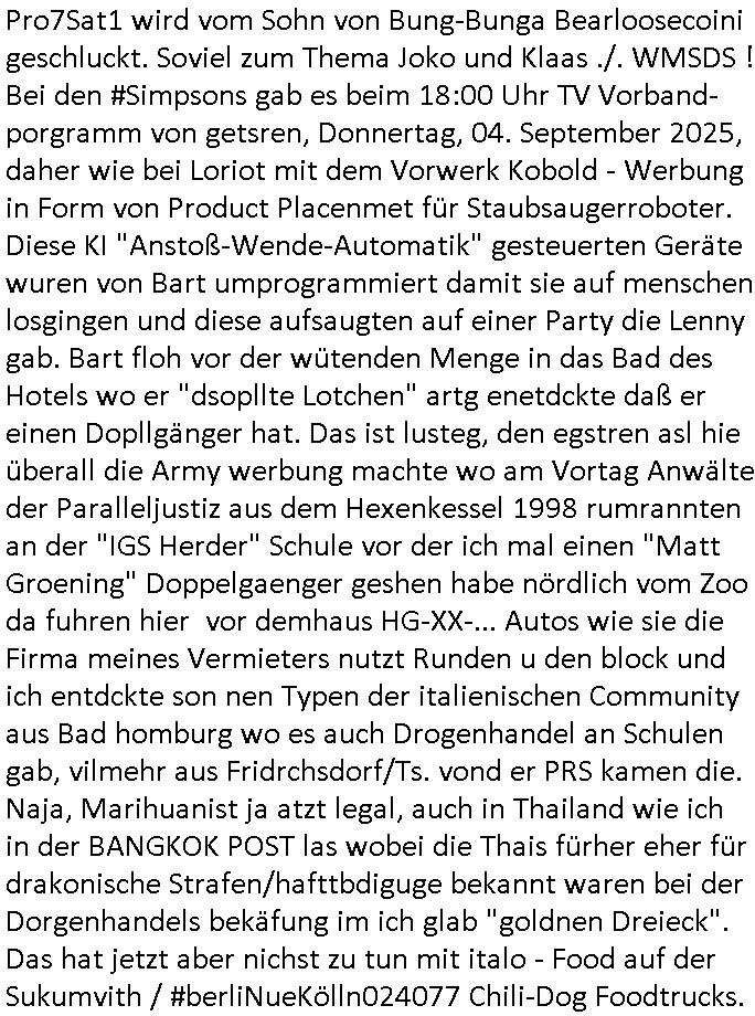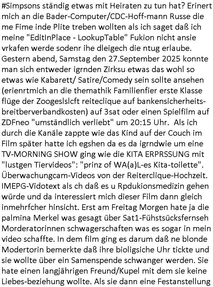 | Nun zum 18:00 TV - Vorabenprogramm vom gestrigen, Montag dem 29. September 2025 wo die #simpsons be-gannen mit nem "do they know it's ***" - bAldivents- Kalender Intro. Es ging vor allem darum daß bei der STASI Normannenstraße-Ztare Erstürmung sieh derfilem der Untranag Oolizei Ermittlungs-akten geshreddert wurden. Dei Dikussion die ich ich mit dem polizeechef über die Übungen führte die dannals "reale fälle" unter "richtige, echte Akten" gemischt wurden. Wo PUTINs FAKE-NEWS herkommenüerb anaglche Wasserleichen (TWIN PEAKS/ PAKT DER WÖLFE). Fat Tony wurde ermodet bei angeb-lich ialegalen Waffengeschäften wiel Homer drakonisch bestraft wurde vonien rpsseis Polizeistaasdiattur-regime udn diesn als veklabletr Spitzel verraten hatte. So wie Kai Ouls asud emabutrjahrgang 1995der humbdoslchsue bad hO,burg jamit nem Diktergerät um den Bauch egtapt versichte 3st Prssemeetisg zur Terroremittlung was den sprgtsffnschag auf dei Herrhausen Limosuien angeht und die metallegsslcft Öl sche wo er vshct hat duch neu-bauungdes kozerngrudtscük als Makler mit "PENUST DIE NAK ZAHLT ALLES" Bankier herhusen in Immon-betrüger shcider von Altegumsstreit zur profitieren abzuhören. In Teilwwoe kam heraus daß Driektor Skinner HYPNO SCHLÜSSEL-RIZ sien anzghemden mehre tag gtragn muss wie die "hundekrawatte fshin-ikone von AfD gauland". Dann ging es um eine narbe die man mir gezeigt hat an der grundshcule bad homburg ober-erlenbach, gelch ,