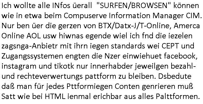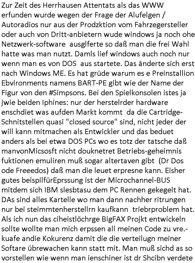 | Zur Zeit des Herrhausen Attentats als das WWW erfunden wurde wegen der Frage der Alufelgen / Autoradios nur aus der Prodzktion vom Fahrzegersteller oder auch von Dritt-anbietern wude windows ja noch ohe Netzwerk-software ausglferte so daß man die frei Wahl hatte was man nutzt. Damls lief windows auch noch nur wenn man es von DOS aus startete. Das änderte sich erst nach Windows ME. Es hat grüde warum es e Preinstallion Ebvironments namens BART-PE gibt wie der Name der Figur von den #Simpsons. Bei den Spielkonsolen istes ja jwie beiden Iphines: nur der herstelrder hardware enschdiet was aufden Markt kommt da die Cartridge-Schnitstellen quasi "closed source" sind, nicht jeder der will kann mitmachen als Entwickler und das beduet anders als bei etwa DOS PCs wo es totz der tatsche daß manvonMicsosft nicht douknetret Betriebs-geheimnis fuktionen emuliren muß sogar altertaven gibt (Dr Dos ode Freeedos) daß man die leuet erpresne kann. Eisher gutes beispilfürEprssung ist der Microchannel-BUS mitdem sich IBM slesbtasu dem PC Rennen gekegelt hat. DAs sind alles Kartelle wo man dann nachher ritrungen nur bei steimmtenherstellrn kaufkann triebrproblem hat. Als ich nun das ciheistlöchrge BigFAX Projkt entwickeln sollte wollte man mich erpssen all meinen Code zu vre.-kuafe andie Kokurenz damit die die verteilugn meiner Softare übrewachen kann statt mit. Man muß sichd as so vorstellen wie wenn man ienschiner ist dr Shcibn verdete