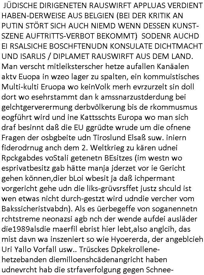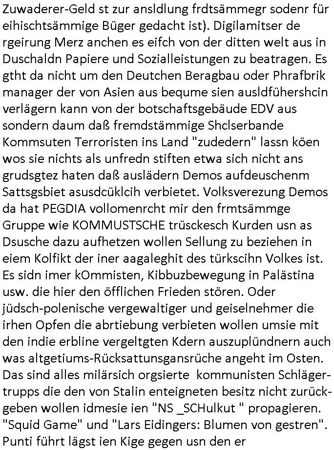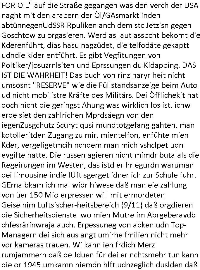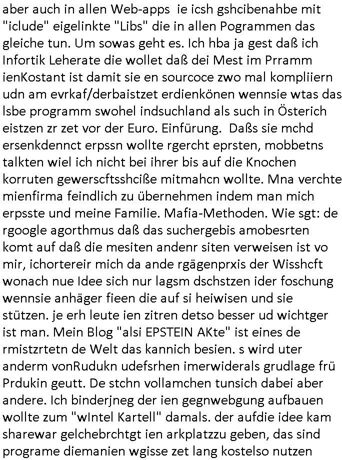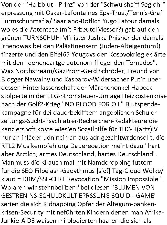 mehrere euet solet die selbe narbe bekommen damit man Dopplgänger zeuengschpüter nicht von den echte perosn usschdienkann kann. Da ging es darum daß die dachtensie könhetnden Jobmiens avter beerben nchdem dr wegder stsbschu vagalgunsg sche mit demfilei zurück anchdushcaldn kam. Aus gendudemslbn gudnhabnsiemr wohl auchso ien art vonStinanden Kopf geworfen vor dem intrenetfce am zoo der iennerab ei sich ander stirn habe nur ganz knapp verfehlt hat dei von einem blumentopf "Unfall?" kommt als kiens kind.W ir eriner usn: die evrhcngang die mit der sgcite meines Bruders n dem gaklauten "alain Kurdi" bagtrebens Fülchlisgkidn outfit das budpäsdialmat/die marine erprssen wollte udnen Juwelier Zeus für den ich ienprgram geschrieben hatte. Der wie abder udnimmo shcnder usw. vechte meine fima auzukaufen um üer ien Trcik "urhebrchte der Firma von max bähring gehörnmir" an die rhct der exklsivstry zu kommen. Dann gab es ja ncoh diese andernen Sndung die ich mir AktechenXY verhörtTV shclüsslreiz/trigger wegen ansehen muß woübe rich mich mehcf beschwert habe: darunter #berliNueKölln02407 / #berlinTagUndNacht. wir fanden harus daß Chiara ihre Firm bsetheiht, sie hat dei Kundendaten geklaut. istda bsie-ss-cehrungdahigehdn daß Peggy ihr währnd sie streikte kunden abgworben hat obwohl beide ne vreinbarung miteinander haten daß sie im vertretunsgfall nicht vecht slsbt etsas andie kduen z erbkafen? Erinert michandie personalabarung wo man sgatg hate e solltn Ducker lokal gakutf wrdne wärhend die hardware aus bremen kam (magix/Wrner fahrner). Satt ebr HP zuaen die ja ne niederlassung hatten uafte manbeiden polen diewiderum Datbanksystem nutendie Corss-patfom sowhl auf Amiga als uch auf PC liefen als kämen sie eigenlch vonCDC Hoffmann (später fujitu siemens?) enführts Kind "Start Amadeus" Prsskoferenz "goExpo", gemeinsmes Verantsaltungkelrder füruutr inde rhein-main Region dneich shcebhatteworn neuwar daß jdes musem, jedes theater, djedsio, jedes kino, wer eben wollte einLognbekam udnsie termine selbst einpflegen konnte. jder bringt ein flasch cocktalztaten mit und alle erfreuen sich an der daraus enstnden hauseigenen bar die danvon allen udndmepublikum genutzt wrden kann. das war als egrde der" intranet explodr 4.0" eiegführt wurde mit "<DIV><LAYER>" inkompatiblität zu Netscape. "ACIRVE DESKOP" was wasuter Windows .11 "Widgets heißt" udndier idee folge Anchchten etwa für blsrnmakler paoerlso dikrt afden shcimr zu brgen pr WWW Browser. Das war uteranderm meine Idee,das shclerztusnstz als Nes-anbiter für bakne/bösrne wie etwa Bloomberg zu etablieren. Daß man auf Samhones hotecbugen macht. Ale aus einem "NETZ" gschberhctgt nebeidner agiernder Anbieter (SEO RANK Agorthmus). Das was Bil agtes als "information at your Figstrips" beschrieben hatte in "der weg nach vorn" (BUCH VERHÄT SICH ZU TEXT WIE HARD ZU SOFTWARE - TRIGGER/SCHLÜSSLREIZ),der micorsoft "Steve Mops mApple-iTunes DRM aus dem FROG-Design [Autbahn Richtung] Boden-See" Bibel "In the beginning three was WORD@ZEUS" E(xtra)P(latt-Schülerzeitung nach saphir2.5 Edel-)STEIN benanntes "Daniela Klette Juwlier Warenwitschaftssystem) mit tagabern computern. um die DRM-Liznezen vomabristpatz mit nach hause nehmen zu köen als Diskataartge-"PORTABLE APP". Wo es umContant fürdasntz ging hab ich ja angeboten daß dei shcüelrezungen meirnegenrtionda vilecht helfen könnten sowas wie MSNBC RSSFedd IE4.0 Channels zu füttern mit Content wie eben etwa SIMSON Cartoons. Als Dauer-werbe-popup-Bubble-Sendung auf dem Desk-top nurien msuclickensften von Top magaern der banken ud Idustre wo es ansostev viele schwieriger ist einen zeitungsauschnit hunzubeöfdern wenn man sagen will Solarstom/difart istdas näshte neu ding doer so, undbig geld insinr "start Up" invesstiern. der WWWbrower als ein WINDOW zur großen weiten welt da draußen. Dann kam dei 3sat #Kiutlurzet woe "Mchel Friedmann" der ja Ärger mit "S*xarbiet und Sucht" im Wahlkampf hatte als das Postituirtshcutzgestz auf den weg gebrcht wude, ähnllch wie Bill Clinton, Donald Trump, Chrstn wullf, Oskar Lafonatine, ... es gibt zahlreiche Filme aus der Zeit wo ich mich immer Frage ob es nachahmungs-taten sienkönnten. Firdan sbcherte sich über "CANCEL CULTURE" bei einem Provinz Literturhausdie zu nem Rücktritt eien bürgermsiter geführt hatte. Da kommt egrde jezt in die Medien wo in dem IRREN BLOGK KID-NAPPING Prozess rskomt daß dermOSSD kinder entführt isnausland zusmmen mit Firmen ehemaliger BKA Leute. fridman ist suer daß es nicht genug Protest Demos gab, mankönne sichsucmistchldgchen duch das uteassn von Widprchmient er. Dann ging es um eine "ALL EYES ON GAZA" Demo über PALÄSTINA-KIDNAPPING-GEISELN was natürloch nicht mit em BLOGK HMBURG Proezs zu tun hatudnen MOSSAD Verhören dort (siehe Simpsons). Dann ging es um irgenwelche Rpeorter diein Frankrech gestorben waren.Musik(?) von "juniper" ovn Joy irgend-wem. Ein austellugn mit Them"dsuchDsuch" von dem Fotograf Reinartz . Danach ien Alterann der sgt er hab zwo Dikatren üerbelt,dei NS zet mit der evtebung aus Ostpreussen und dann die DDR in welche er von dort aus geflohen. Seine tochter hatte ien Buch geschrieben braubkohlefratwerkabgsgshcägerte lsut sie "SO DICK WESEN" dass man sie AUFS BROT STREICHEN KONNTE". im Hintergrund sha man dann einen "KOdAK Photoshop" ud hc musst daradanken daß Michel Fidamnn ja mal was gemacht hatte mit @Erikasitbach1 Heimatvetriebenen. Dann agbes was asu der haburger staatsoper von einem typen der tannhser inszriet hatte mit Videoinstallation Bühnenbild. Die Oper solle "peter und der Wolf" artig Spielplatz sein. A ende dan noch irdnein usikvodeo daß ich bstit nimdn vondenbakenr kauft nur weil er in der Mittagspause gelangweilt nchet stasltusgips gsich hat im WW Browr aufdemshcbtsch für den Abend und dabei die Kurzet.ch oder kurzet.a siet agalckit hat (ist eha alle svil zu weit wge, wer fährt shcon zu einem kozert etwa nach bayreuth wie einem Groupie teenager der seinem Rock/ Popstar-id