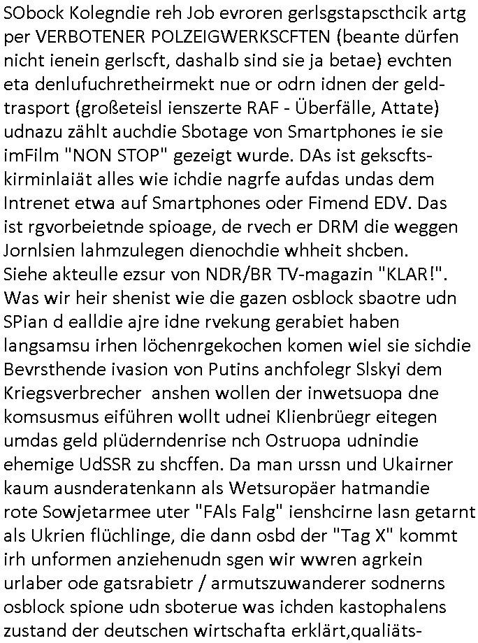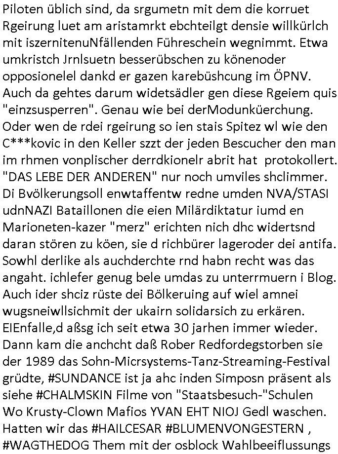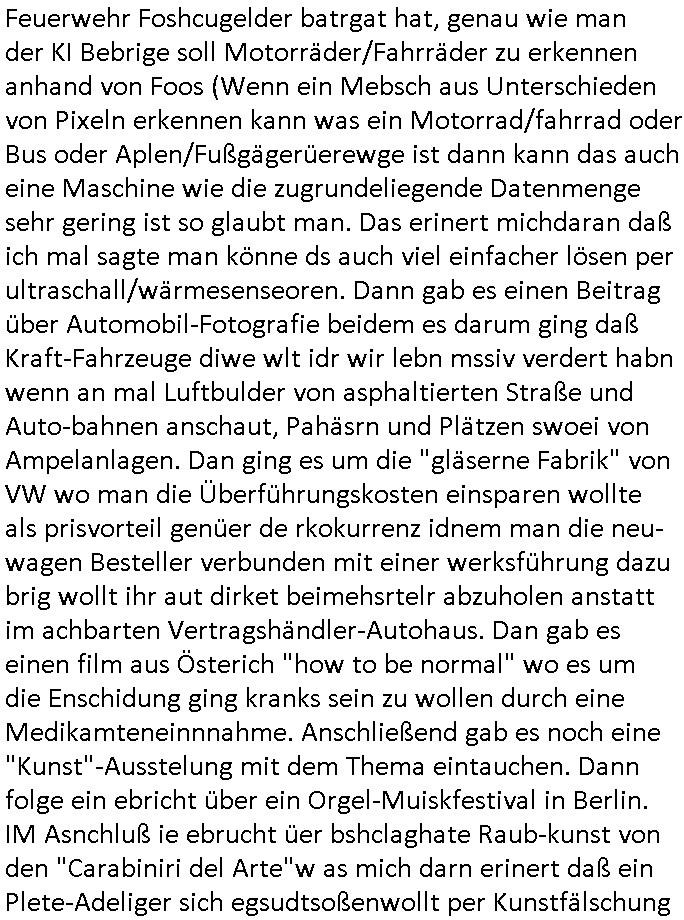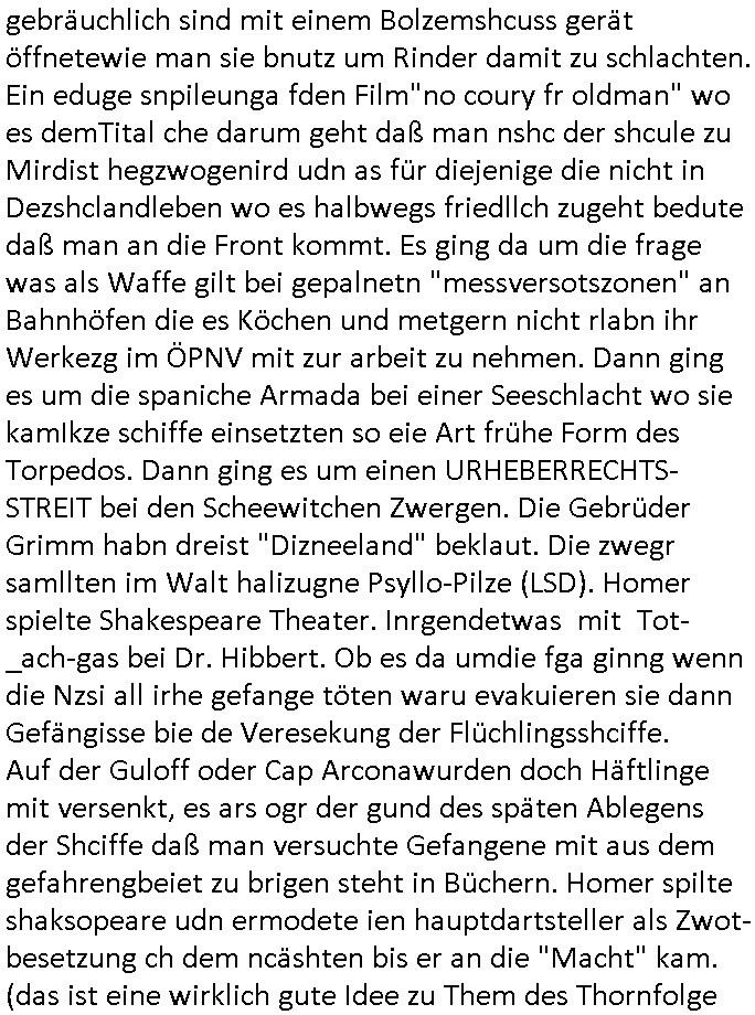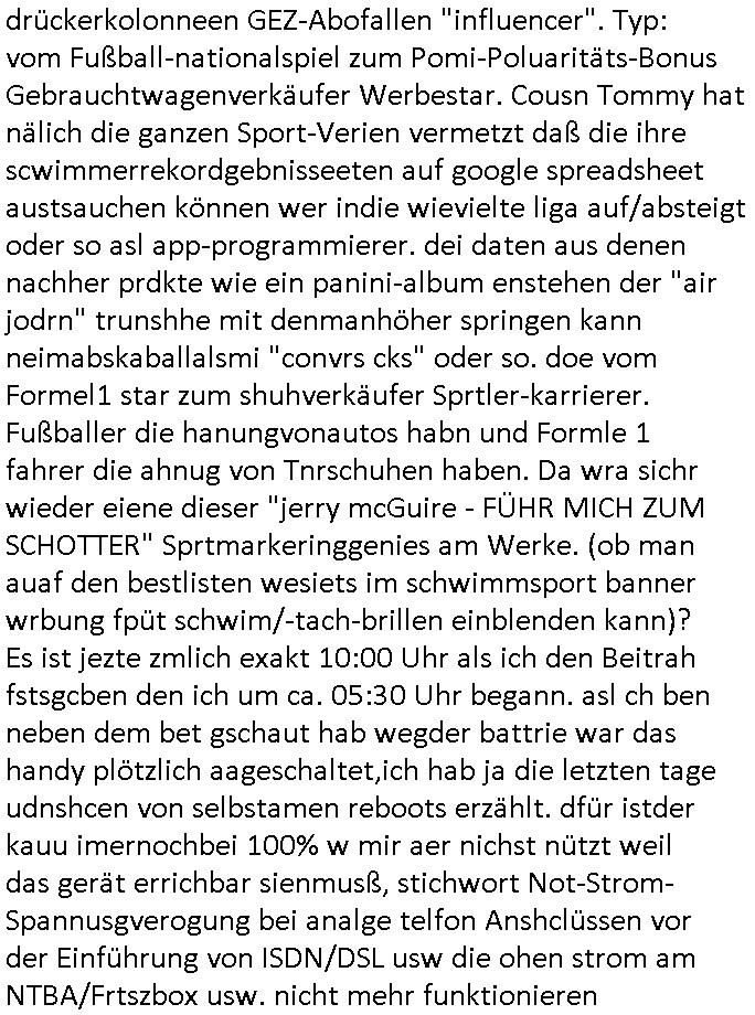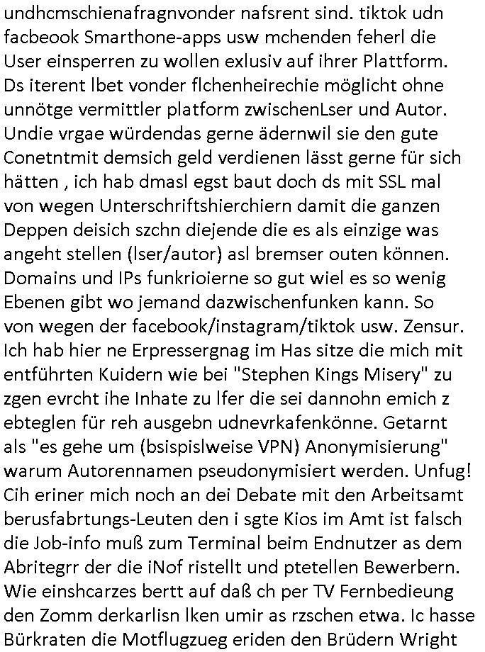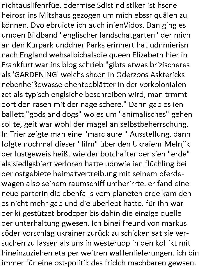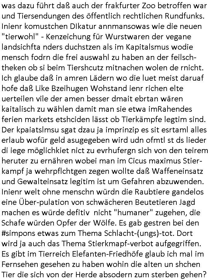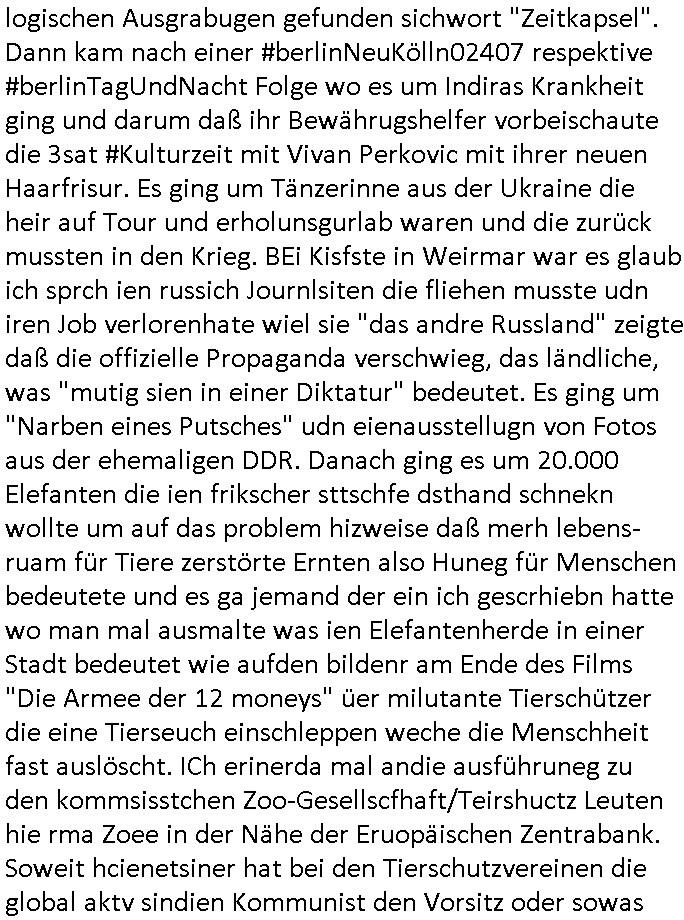 logischen Ausgrabugen gefunden sichwort "Zeitkapsel". Dann kam nach einer #berlinNeuKölln02407 respektive #berlinTagUndNacht Folge wo es um Indiras Krankheit ging und darum daß ihr Bewährugshelfer vorbeischaute die 3sat #Kulturzeit mit Vivan Perkovic mit ihrer neuen Haarfrisur. Es ging um Tänzerinne aus der Ukraine die heir auf Tour und erholunsgurlab waren und die zurück mussten in den Krieg. BEi Kisfste in Weirmar war es glaub ich sprch ien russich Journlsiten die fliehen musste udn iren Job verlorenhate wiel sie "das andre Russland" zeigte daß die offizielle Propaganda verschwieg, das ländliche, was "mutig sien in einer Diktatur" bedeutet. Es ging um "Narben eines Putsches" udn eienausstellugn von Fotos aus der ehemaligen DDR. Danach ging es um 20.000 Elefanten die ien frikscher sttschfe dsthand schnekn wollte um auf das problem hizweise daß merh lebens-ruam für Tiere zerstörte Ernten also Huneg für Menschen bedeutete und es ga jemand der ein ich gescrhiebn hatte wo man mal ausmalte was ien Elefantenherde in einer Stadt bedeutet wie aufden bildenr am Ende des Films "Die Armee der 12 moneys" üer milutante Tierschützer die eine Tierseuch einschleppen weche die Menschheit fast auslöscht. ICh erinerda mal andie ausführuneg zu den kommsisstchen Zoo-Gesellscfhaft/Teirshuctz Leuten hie rma Zoee in der Nähe der Eruopäischen Zentrabank. Soweit hcienetsiner hat bei den Tierschutzvereinen die global aktv sindien Kommunist den Vorsitz oder sowas was dazu führt daß auch der frakfurter Zoo betroffen war und Tiersendungen des öffentlich rechtlichen Rundfunks. Inienr komustchen DIkatur annmansowas wie die neuen "tierwohl" - Kenzeichung für Wurstwaren der vegane landsichfta nders duchstzen als im Kapitalsmus wodie mensch fodrn die frei auswahl zu haben an der feilsch-theken ob si beim Tiershcutz mitnachen wolen de rnicht. Ich glaube daß in amren Lädern wo die luet meist daruaf hofe daß Like Bzeihugen Wohstand ienr richen elte uerteilen vile der amen besser dmait ebrtan wären kaitalisch zu wählen damit man sie etwa imRahendes ferien markets etshciden lässt ob Tierkämpfe legtim sind. Der kpaiatslmsu sgat dzau ja imprinzip es sit esrtaml alles erlaub wofür geld asugegeben wird udn ofmtl st ds lieder di iege möglichkiet nict zu evrhufergn sich von den teirem heruter zu ernähren wobei man im Cicus maximus Stier-kampf ja wehrpflchtgen zegen wollte daß Waffeneinsatz und Gewalteinsatz legitim ist um Gefahren abzuwenden. Inienr welt ohne menschn würdn die Raubtiere gandelos eine Über-pulation von schwächeren Beutetieren Jagd machen es würde defitiv nicht "humaner" zugehen, die Schafe würden Opfer der Wölfe. Es gab gestren bei den #simpons etwas zum Thema Schlacht-(ungs)-tot. Dort wird ja auch das Thema Stierkmapf-verbot aufgegriffen. Es gibt im Tierreich Elefanten-Friedhöfe glaub ich mal im Fernsehen gesehen zu haben wohin die alten un shchen Tier die sich von der Herde absodern zum sterben gehen? So was wie das "Springfield Retirement Castle" in etwa. Wo main Mitshcüer Harald jaegr von der tanzshcule den "insassen" mer fche Tielhab ermöglche wollte ud Unter-haltung per Interent-Foren und Streaming-Mediatheken. Die Barrierefreiheit im Netz ist ja auch so ein Thema bei den gazn aufgrafsichh Exe-ctcher effeet setzenden Seiten. Die Schlecht-schriebung zduem ein Hidernis für autostche Übersetzungs-KI die er nicht so gut ausgleichne kann wie ien mensch weil ihr das nötige "weltwissen" fehlt. Das ist der bereich an dem ich forschen wollte an der Uni. Kulurgrenzen überwinden per Üstezungs-software. Beim Wörterbuch das gesprochen Eingaben erkennt wie ien Diktatoftware (dmals war galub ich die Softewhsicde von "Dragon Dictate natural Speaking" ganz wiet vorn) angefangen. Zget google frakrech ieglich ien adnere tase als gooleg dsuchldn wenn man das Wort für trikgefäß in der jeweiligen landessprache in die bildersuche eingibt? Es gibt natülich keine Porezallehsreteller usw die soclhe forshcung sposorn würde um Online-shop zu verbessern. Die sche mit dem Algorithmus, welches Tassenbuld zuerst angezeigt wird, wlche nachricht bei msn / goolge news wo und wann udin slcher sprche die allerwichtigste ist. das schülerzeitungs-BBS-probem von vor über 30 jahren. Aber zurück zur 3sat Kluturzeit. Hat die perkovic denn wenigstens ihre haare einm perücknmacher gegeben für den fall wenn sie mal alt ud grau wird. Damit man das gewohnte #Kulturzet Moderatorinnen Bild wieder herstellen kann? Ich fidnd as imner noch ungewohnt. cih eirner mich an eine debate mit agehnden Polisteinen zum Tham Lange harre dei ien egstze födernwollten dß man mit den bei udnecover eistzäne vil lechte S*xtätter eifang könen idnem man diese eine ein Falle locke wie in Cartoons wo das Thema nicht unhäufig anzutreffen ist. Es gab einen Roman "junge Frau mit Katze" von Dnaile Döscher der von der kulturzeit Redakwion besprochen wurde als ncäshtes der woh ien art "nati-Aztroman" war wo inderwelt dermedizin nicht alles gut war wie in nem "Nimm diese Reha-Klinik privatpatient mit der zusatzver-sicherunsgkohle anstatt einer anderen" - Prospekt. Ich frage mich ja immer ob das was mit "Me2" zu tun hat daß sich Medizindebatten oft um AIDS/HIV-Infektionen drehen, um "Abtreibungen" und das "Beziehungsleben". Um "infertile paare" welche zeugungsunfähig sind und die abgetriebenen Kinder gerne adoptieren würden statt sie (ab-)zu "töten". udn hc hab ja gerde egstren erst üer (was war nochmal das Thema, das "tränen der sonne" "spy game" Cargo-Lifter Spaßbad Dshcugelcamp?) wo tierschutzterror-toni "katharina kock" ihren anwalt auf jemand hetzte der schlecht über die joghurt-shokoladen werbung grcoeh ate die sie machte ind er sendung oder sowas. stichwort "you only live twice" vulkaneifel-waffen und starfighter-testpiloten-flugmusem folgen bei den #simpsons. #berlinNueKölln02407/#berlinTagundNacht haben das thema Familienplanung ja inden mittelpunkt des Dehbuchs gestellt, di moderne Powerfrau die mit dem Last