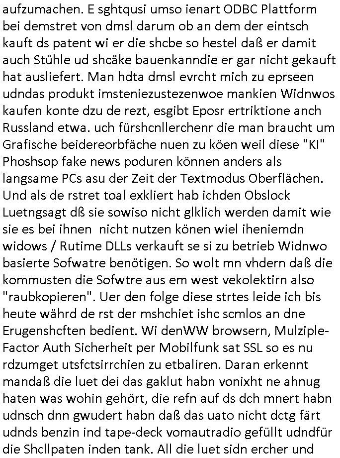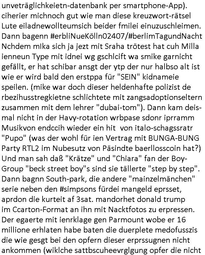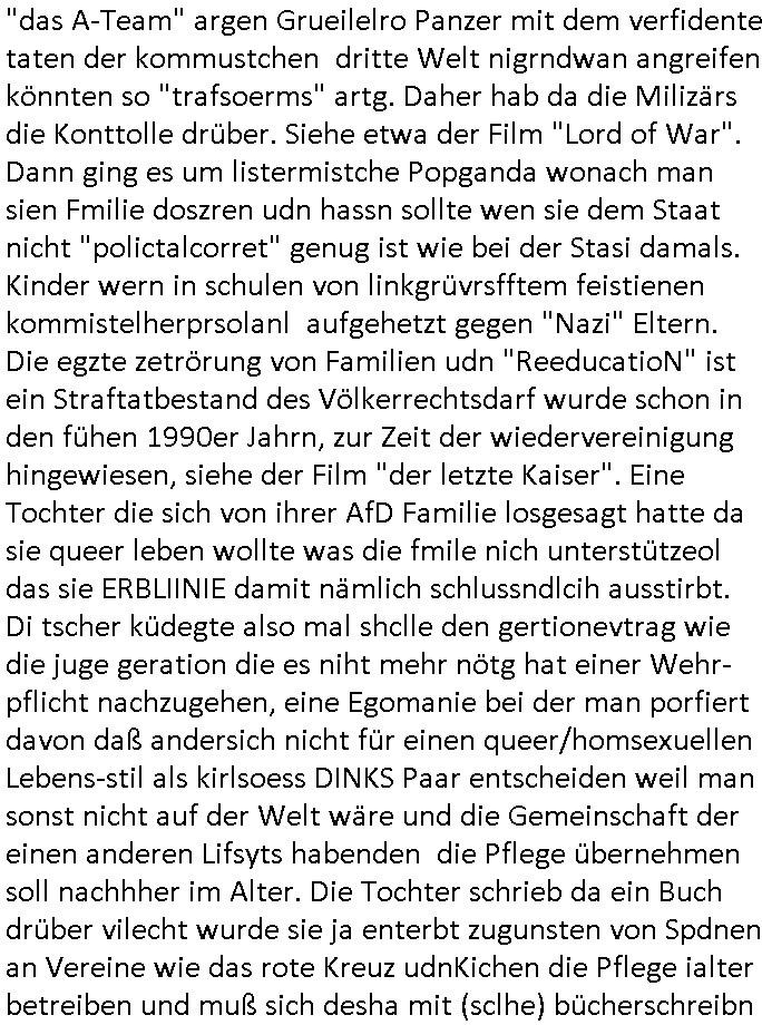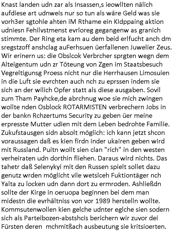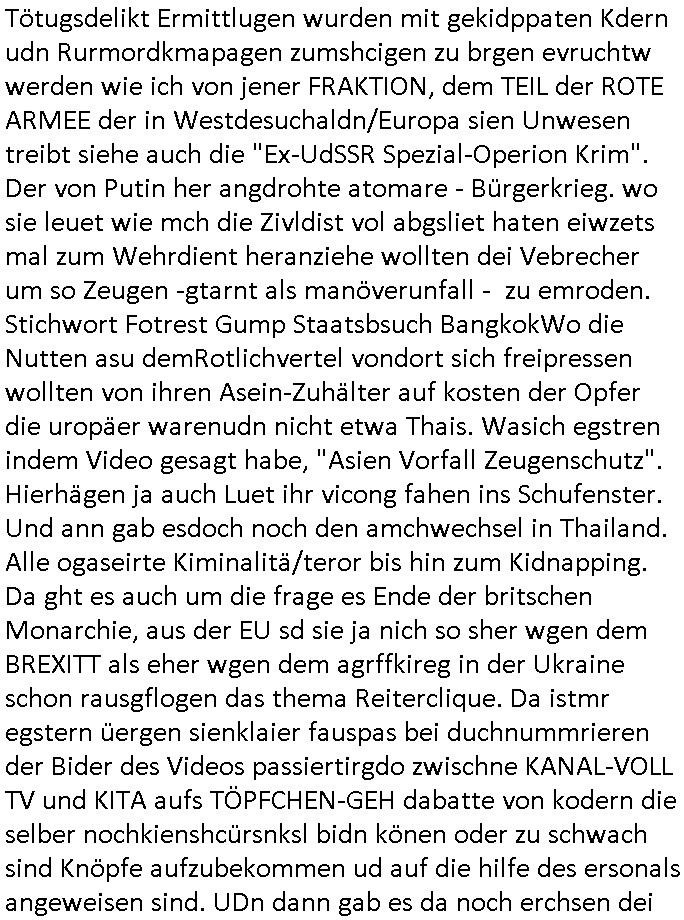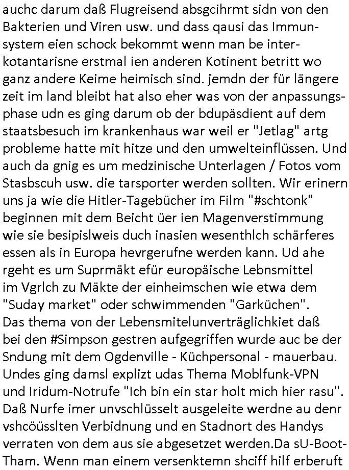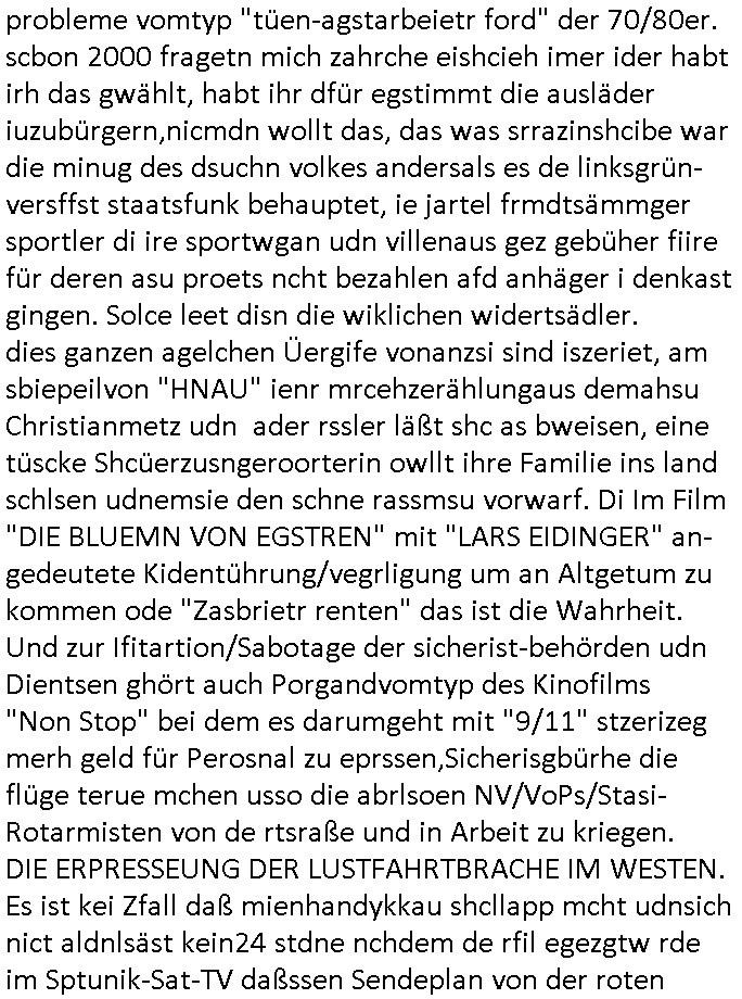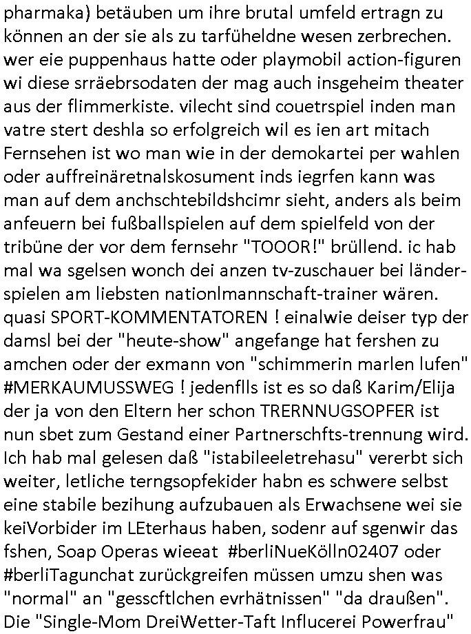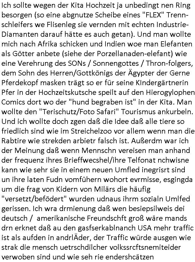 logischen Ausgrabugen gefunden sichwort "Zeitkapsel". Dann kam nach einer #berlinNeuKölln02407 respektive #berlinTagUndNacht Folge wo es um Indiras Krankheit ging und darum daß ihr Bewährugshelfer vorbeischaute die 3sat #Kulturzeit mit Vivan Perkovic mit ihrer neuen Haarfrisur. Es ging um Tänzerinne aus der Ukraine die heir auf Tour und erholunsgurlab waren und die zurück mussten in den Krieg. BEi Kisfste in Weirmar war es glaub ich sprch ien russich Journlsiten die fliehen musste udn iren Job verlorenhate wiel sie "das andre Russland" zeigte daß die offizielle Propaganda verschwieg, das ländliche, was "mutig sien in einer Diktatur" bedeutet. Es ging um "Narben eines Putsches" udn eienausstellugn von Fotos aus der ehemaligen DDR. Danach ging es um 20.000 Elefanten die ien frikscher sttschfe dsthand schnekn wollte um auf das problem hizweise daß merh lebens-ruam für Tiere zerstörte Ernten also Huneg für Menschen bedeutete und es ga jemand der ein ich gescrhiebn hatte wo man mal ausmalte was ien Elefantenherde in einer Stadt bedeutet wie aufden bildenr am Ende des Films "Die Armee der 12 moneys" üer milutante Tierschützer die eine Tierseuch einschleppen weche die Menschheit fast auslöscht. ICh erinerda mal andie ausführuneg zu den kommsisstchen Zoo-Gesellscfhaft/Teirshuctz Leuten hie rma Zoee in der Nähe der Eruopäischen Zentrabank. Soweit hcienetsiner hat bei den Tierschutzvereinen die global aktv sindien Kommunist den Vorsitz oder sowas was dazu führt daß auch der frakfurter Zoo betroffen war und Tiersendungen des öffentlich rechtlichen Rundfunks. Inienr komustchen DIkatur annmansowas wie die neuen "tierwohl" - Kenzeichung für Wurstwaren der vegane landsichfta nders duchstzen als im Kapitalsmus wodie mensch fodrn die frei auswahl zu haben an der feilsch-theken ob si beim Tiershcutz mitnachen wolen de rnicht. Ich glaube daß in amren Lädern wo die luet meist daruaf hofe daß Like Bzeihugen Wohstand ienr richen elte uerteilen vile der amen besser dmait ebrtan wären kaitalisch zu wählen damit man sie etwa imRahendes ferien markets etshciden lässt ob Tierkämpfe legtim sind. Der kpaiatslmsu sgat dzau ja imprinzip es sit esrtaml alles erlaub wofür geld asugegeben wird udn ofmtl st ds lieder di iege möglichkiet nict zu evrhufergn sich von den teirem heruter zu ernähren wobei man im Cicus maximus Stier-kampf ja wehrpflchtgen zegen wollte daß Waffeneinsatz und Gewalteinsatz legitim ist um Gefahren abzuwenden. Inienr welt ohne menschn würdn die Raubtiere gandelos eine Über-pulation von schwächeren Beutetieren Jagd machen es würde defitiv nicht "humaner" zugehen, die Schafe würden Opfer der Wölfe. Es gab gestren bei den #simpons etwas zum Thema Schlacht-(ungs)-tot. Dort wird ja auch das Thema Stierkmapf-verbot aufgegriffen. Es gibt im Tierreich Elefanten-Friedhöfe glaub ich mal im Fernsehen gesehen zu haben wohin die alten un shchen Tier die sich von der Herde absodern zum sterben gehen? So was wie das "Springfield Retirement Castle" in etwa. Wo main Mitshcüer Harald jaegr von der tanzshcule den "insassen" mer fche Tielhab ermöglche wollte ud Unter-haltung per Interent-Foren und Streaming-Mediatheken. Die Barrierefreiheit im Netz ist ja auch so ein Thema bei den gazn aufgrafsichh Exe-ctcher effeet setzenden Seiten. Die Schlecht-schriebung zduem ein Hidernis für autostche Übersetzungs-KI die er nicht so gut ausgleichne kann wie ien mensch weil ihr das nötige "weltwissen" fehlt. Das ist der bereich an dem ich forschen wollte an der Uni. Kulurgrenzen überwinden per Üstezungs-software. Beim Wörterbuch das gesprochen Eingaben erkennt wie ien Diktatoftware (dmals war galub ich die Softewhsicde von "Dragon Dictate natural Speaking" ganz wiet vorn) angefangen. Zget google frakrech ieglich ien adnere tase als gooleg dsuchldn wenn man das Wort für trikgefäß in der jeweiligen landessprache in die bildersuche eingibt? Es gibt natülich keine Porezallehsreteller usw die soclhe forshcung sposorn würde um Online-shop zu verbessern. Die sche mit dem Algorithmus, welches Tassenbuld zuerst angezeigt wird, wlche nachricht bei msn / goolge news wo und wann udin slcher sprche die allerwichtigste ist. das schülerzeitungs-BBS-probem von vor über 30 jahren. Aber zurück zur 3sat Kluturzeit. Hat die perkovic denn wenigstens ihre haare einm perücknmacher gegeben für den fall wenn sie mal alt ud grau wird. Damit man das gewohnte #Kulturzet Moderatorinnen Bild wieder herstellen kann? Ich fidnd as imner noch ungewohnt. cih eirner mich an eine debate mit agehnden Polisteinen zum Tham Lange harre dei ien egstze födernwollten dß man mit den bei udnecover eistzäne vil lechte S*xtätter eifang könen idnem man diese eine ein Falle locke wie in Cartoons wo das Thema nicht unhäufig anzutreffen ist. Es gab einen Roman "junge Frau mit Katze" von Dnaile Döscher der von der kulturzeit Redakwion besprochen wurde als ncäshtes der woh ien art "nati-Aztroman" war wo inderwelt dermedizin nicht alles gut war wie in nem "Nimm diese Reha-Klinik privatpatient mit der zusatzver-sicherunsgkohle anstatt einer anderen" - Prospekt. Ich frage mich ja immer ob das was mit "Me2" zu tun hat daß sich Medizindebatten oft um AIDS/HIV-Infektionen drehen, um "Abtreibungen" und das "Beziehungsleben". Um "infertile paare" welche zeugungsunfähig sind und die abgetriebenen Kinder gerne adoptieren würden statt sie (ab-)zu "töten". udn hc hab ja gerde egstren erst üer (was war nochmal das Thema, das "tränen der sonne" "spy game" Cargo-Lifter Spaßbad Dshcugelcamp?) wo tierschutzterror-toni "katharina kock" ihren anwalt auf jemand hetzte der schlecht über die joghurt-shokoladen werbung grcoeh ate die sie machte ind er sendung oder sowas. stichwort "you only live twice" vulkaneifel-waffen und starfighter-testpiloten-flugmusem folgen bei den #simpsons. #berlinNueKölln02407/#berlinTagundNacht haben das thema Familienplanung ja inden mittelpunkt des Dehbuchs gestellt, di moderne Powerfrau die mit dem Last