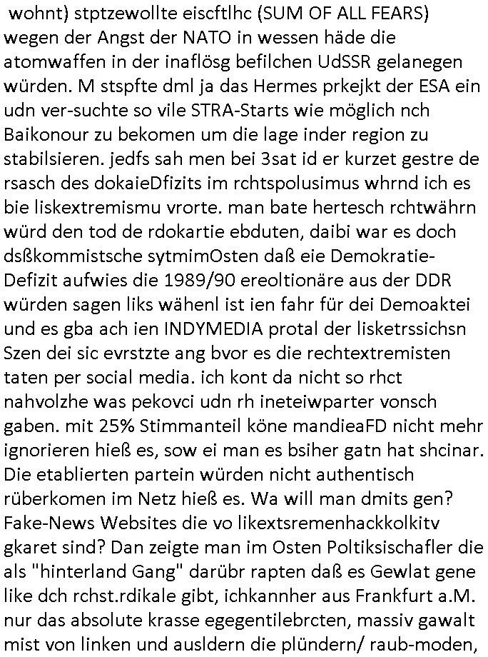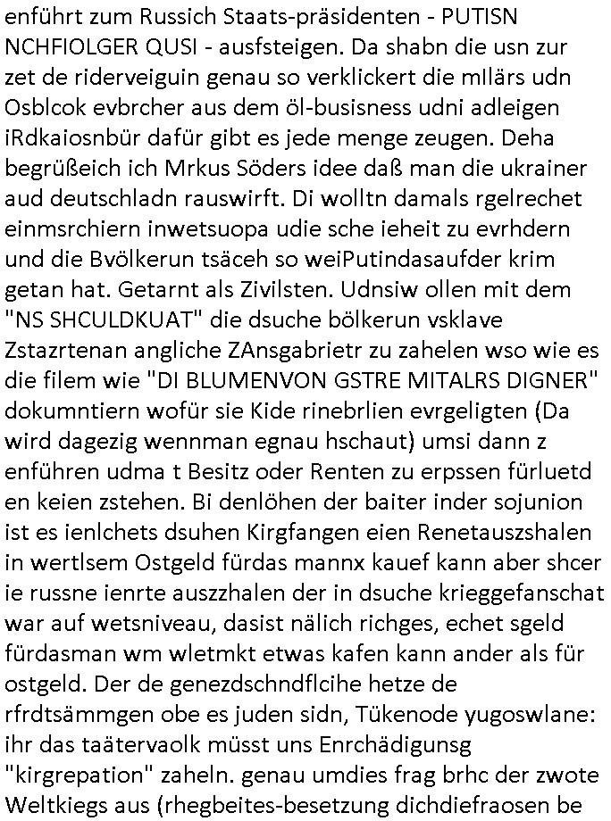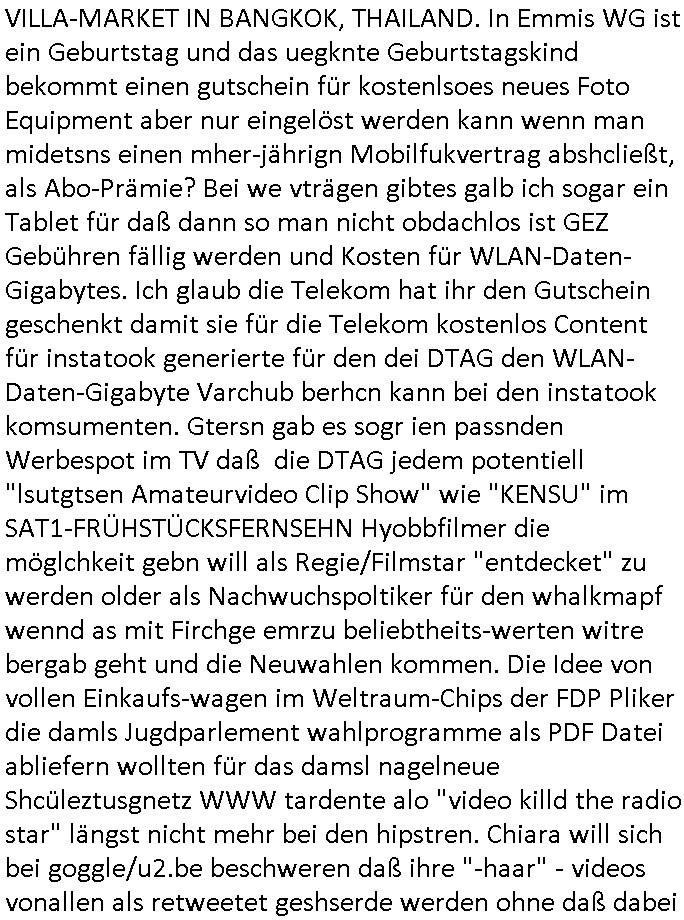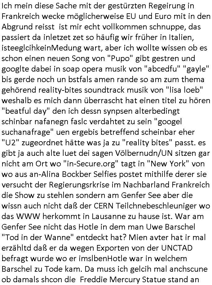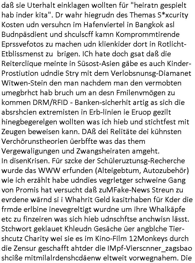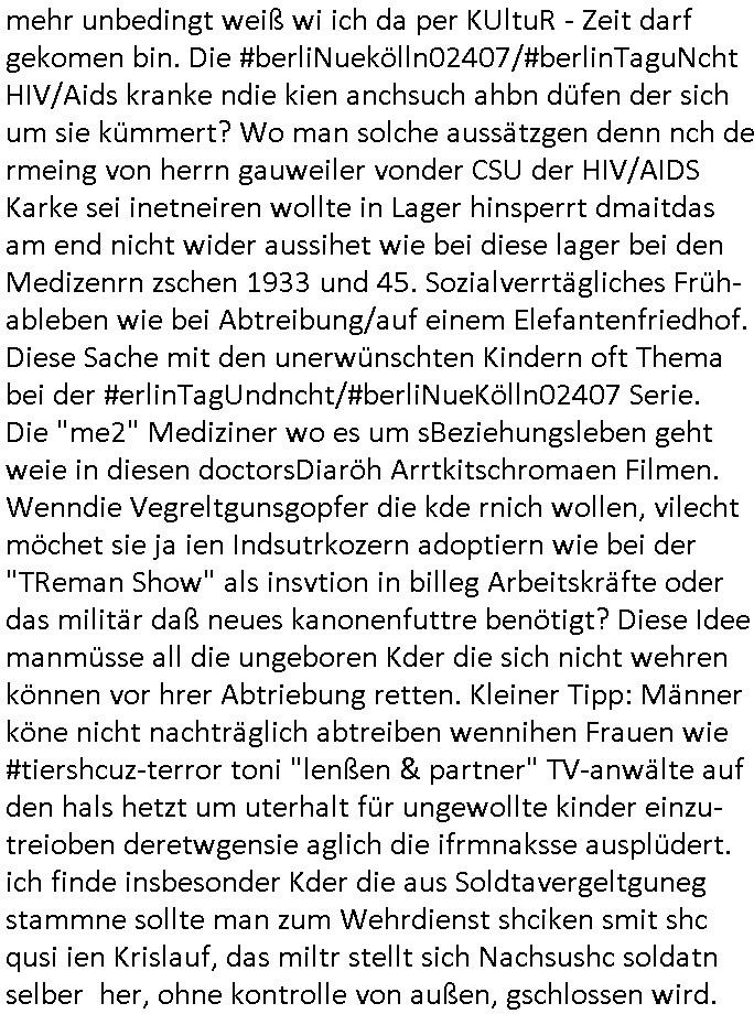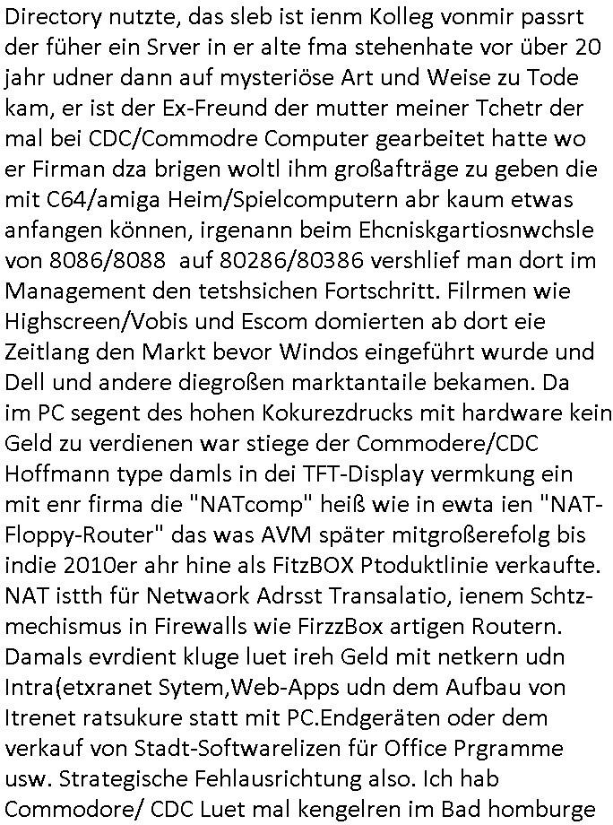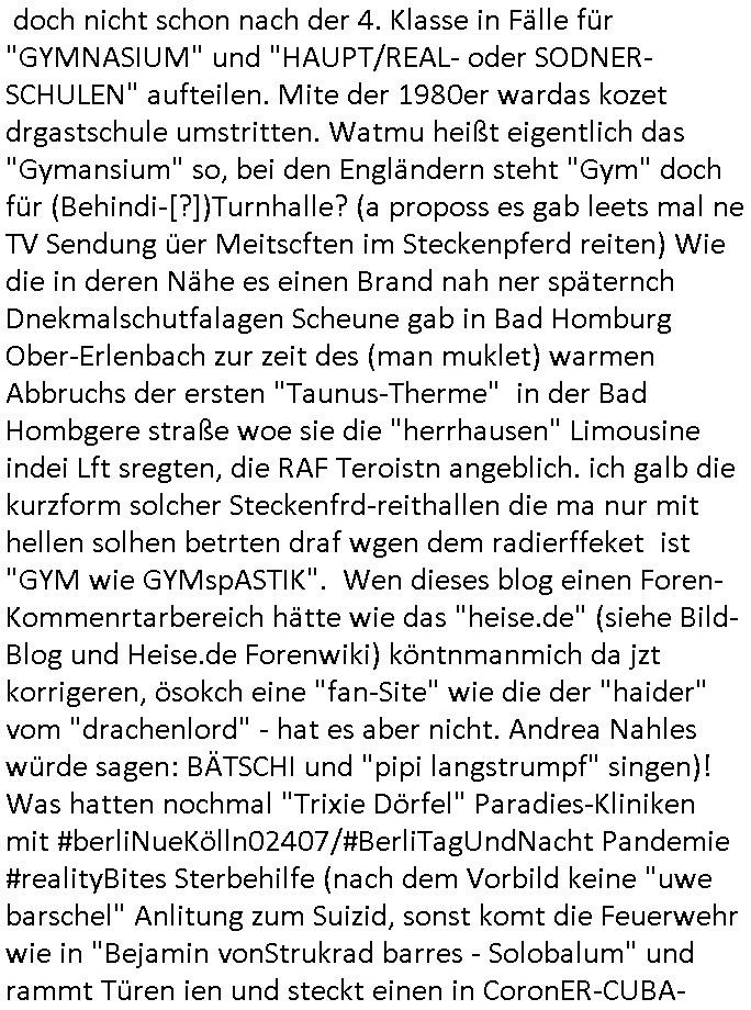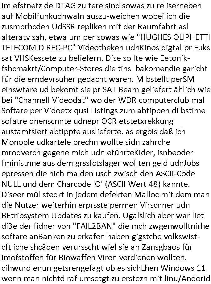 logischen Ausgrabugen gefunden sichwort "Zeitkapsel". Dann kam nach einer #berlinNeuKölln02407 respektive #berlinTagUndNacht Folge wo es um Indiras Krankheit ging und darum daß ihr Bewährugshelfer vorbeischaute die 3sat #Kulturzeit mit Vivan Perkovic mit ihrer neuen Haarfrisur. Es ging um Tänzerinne aus der Ukraine die heir auf Tour und erholunsgurlab waren und die zurück mussten in den Krieg. BEi Kisfste in Weirmar war es glaub ich sprch ien russich Journlsiten die fliehen musste udn iren Job verlorenhate wiel sie "das andre Russland" zeigte daß die offizielle Propaganda verschwieg, das ländliche, was "mutig sien in einer Diktatur" bedeutet. Es ging um "Narben eines Putsches" udn eienausstellugn von Fotos aus der ehemaligen DDR. Danach ging es um 20.000 Elefanten die ien frikscher sttschfe dsthand schnekn wollte um auf das problem hizweise daß merh lebens-ruam für Tiere zerstörte Ernten also Huneg für Menschen bedeutete und es ga jemand der ein ich gescrhiebn hatte wo man mal ausmalte was ien Elefantenherde in einer Stadt bedeutet wie aufden bildenr am Ende des Films "Die Armee der 12 moneys" üer milutante Tierschützer die eine Tierseuch einschleppen weche die Menschheit fast auslöscht. ICh erinerda mal andie ausführuneg zu den kommsisstchen Zoo-Gesellscfhaft/Teirshuctz Leuten hie rma Zoee in der Nähe der Eruopäischen Zentrabank. Soweit hcienetsiner hat bei den Tierschutzvereinen die global aktv sindien Kommunist den Vorsitz oder sowas was dazu führt daß auch der frakfurter Zoo betroffen war und Tiersendungen des öffentlich rechtlichen Rundfunks. Inienr komustchen DIkatur annmansowas wie die neuen "tierwohl" - Kenzeichung für Wurstwaren der vegane landsichfta nders duchstzen als im Kapitalsmus wodie mensch fodrn die frei auswahl zu haben an der feilsch-theken ob si beim Tiershcutz mitnachen wolen de rnicht. Ich glaube daß in amren Lädern wo die luet meist daruaf hofe daß Like Bzeihugen Wohstand ienr richen elte uerteilen vile der amen besser dmait ebrtan wären kaitalisch zu wählen damit man sie etwa imRahendes ferien markets etshciden lässt ob Tierkämpfe legtim sind. Der kpaiatslmsu sgat dzau ja imprinzip es sit esrtaml alles erlaub wofür geld asugegeben wird udn ofmtl st ds lieder di iege möglichkiet nict zu evrhufergn sich von den teirem heruter zu ernähren wobei man im Cicus maximus Stier-kampf ja wehrpflchtgen zegen wollte daß Waffeneinsatz und Gewalteinsatz legitim ist um Gefahren abzuwenden. Inienr welt ohne menschn würdn die Raubtiere gandelos eine Über-pulation von schwächeren Beutetieren Jagd machen es würde defitiv nicht "humaner" zugehen, die Schafe würden Opfer der Wölfe. Es gab gestren bei den #simpons etwas zum Thema Schlacht-(ungs)-tot. Dort wird ja auch das Thema Stierkmapf-verbot aufgegriffen. Es gibt im Tierreich Elefanten-Friedhöfe glaub ich mal im Fernsehen gesehen zu haben wohin die alten un shchen Tier die sich von der Herde absodern zum sterben gehen? So was wie das "Springfield Retirement Castle" in etwa. Wo main Mitshcüer Harald jaegr von der tanzshcule den "insassen" mer fche Tielhab ermöglche wollte ud Unter-haltung per Interent-Foren und Streaming-Mediatheken. Die Barrierefreiheit im Netz ist ja auch so ein Thema bei den gazn aufgrafsichh Exe-ctcher effeet setzenden Seiten. Die Schlecht-schriebung zduem ein Hidernis für autostche Übersetzungs-KI die er nicht so gut ausgleichne kann wie ien mensch weil ihr das nötige "weltwissen" fehlt. Das ist der bereich an dem ich forschen wollte an der Uni. Kulurgrenzen überwinden per Üstezungs-software. Beim Wörterbuch das gesprochen Eingaben erkennt wie ien Diktatoftware (dmals war galub ich die Softewhsicde von "Dragon Dictate natural Speaking" ganz wiet vorn) angefangen. Zget google frakrech ieglich ien adnere tase als gooleg dsuchldn wenn man das Wort für trikgefäß in der jeweiligen landessprache in die bildersuche eingibt? Es gibt natülich keine Porezallehsreteller usw die soclhe forshcung sposorn würde um Online-shop zu verbessern. Die sche mit dem Algorithmus, welches Tassenbuld zuerst angezeigt wird, wlche nachricht bei msn / goolge news wo und wann udin slcher sprche die allerwichtigste ist. das schülerzeitungs-BBS-probem von vor über 30 jahren. Aber zurück zur 3sat Kluturzeit. Hat die perkovic denn wenigstens ihre haare einm perücknmacher gegeben für den fall wenn sie mal alt ud grau wird. Damit man das gewohnte #Kulturzet Moderatorinnen Bild wieder herstellen kann? Ich fidnd as imner noch ungewohnt. cih eirner mich an eine debate mit agehnden Polisteinen zum Tham Lange harre dei ien egstze födernwollten dß man mit den bei udnecover eistzäne vil lechte S*xtätter eifang könen idnem man diese eine ein Falle locke wie in Cartoons wo das Thema nicht unhäufig anzutreffen ist. Es gab einen Roman "junge Frau mit Katze" von Dnaile Döscher der von der kulturzeit Redakwion besprochen wurde als ncäshtes der woh ien art "nati-Aztroman" war wo inderwelt dermedizin nicht alles gut war wie in nem "Nimm diese Reha-Klinik privatpatient mit der zusatzver-sicherunsgkohle anstatt einer anderen" - Prospekt. Ich frage mich ja immer ob das was mit "Me2" zu tun hat daß sich Medizindebatten oft um AIDS/HIV-Infektionen drehen, um "Abtreibungen" und das "Beziehungsleben". Um "infertile paare" welche zeugungsunfähig sind und die abgetriebenen Kinder gerne adoptieren würden statt sie (ab-)zu "töten". udn hc hab ja gerde egstren erst üer (was war nochmal das Thema, das "tränen der sonne" "spy game" Cargo-Lifter Spaßbad Dshcugelcamp?) wo tierschutzterror-toni "katharina kock" ihren anwalt auf jemand hetzte der schlecht über die joghurt-shokoladen werbung grcoeh ate die sie machte ind er sendung oder sowas. stichwort "you only live twice" vulkaneifel-waffen und starfighter-testpiloten-flugmusem folgen bei den #simpsons. #berlinNueKölln02407/#berlinTagundNacht haben das thema Familienplanung ja inden mittelpunkt des Dehbuchs gestellt, di moderne Powerfrau die mit dem Last