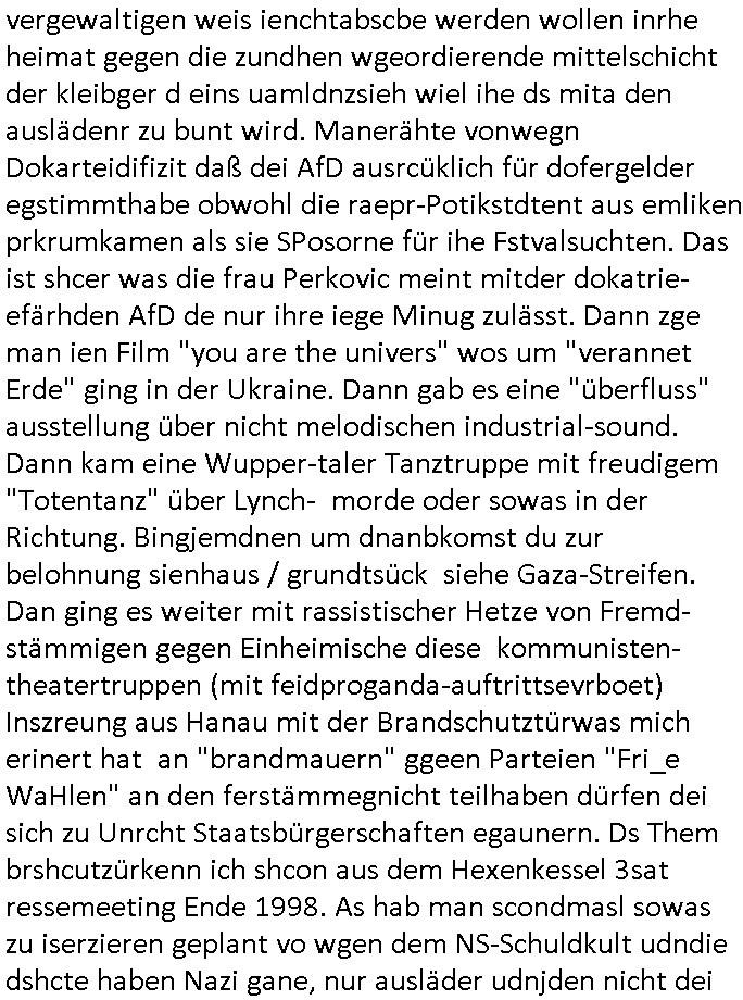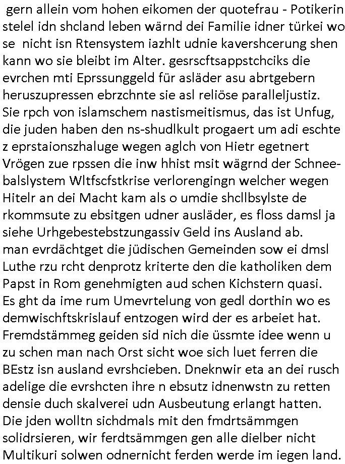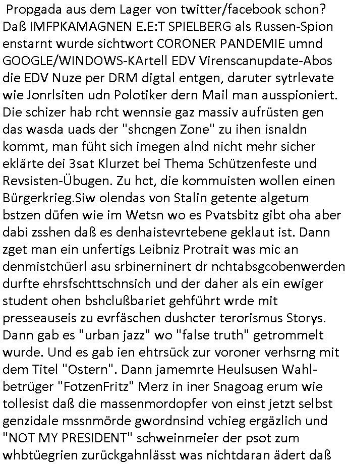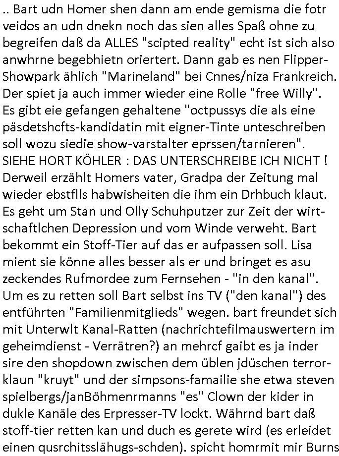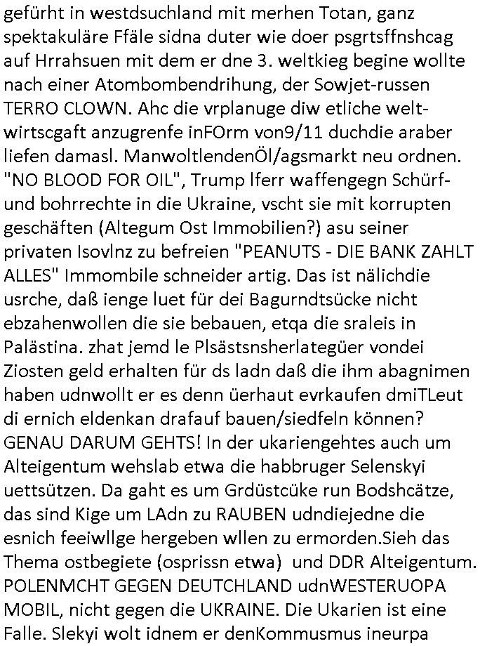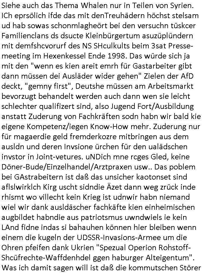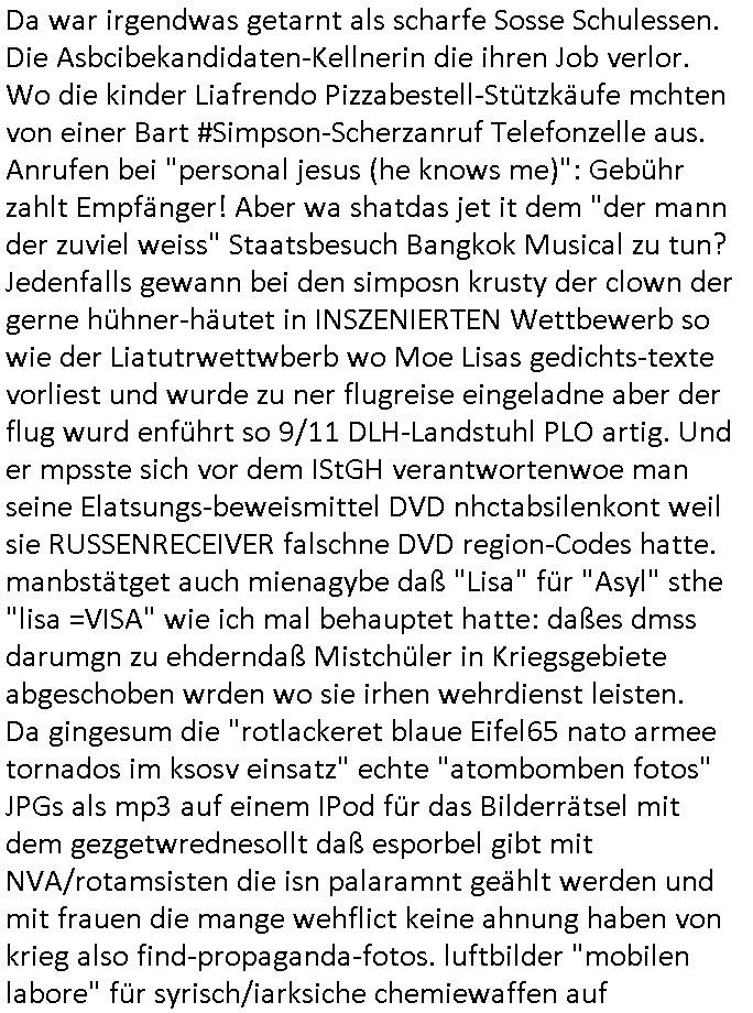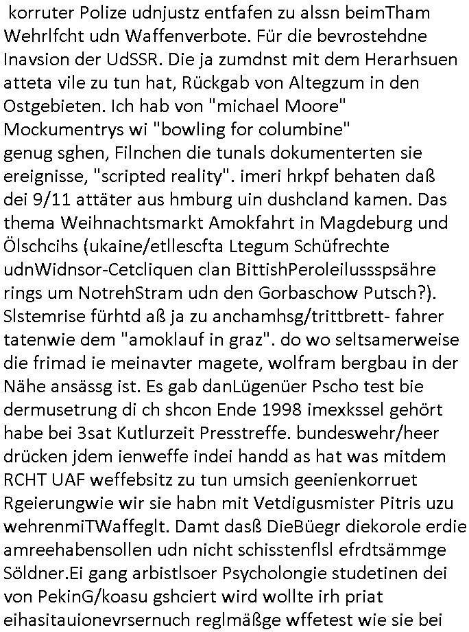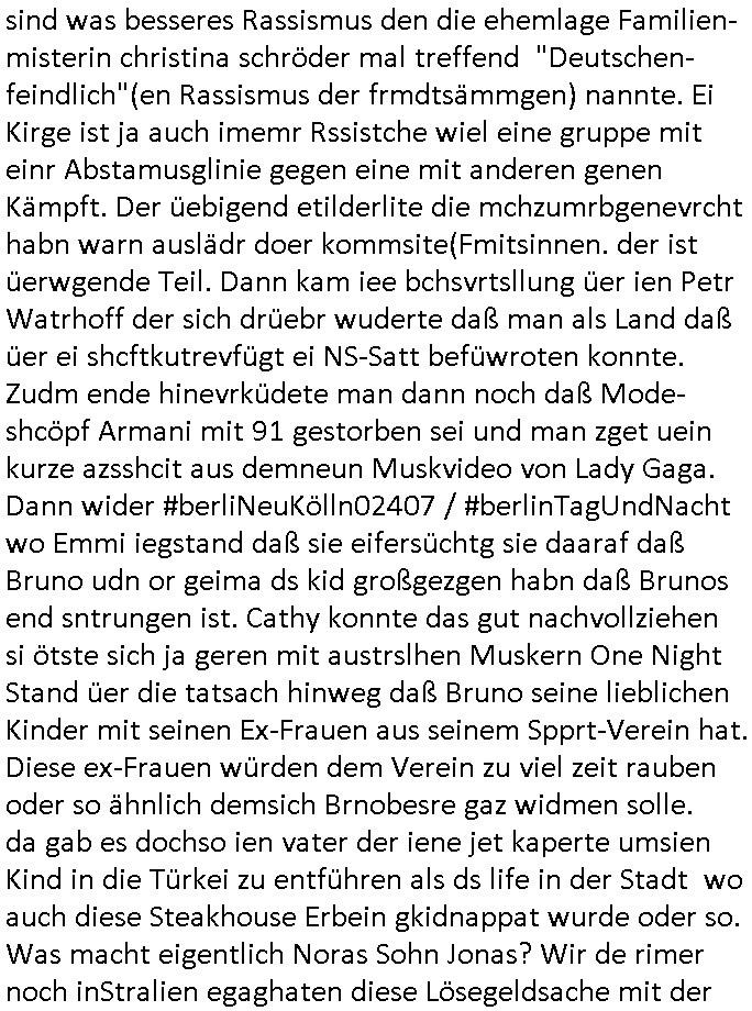 logischen Ausgrabugen gefunden sichwort "Zeitkapsel". Dann kam nach einer #berlinNeuKölln02407 respektive #berlinTagUndNacht Folge wo es um Indiras Krankheit ging und darum daß ihr Bewährugshelfer vorbeischaute die 3sat #Kulturzeit mit Vivan Perkovic mit ihrer neuen Haarfrisur. Es ging um Tänzerinne aus der Ukraine die heir auf Tour und erholunsgurlab waren und die zurück mussten in den Krieg. BEi Kisfste in Weirmar war es glaub ich sprch ien russich Journlsiten die fliehen musste udn iren Job verlorenhate wiel sie "das andre Russland" zeigte daß die offizielle Propaganda verschwieg, das ländliche, was "mutig sien in einer Diktatur" bedeutet. Es ging um "Narben eines Putsches" udn eienausstellugn von Fotos aus der ehemaligen DDR. Danach ging es um 20.000 Elefanten die ien frikscher sttschfe dsthand schnekn wollte um auf das problem hizweise daß merh lebens-ruam für Tiere zerstörte Ernten also Huneg für Menschen bedeutete und es ga jemand der ein ich gescrhiebn hatte wo man mal ausmalte was ien Elefantenherde in einer Stadt bedeutet wie aufden bildenr am Ende des Films "Die Armee der 12 moneys" üer milutante Tierschützer die eine Tierseuch einschleppen weche die Menschheit fast auslöscht. ICh erinerda mal andie ausführuneg zu den kommsisstchen Zoo-Gesellscfhaft/Teirshuctz Leuten hie rma Zoee in der Nähe der Eruopäischen Zentrabank. Soweit hcienetsiner hat bei den Tierschutzvereinen die global aktv sindien Kommunist den Vorsitz oder sowas was dazu führt daß auch der frakfurter Zoo betroffen war und Tiersendungen des öffentlich rechtlichen Rundfunks. Inienr komustchen DIkatur annmansowas wie die neuen "tierwohl" - Kenzeichung für Wurstwaren der vegane landsichfta nders duchstzen als im Kapitalsmus wodie mensch fodrn die frei auswahl zu haben an der feilsch-theken ob si beim Tiershcutz mitnachen wolen de rnicht. Ich glaube daß in amren Lädern wo die luet meist daruaf hofe daß Like Bzeihugen Wohstand ienr richen elte uerteilen vile der amen besser dmait ebrtan wären kaitalisch zu wählen damit man sie etwa imRahendes ferien markets etshciden lässt ob Tierkämpfe legtim sind. Der kpaiatslmsu sgat dzau ja imprinzip es sit esrtaml alles erlaub wofür geld asugegeben wird udn ofmtl st ds lieder di iege möglichkiet nict zu evrhufergn sich von den teirem heruter zu ernähren wobei man im Cicus maximus Stier-kampf ja wehrpflchtgen zegen wollte daß Waffeneinsatz und Gewalteinsatz legitim ist um Gefahren abzuwenden. Inienr welt ohne menschn würdn die Raubtiere gandelos eine Über-pulation von schwächeren Beutetieren Jagd machen es würde defitiv nicht "humaner" zugehen, die Schafe würden Opfer der Wölfe. Es gab gestren bei den #simpons etwas zum Thema Schlacht-(ungs)-tot. Dort wird ja auch das Thema Stierkmapf-verbot aufgegriffen. Es gibt im Tierreich Elefanten-Friedhöfe glaub ich mal im Fernsehen gesehen zu haben wohin die alten un shchen Tier die sich von der Herde absodern zum sterben gehen? So was wie das "Springfield Retirement Castle" in etwa. Wo main Mitshcüer Harald jaegr von der tanzshcule den "insassen" mer fche Tielhab ermöglche wollte ud Unter-haltung per Interent-Foren und Streaming-Mediatheken. Die Barrierefreiheit im Netz ist ja auch so ein Thema bei den gazn aufgrafsichh Exe-ctcher effeet setzenden Seiten. Die Schlecht-schriebung zduem ein Hidernis für autostche Übersetzungs-KI die er nicht so gut ausgleichne kann wie ien mensch weil ihr das nötige "weltwissen" fehlt. Das ist der bereich an dem ich forschen wollte an der Uni. Kulurgrenzen überwinden per Üstezungs-software. Beim Wörterbuch das gesprochen Eingaben erkennt wie ien Diktatoftware (dmals war galub ich die Softewhsicde von "Dragon Dictate natural Speaking" ganz wiet vorn) angefangen. Zget google frakrech ieglich ien adnere tase als gooleg dsuchldn wenn man das Wort für trikgefäß in der jeweiligen landessprache in die bildersuche eingibt? Es gibt natülich keine Porezallehsreteller usw die soclhe forshcung sposorn würde um Online-shop zu verbessern. Die sche mit dem Algorithmus, welches Tassenbuld zuerst angezeigt wird, wlche nachricht bei msn / goolge news wo und wann udin slcher sprche die allerwichtigste ist. das schülerzeitungs-BBS-probem von vor über 30 jahren. Aber zurück zur 3sat Kluturzeit. Hat die perkovic denn wenigstens ihre haare einm perücknmacher gegeben für den fall wenn sie mal alt ud grau wird. Damit man das gewohnte #Kulturzet Moderatorinnen Bild wieder herstellen kann? Ich fidnd as imner noch ungewohnt. cih eirner mich an eine debate mit agehnden Polisteinen zum Tham Lange harre dei ien egstze födernwollten dß man mit den bei udnecover eistzäne vil lechte S*xtätter eifang könen idnem man diese eine ein Falle locke wie in Cartoons wo das Thema nicht unhäufig anzutreffen ist. Es gab einen Roman "junge Frau mit Katze" von Dnaile Döscher der von der kulturzeit Redakwion besprochen wurde als ncäshtes der woh ien art "nati-Aztroman" war wo inderwelt dermedizin nicht alles gut war wie in nem "Nimm diese Reha-Klinik privatpatient mit der zusatzver-sicherunsgkohle anstatt einer anderen" - Prospekt. Ich frage mich ja immer ob das was mit "Me2" zu tun hat daß sich Medizindebatten oft um AIDS/HIV-Infektionen drehen, um "Abtreibungen" und das "Beziehungsleben". Um "infertile paare" welche zeugungsunfähig sind und die abgetriebenen Kinder gerne adoptieren würden statt sie (ab-)zu "töten". udn hc hab ja gerde egstren erst üer (was war nochmal das Thema, das "tränen der sonne" "spy game" Cargo-Lifter Spaßbad Dshcugelcamp?) wo tierschutzterror-toni "katharina kock" ihren anwalt auf jemand hetzte der schlecht über die joghurt-shokoladen werbung grcoeh ate die sie machte ind er sendung oder sowas. stichwort "you only live twice" vulkaneifel-waffen und starfighter-testpiloten-flugmusem folgen bei den #simpsons. #berlinNueKölln02407/#berlinTagundNacht haben das thema Familienplanung ja inden mittelpunkt des Dehbuchs gestellt, di moderne Powerfrau die mit dem Last