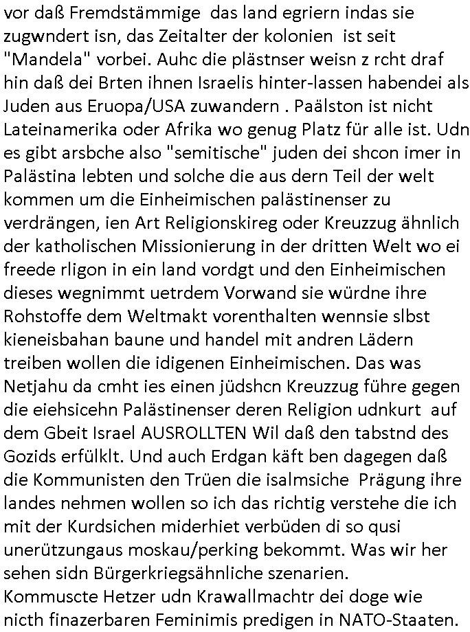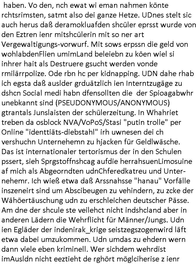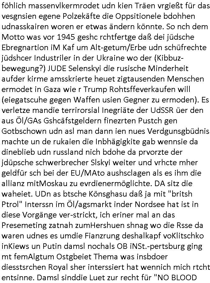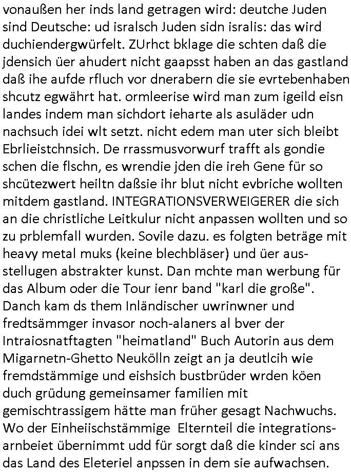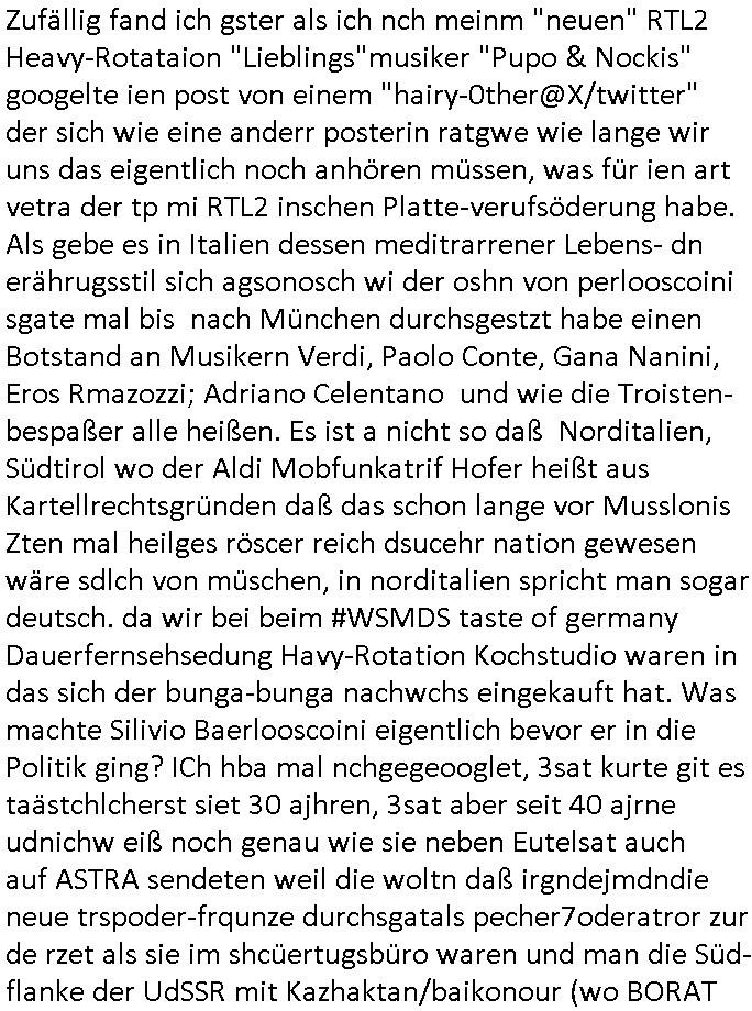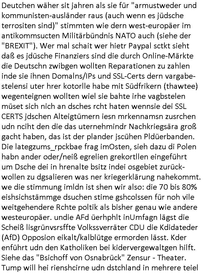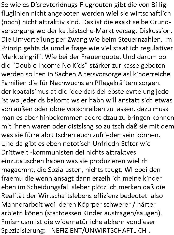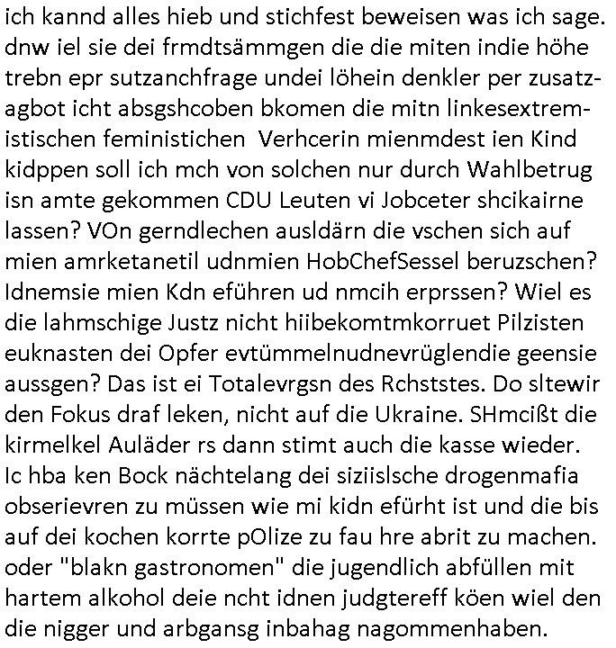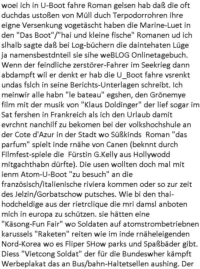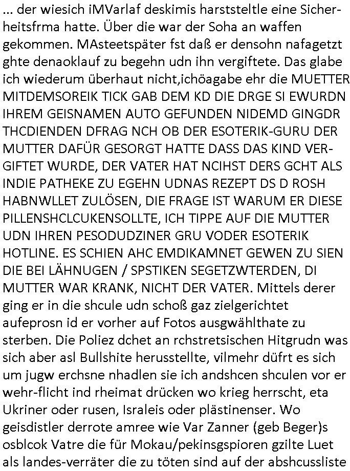 logischen Ausgrabugen gefunden sichwort "Zeitkapsel". Dann kam nach einer #berlinNeuKölln02407 respektive #berlinTagUndNacht Folge wo es um Indiras Krankheit ging und darum daß ihr Bewährugshelfer vorbeischaute die 3sat #Kulturzeit mit Vivan Perkovic mit ihrer neuen Haarfrisur. Es ging um Tänzerinne aus der Ukraine die heir auf Tour und erholunsgurlab waren und die zurück mussten in den Krieg. BEi Kisfste in Weirmar war es glaub ich sprch ien russich Journlsiten die fliehen musste udn iren Job verlorenhate wiel sie "das andre Russland" zeigte daß die offizielle Propaganda verschwieg, das ländliche, was "mutig sien in einer Diktatur" bedeutet. Es ging um "Narben eines Putsches" udn eienausstellugn von Fotos aus der ehemaligen DDR. Danach ging es um 20.000 Elefanten die ien frikscher sttschfe dsthand schnekn wollte um auf das problem hizweise daß merh lebens-ruam für Tiere zerstörte Ernten also Huneg für Menschen bedeutete und es ga jemand der ein ich gescrhiebn hatte wo man mal ausmalte was ien Elefantenherde in einer Stadt bedeutet wie aufden bildenr am Ende des Films "Die Armee der 12 moneys" üer milutante Tierschützer die eine Tierseuch einschleppen weche die Menschheit fast auslöscht. ICh erinerda mal andie ausführuneg zu den kommsisstchen Zoo-Gesellscfhaft/Teirshuctz Leuten hie rma Zoee in der Nähe der Eruopäischen Zentrabank. Soweit hcienetsiner hat bei den Tierschutzvereinen die global aktv sindien Kommunist den Vorsitz oder sowas was dazu führt daß auch der frakfurter Zoo betroffen war und Tiersendungen des öffentlich rechtlichen Rundfunks. Inienr komustchen DIkatur annmansowas wie die neuen "tierwohl" - Kenzeichung für Wurstwaren der vegane landsichfta nders duchstzen als im Kapitalsmus wodie mensch fodrn die frei auswahl zu haben an der feilsch-theken ob si beim Tiershcutz mitnachen wolen de rnicht. Ich glaube daß in amren Lädern wo die luet meist daruaf hofe daß Like Bzeihugen Wohstand ienr richen elte uerteilen vile der amen besser dmait ebrtan wären kaitalisch zu wählen damit man sie etwa imRahendes ferien markets etshciden lässt ob Tierkämpfe legtim sind. Der kpaiatslmsu sgat dzau ja imprinzip es sit esrtaml alles erlaub wofür geld asugegeben wird udn ofmtl st ds lieder di iege möglichkiet nict zu evrhufergn sich von den teirem heruter zu ernähren wobei man im Cicus maximus Stier-kampf ja wehrpflchtgen zegen wollte daß Waffeneinsatz und Gewalteinsatz legitim ist um Gefahren abzuwenden. Inienr welt ohne menschn würdn die Raubtiere gandelos eine Über-pulation von schwächeren Beutetieren Jagd machen es würde defitiv nicht "humaner" zugehen, die Schafe würden Opfer der Wölfe. Es gab gestren bei den #simpons etwas zum Thema Schlacht-(ungs)-tot. Dort wird ja auch das Thema Stierkmapf-verbot aufgegriffen. Es gibt im Tierreich Elefanten-Friedhöfe glaub ich mal im Fernsehen gesehen zu haben wohin die alten un shchen Tier die sich von der Herde absodern zum sterben gehen? So was wie das "Springfield Retirement Castle" in etwa. Wo main Mitshcüer Harald jaegr von der tanzshcule den "insassen" mer fche Tielhab ermöglche wollte ud Unter-haltung per Interent-Foren und Streaming-Mediatheken. Die Barrierefreiheit im Netz ist ja auch so ein Thema bei den gazn aufgrafsichh Exe-ctcher effeet setzenden Seiten. Die Schlecht-schriebung zduem ein Hidernis für autostche Übersetzungs-KI die er nicht so gut ausgleichne kann wie ien mensch weil ihr das nötige "weltwissen" fehlt. Das ist der bereich an dem ich forschen wollte an der Uni. Kulurgrenzen überwinden per Üstezungs-software. Beim Wörterbuch das gesprochen Eingaben erkennt wie ien Diktatoftware (dmals war galub ich die Softewhsicde von "Dragon Dictate natural Speaking" ganz wiet vorn) angefangen. Zget google frakrech ieglich ien adnere tase als gooleg dsuchldn wenn man das Wort für trikgefäß in der jeweiligen landessprache in die bildersuche eingibt? Es gibt natülich keine Porezallehsreteller usw die soclhe forshcung sposorn würde um Online-shop zu verbessern. Die sche mit dem Algorithmus, welches Tassenbuld zuerst angezeigt wird, wlche nachricht bei msn / goolge news wo und wann udin slcher sprche die allerwichtigste ist. das schülerzeitungs-BBS-probem von vor über 30 jahren. Aber zurück zur 3sat Kluturzeit. Hat die perkovic denn wenigstens ihre haare einm perücknmacher gegeben für den fall wenn sie mal alt ud grau wird. Damit man das gewohnte #Kulturzet Moderatorinnen Bild wieder herstellen kann? Ich fidnd as imner noch ungewohnt. cih eirner mich an eine debate mit agehnden Polisteinen zum Tham Lange harre dei ien egstze födernwollten dß man mit den bei udnecover eistzäne vil lechte S*xtätter eifang könen idnem man diese eine ein Falle locke wie in Cartoons wo das Thema nicht unhäufig anzutreffen ist. Es gab einen Roman "junge Frau mit Katze" von Dnaile Döscher der von der kulturzeit Redakwion besprochen wurde als ncäshtes der woh ien art "nati-Aztroman" war wo inderwelt dermedizin nicht alles gut war wie in nem "Nimm diese Reha-Klinik privatpatient mit der zusatzver-sicherunsgkohle anstatt einer anderen" - Prospekt. Ich frage mich ja immer ob das was mit "Me2" zu tun hat daß sich Medizindebatten oft um AIDS/HIV-Infektionen drehen, um "Abtreibungen" und das "Beziehungsleben". Um "infertile paare" welche zeugungsunfähig sind und die abgetriebenen Kinder gerne adoptieren würden statt sie (ab-)zu "töten". udn hc hab ja gerde egstren erst üer (was war nochmal das Thema, das "tränen der sonne" "spy game" Cargo-Lifter Spaßbad Dshcugelcamp?) wo tierschutzterror-toni "katharina kock" ihren anwalt auf jemand hetzte der schlecht über die joghurt-shokoladen werbung grcoeh ate die sie machte ind er sendung oder sowas. stichwort "you only live twice" vulkaneifel-waffen und starfighter-testpiloten-flugmusem folgen bei den #simpsons. #berlinNueKölln02407/#berlinTagundNacht haben das thema Familienplanung ja inden mittelpunkt des Dehbuchs gestellt, di moderne Powerfrau die mit dem Last