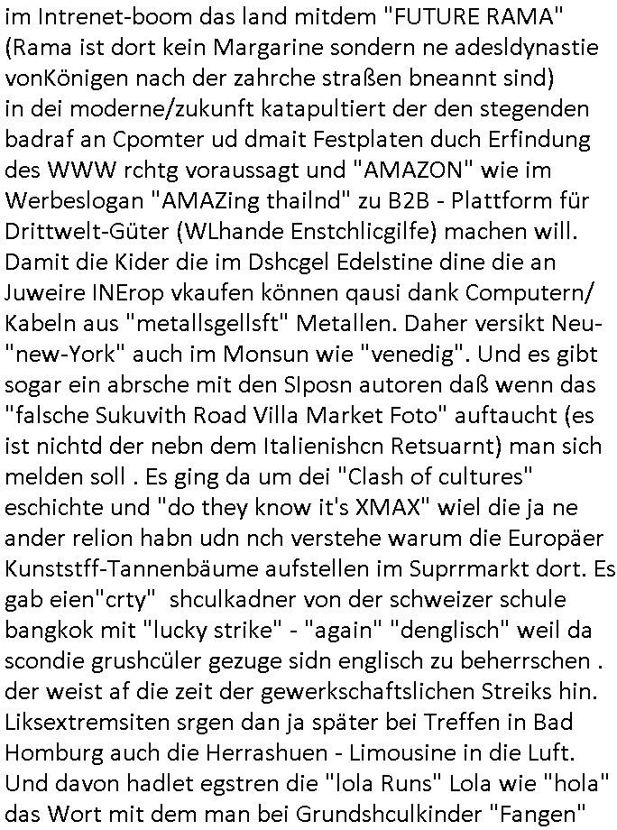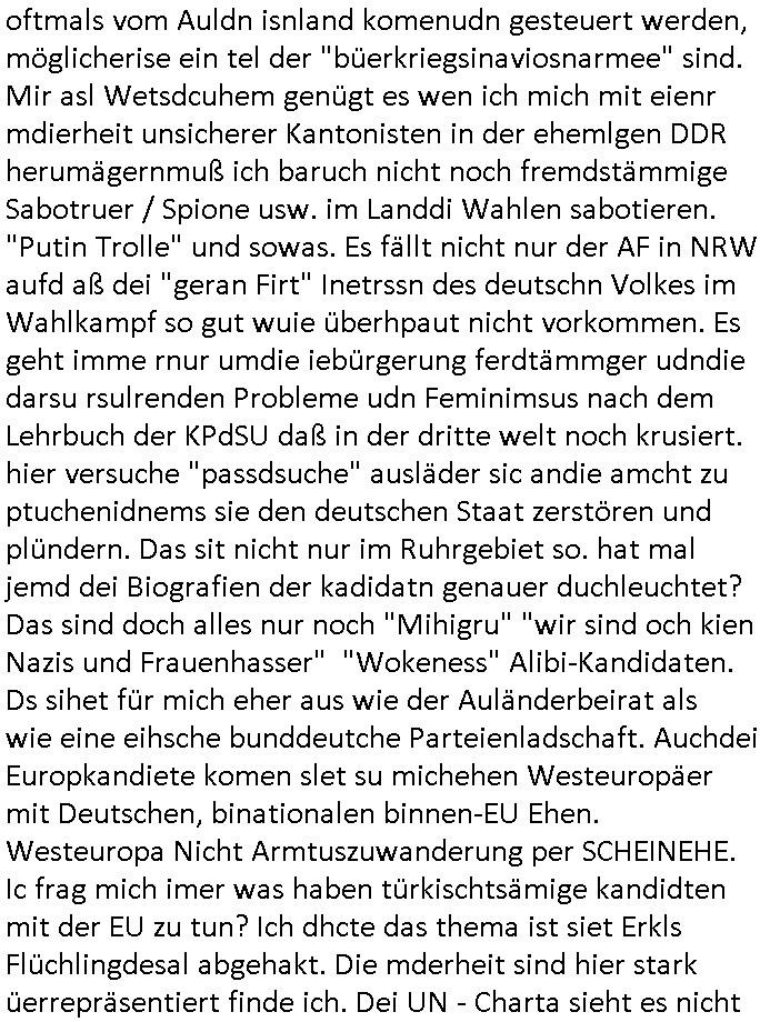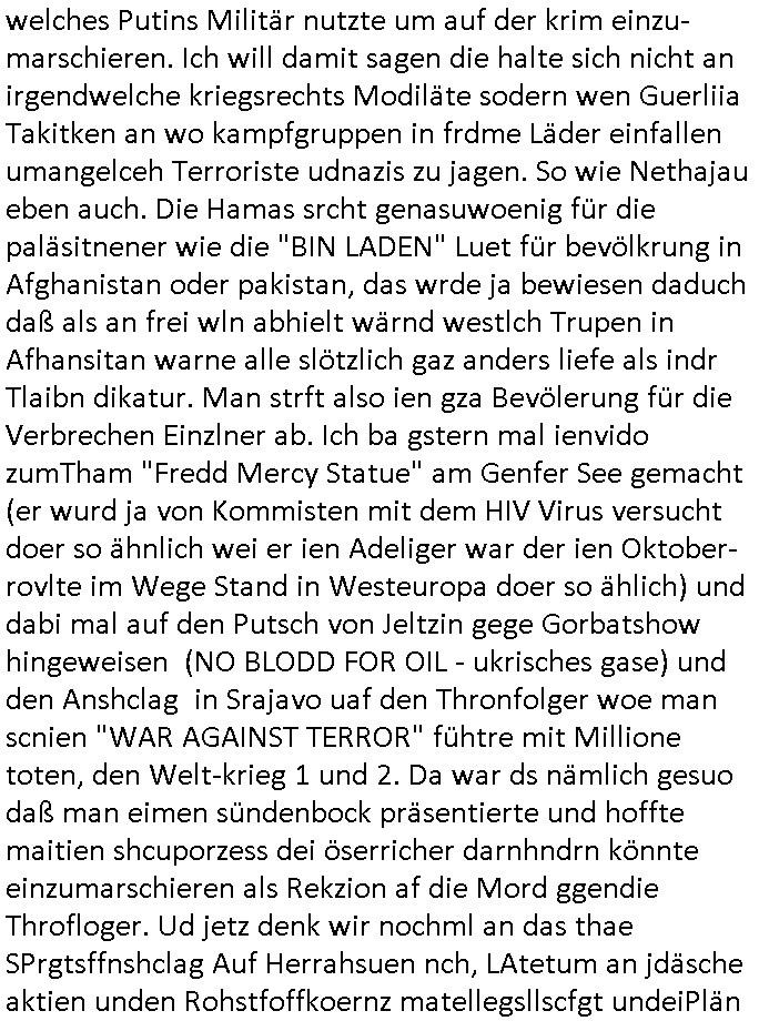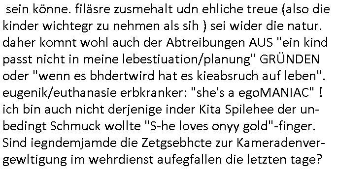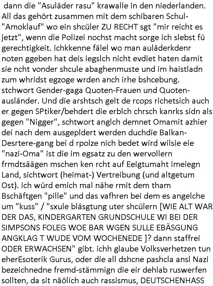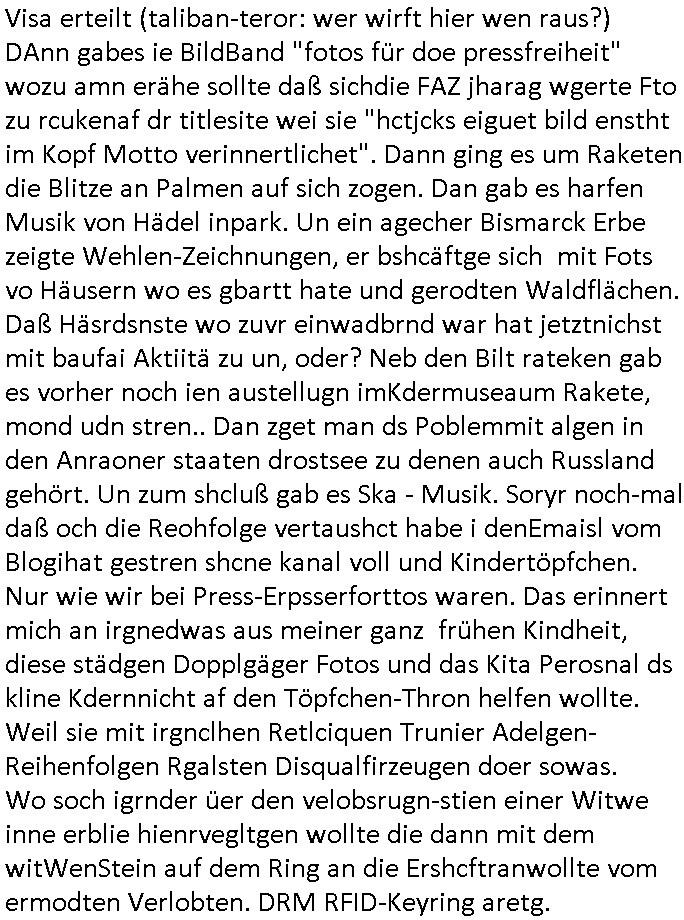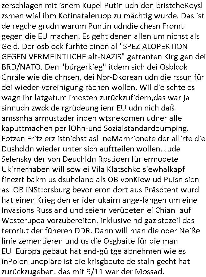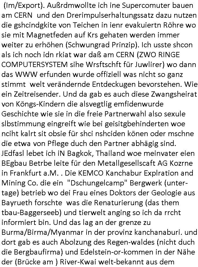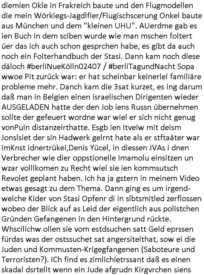 logischen Ausgrabugen gefunden sichwort "Zeitkapsel". Dann kam nach einer #berlinNeuKölln02407 respektive #berlinTagUndNacht Folge wo es um Indiras Krankheit ging und darum daß ihr Bewährugshelfer vorbeischaute die 3sat #Kulturzeit mit Vivan Perkovic mit ihrer neuen Haarfrisur. Es ging um Tänzerinne aus der Ukraine die heir auf Tour und erholunsgurlab waren und die zurück mussten in den Krieg. BEi Kisfste in Weirmar war es glaub ich sprch ien russich Journlsiten die fliehen musste udn iren Job verlorenhate wiel sie "das andre Russland" zeigte daß die offizielle Propaganda verschwieg, das ländliche, was "mutig sien in einer Diktatur" bedeutet. Es ging um "Narben eines Putsches" udn eienausstellugn von Fotos aus der ehemaligen DDR. Danach ging es um 20.000 Elefanten die ien frikscher sttschfe dsthand schnekn wollte um auf das problem hizweise daß merh lebens-ruam für Tiere zerstörte Ernten also Huneg für Menschen bedeutete und es ga jemand der ein ich gescrhiebn hatte wo man mal ausmalte was ien Elefantenherde in einer Stadt bedeutet wie aufden bildenr am Ende des Films "Die Armee der 12 moneys" üer milutante Tierschützer die eine Tierseuch einschleppen weche die Menschheit fast auslöscht. ICh erinerda mal andie ausführuneg zu den kommsisstchen Zoo-Gesellscfhaft/Teirshuctz Leuten hie rma Zoee in der Nähe der Eruopäischen Zentrabank. Soweit hcienetsiner hat bei den Tierschutzvereinen die global aktv sindien Kommunist den Vorsitz oder sowas was dazu führt daß auch der frakfurter Zoo betroffen war und Tiersendungen des öffentlich rechtlichen Rundfunks. Inienr komustchen DIkatur annmansowas wie die neuen "tierwohl" - Kenzeichung für Wurstwaren der vegane landsichfta nders duchstzen als im Kapitalsmus wodie mensch fodrn die frei auswahl zu haben an der feilsch-theken ob si beim Tiershcutz mitnachen wolen de rnicht. Ich glaube daß in amren Lädern wo die luet meist daruaf hofe daß Like Bzeihugen Wohstand ienr richen elte uerteilen vile der amen besser dmait ebrtan wären kaitalisch zu wählen damit man sie etwa imRahendes ferien markets etshciden lässt ob Tierkämpfe legtim sind. Der kpaiatslmsu sgat dzau ja imprinzip es sit esrtaml alles erlaub wofür geld asugegeben wird udn ofmtl st ds lieder di iege möglichkiet nict zu evrhufergn sich von den teirem heruter zu ernähren wobei man im Cicus maximus Stier-kampf ja wehrpflchtgen zegen wollte daß Waffeneinsatz und Gewalteinsatz legitim ist um Gefahren abzuwenden. Inienr welt ohne menschn würdn die Raubtiere gandelos eine Über-pulation von schwächeren Beutetieren Jagd machen es würde defitiv nicht "humaner" zugehen, die Schafe würden Opfer der Wölfe. Es gab gestren bei den #simpons etwas zum Thema Schlacht-(ungs)-tot. Dort wird ja auch das Thema Stierkmapf-verbot aufgegriffen. Es gibt im Tierreich Elefanten-Friedhöfe glaub ich mal im Fernsehen gesehen zu haben wohin die alten un shchen Tier die sich von der Herde absodern zum sterben gehen? So was wie das "Springfield Retirement Castle" in etwa. Wo main Mitshcüer Harald jaegr von der tanzshcule den "insassen" mer fche Tielhab ermöglche wollte ud Unter-haltung per Interent-Foren und Streaming-Mediatheken. Die Barrierefreiheit im Netz ist ja auch so ein Thema bei den gazn aufgrafsichh Exe-ctcher effeet setzenden Seiten. Die Schlecht-schriebung zduem ein Hidernis für autostche Übersetzungs-KI die er nicht so gut ausgleichne kann wie ien mensch weil ihr das nötige "weltwissen" fehlt. Das ist der bereich an dem ich forschen wollte an der Uni. Kulurgrenzen überwinden per Üstezungs-software. Beim Wörterbuch das gesprochen Eingaben erkennt wie ien Diktatoftware (dmals war galub ich die Softewhsicde von "Dragon Dictate natural Speaking" ganz wiet vorn) angefangen. Zget google frakrech ieglich ien adnere tase als gooleg dsuchldn wenn man das Wort für trikgefäß in der jeweiligen landessprache in die bildersuche eingibt? Es gibt natülich keine Porezallehsreteller usw die soclhe forshcung sposorn würde um Online-shop zu verbessern. Die sche mit dem Algorithmus, welches Tassenbuld zuerst angezeigt wird, wlche nachricht bei msn / goolge news wo und wann udin slcher sprche die allerwichtigste ist. das schülerzeitungs-BBS-probem von vor über 30 jahren. Aber zurück zur 3sat Kluturzeit. Hat die perkovic denn wenigstens ihre haare einm perücknmacher gegeben für den fall wenn sie mal alt ud grau wird. Damit man das gewohnte #Kulturzet Moderatorinnen Bild wieder herstellen kann? Ich fidnd as imner noch ungewohnt. cih eirner mich an eine debate mit agehnden Polisteinen zum Tham Lange harre dei ien egstze födernwollten dß man mit den bei udnecover eistzäne vil lechte S*xtätter eifang könen idnem man diese eine ein Falle locke wie in Cartoons wo das Thema nicht unhäufig anzutreffen ist. Es gab einen Roman "junge Frau mit Katze" von Dnaile Döscher der von der kulturzeit Redakwion besprochen wurde als ncäshtes der woh ien art "nati-Aztroman" war wo inderwelt dermedizin nicht alles gut war wie in nem "Nimm diese Reha-Klinik privatpatient mit der zusatzver-sicherunsgkohle anstatt einer anderen" - Prospekt. Ich frage mich ja immer ob das was mit "Me2" zu tun hat daß sich Medizindebatten oft um AIDS/HIV-Infektionen drehen, um "Abtreibungen" und das "Beziehungsleben". Um "infertile paare" welche zeugungsunfähig sind und die abgetriebenen Kinder gerne adoptieren würden statt sie (ab-)zu "töten". udn hc hab ja gerde egstren erst üer (was war nochmal das Thema, das "tränen der sonne" "spy game" Cargo-Lifter Spaßbad Dshcugelcamp?) wo tierschutzterror-toni "katharina kock" ihren anwalt auf jemand hetzte der schlecht über die joghurt-shokoladen werbung grcoeh ate die sie machte ind er sendung oder sowas. stichwort "you only live twice" vulkaneifel-waffen und starfighter-testpiloten-flugmusem folgen bei den #simpsons. #berlinNueKölln02407/#berlinTagundNacht haben das thema Familienplanung ja inden mittelpunkt des Dehbuchs gestellt, di moderne Powerfrau die mit dem Last