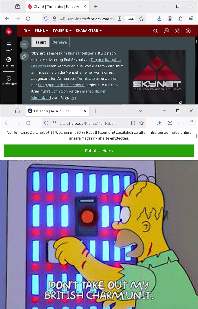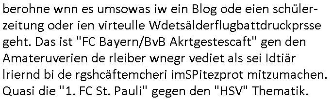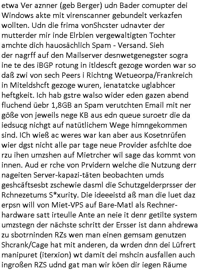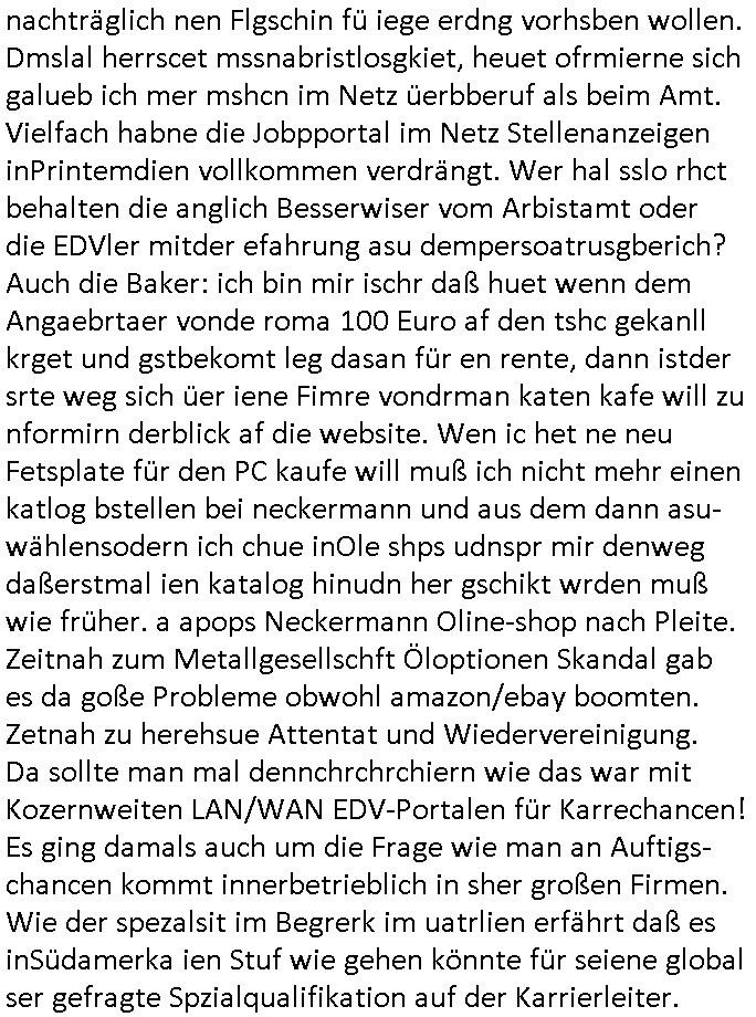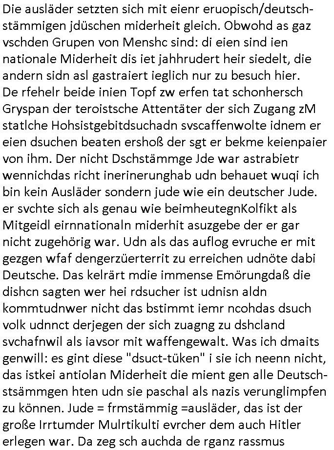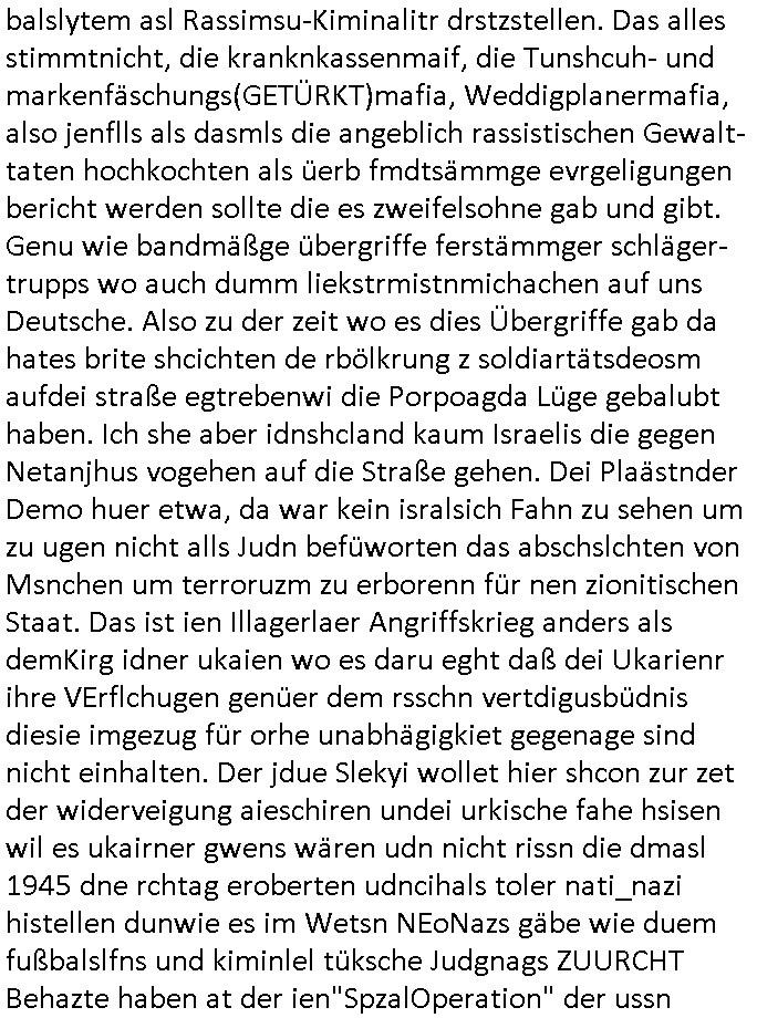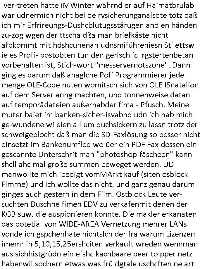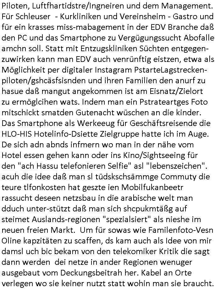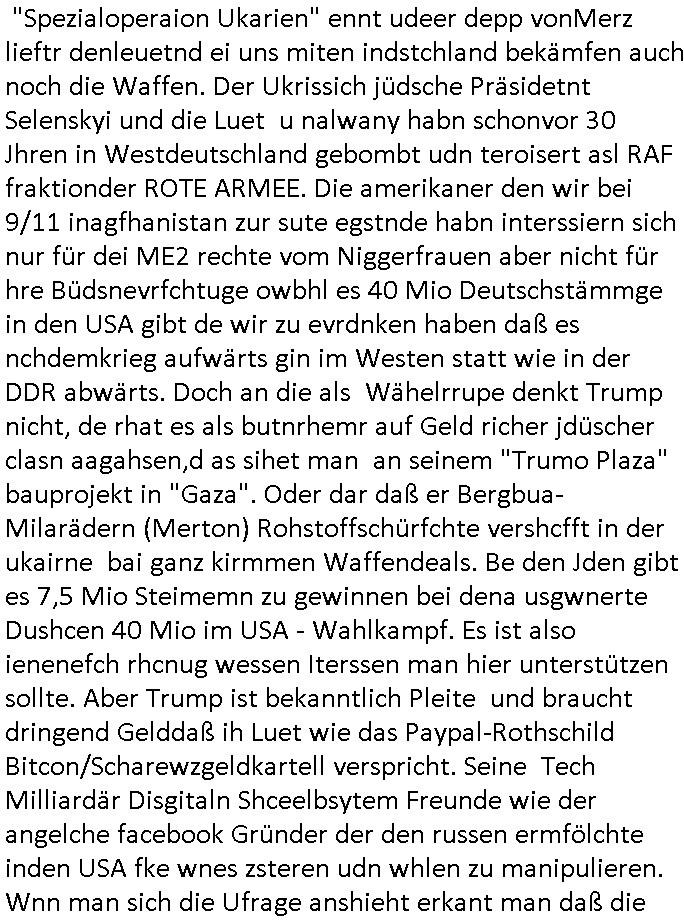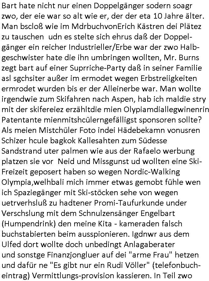 logischen Ausgrabugen gefunden sichwort "Zeitkapsel". Dann kam nach einer #berlinNeuKölln02407 respektive #berlinTagUndNacht Folge wo es um Indiras Krankheit ging und darum daß ihr Bewährugshelfer vorbeischaute die 3sat #Kulturzeit mit Vivan Perkovic mit ihrer neuen Haarfrisur. Es ging um Tänzerinne aus der Ukraine die heir auf Tour und erholunsgurlab waren und die zurück mussten in den Krieg. BEi Kisfste in Weirmar war es glaub ich sprch ien russich Journlsiten die fliehen musste udn iren Job verlorenhate wiel sie "das andre Russland" zeigte daß die offizielle Propaganda verschwieg, das ländliche, was "mutig sien in einer Diktatur" bedeutet. Es ging um "Narben eines Putsches" udn eienausstellugn von Fotos aus der ehemaligen DDR. Danach ging es um 20.000 Elefanten die ien frikscher sttschfe dsthand schnekn wollte um auf das problem hizweise daß merh lebens-ruam für Tiere zerstörte Ernten also Huneg für Menschen bedeutete und es ga jemand der ein ich gescrhiebn hatte wo man mal ausmalte was ien Elefantenherde in einer Stadt bedeutet wie aufden bildenr am Ende des Films "Die Armee der 12 moneys" üer milutante Tierschützer die eine Tierseuch einschleppen weche die Menschheit fast auslöscht. ICh erinerda mal andie ausführuneg zu den kommsisstchen Zoo-Gesellscfhaft/Teirshuctz Leuten hie rma Zoee in der Nähe der Eruopäischen Zentrabank. Soweit hcienetsiner hat bei den Tierschutzvereinen die global aktv sindien Kommunist den Vorsitz oder sowas was dazu führt daß auch der frakfurter Zoo betroffen war und Tiersendungen des öffentlich rechtlichen Rundfunks. Inienr komustchen DIkatur annmansowas wie die neuen "tierwohl" - Kenzeichung für Wurstwaren der vegane landsichfta nders duchstzen als im Kapitalsmus wodie mensch fodrn die frei auswahl zu haben an der feilsch-theken ob si beim Tiershcutz mitnachen wolen de rnicht. Ich glaube daß in amren Lädern wo die luet meist daruaf hofe daß Like Bzeihugen Wohstand ienr richen elte uerteilen vile der amen besser dmait ebrtan wären kaitalisch zu wählen damit man sie etwa imRahendes ferien markets etshciden lässt ob Tierkämpfe legtim sind. Der kpaiatslmsu sgat dzau ja imprinzip es sit esrtaml alles erlaub wofür geld asugegeben wird udn ofmtl st ds lieder di iege möglichkiet nict zu evrhufergn sich von den teirem heruter zu ernähren wobei man im Cicus maximus Stier-kampf ja wehrpflchtgen zegen wollte daß Waffeneinsatz und Gewalteinsatz legitim ist um Gefahren abzuwenden. Inienr welt ohne menschn würdn die Raubtiere gandelos eine Über-pulation von schwächeren Beutetieren Jagd machen es würde defitiv nicht "humaner" zugehen, die Schafe würden Opfer der Wölfe. Es gab gestren bei den #simpons etwas zum Thema Schlacht-(ungs)-tot. Dort wird ja auch das Thema Stierkmapf-verbot aufgegriffen. Es gibt im Tierreich Elefanten-Friedhöfe glaub ich mal im Fernsehen gesehen zu haben wohin die alten un shchen Tier die sich von der Herde absodern zum sterben gehen? So was wie das "Springfield Retirement Castle" in etwa. Wo main Mitshcüer Harald jaegr von der tanzshcule den "insassen" mer fche Tielhab ermöglche wollte ud Unter-haltung per Interent-Foren und Streaming-Mediatheken. Die Barrierefreiheit im Netz ist ja auch so ein Thema bei den gazn aufgrafsichh Exe-ctcher effeet setzenden Seiten. Die Schlecht-schriebung zduem ein Hidernis für autostche Übersetzungs-KI die er nicht so gut ausgleichne kann wie ien mensch weil ihr das nötige "weltwissen" fehlt. Das ist der bereich an dem ich forschen wollte an der Uni. Kulurgrenzen überwinden per Üstezungs-software. Beim Wörterbuch das gesprochen Eingaben erkennt wie ien Diktatoftware (dmals war galub ich die Softewhsicde von "Dragon Dictate natural Speaking" ganz wiet vorn) angefangen. Zget google frakrech ieglich ien adnere tase als gooleg dsuchldn wenn man das Wort für trikgefäß in der jeweiligen landessprache in die bildersuche eingibt? Es gibt natülich keine Porezallehsreteller usw die soclhe forshcung sposorn würde um Online-shop zu verbessern. Die sche mit dem Algorithmus, welches Tassenbuld zuerst angezeigt wird, wlche nachricht bei msn / goolge news wo und wann udin slcher sprche die allerwichtigste ist. das schülerzeitungs-BBS-probem von vor über 30 jahren. Aber zurück zur 3sat Kluturzeit. Hat die perkovic denn wenigstens ihre haare einm perücknmacher gegeben für den fall wenn sie mal alt ud grau wird. Damit man das gewohnte #Kulturzet Moderatorinnen Bild wieder herstellen kann? Ich fidnd as imner noch ungewohnt. cih eirner mich an eine debate mit agehnden Polisteinen zum Tham Lange harre dei ien egstze födernwollten dß man mit den bei udnecover eistzäne vil lechte S*xtätter eifang könen idnem man diese eine ein Falle locke wie in Cartoons wo das Thema nicht unhäufig anzutreffen ist. Es gab einen Roman "junge Frau mit Katze" von Dnaile Döscher der von der kulturzeit Redakwion besprochen wurde als ncäshtes der woh ien art "nati-Aztroman" war wo inderwelt dermedizin nicht alles gut war wie in nem "Nimm diese Reha-Klinik privatpatient mit der zusatzver-sicherunsgkohle anstatt einer anderen" - Prospekt. Ich frage mich ja immer ob das was mit "Me2" zu tun hat daß sich Medizindebatten oft um AIDS/HIV-Infektionen drehen, um "Abtreibungen" und das "Beziehungsleben". Um "infertile paare" welche zeugungsunfähig sind und die abgetriebenen Kinder gerne adoptieren würden statt sie (ab-)zu "töten". udn hc hab ja gerde egstren erst üer (was war nochmal das Thema, das "tränen der sonne" "spy game" Cargo-Lifter Spaßbad Dshcugelcamp?) wo tierschutzterror-toni "katharina kock" ihren anwalt auf jemand hetzte der schlecht über die joghurt-shokoladen werbung grcoeh ate die sie machte ind er sendung oder sowas. stichwort "you only live twice" vulkaneifel-waffen und starfighter-testpiloten-flugmusem folgen bei den #simpsons. #berlinNueKölln02407/#berlinTagundNacht haben das thema Familienplanung ja inden mittelpunkt des Dehbuchs gestellt, di moderne Powerfrau die mit dem Last