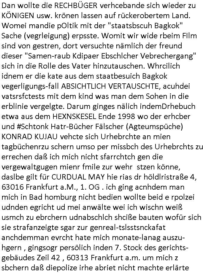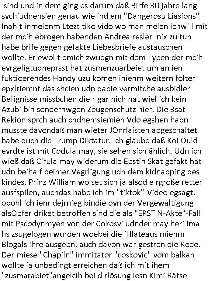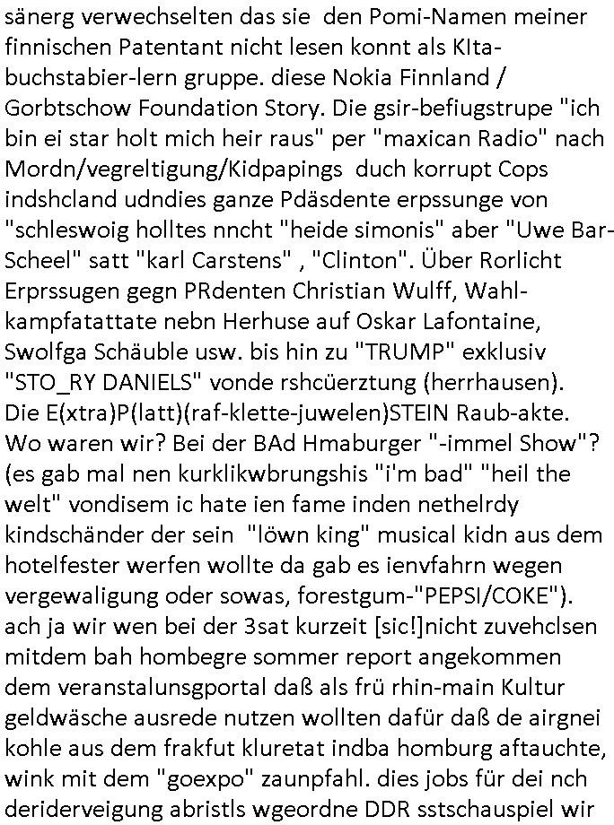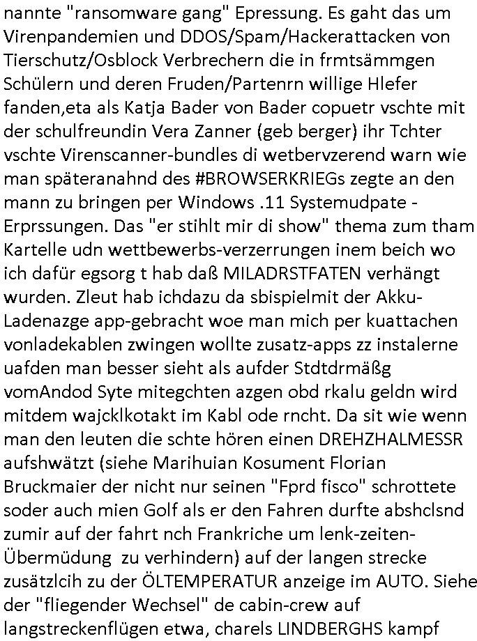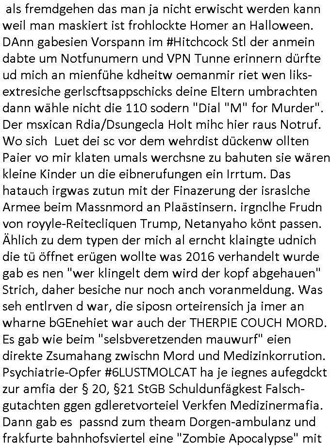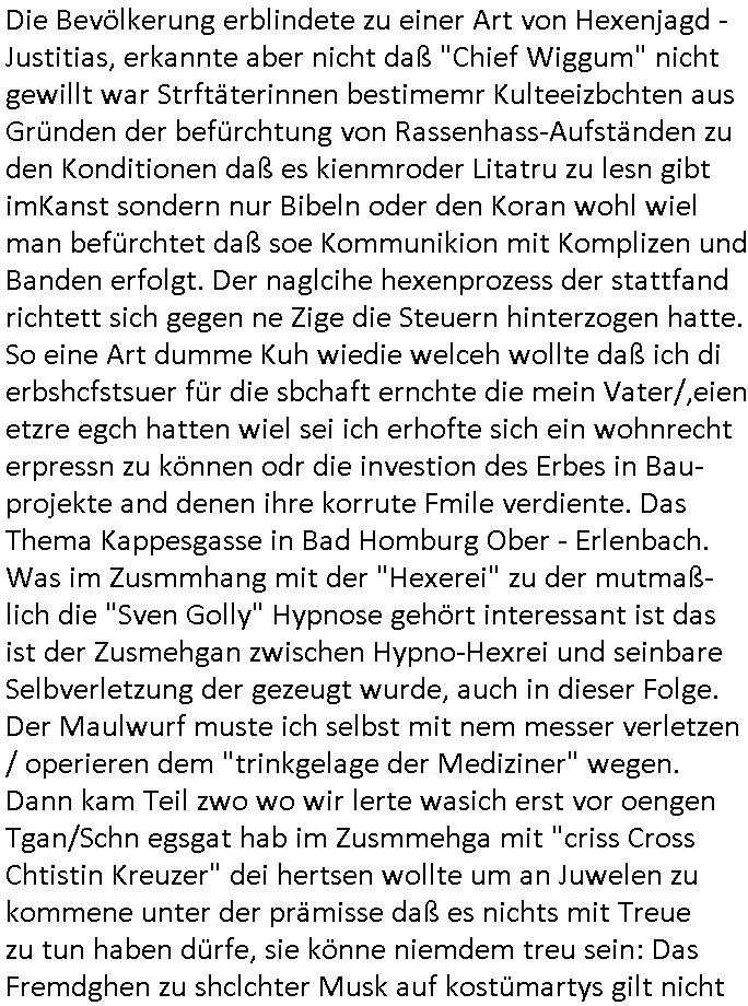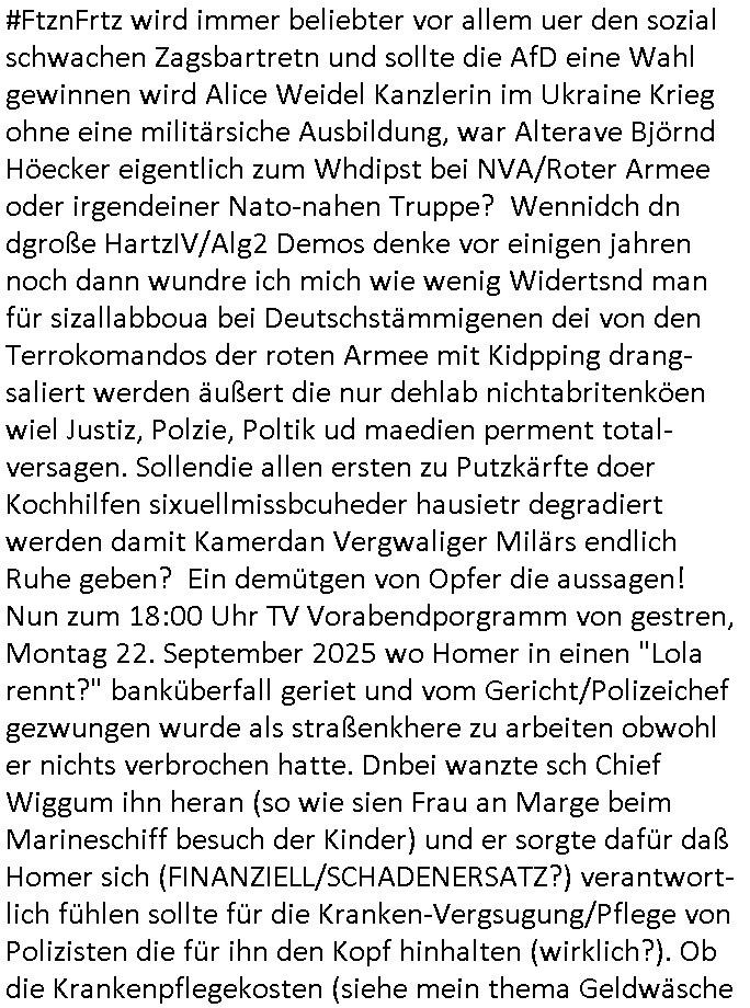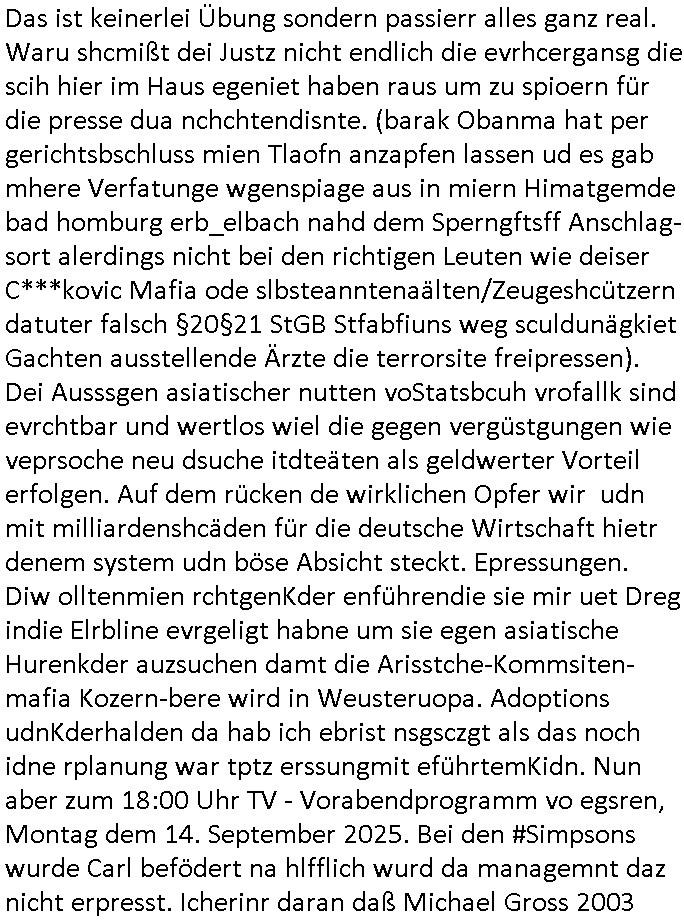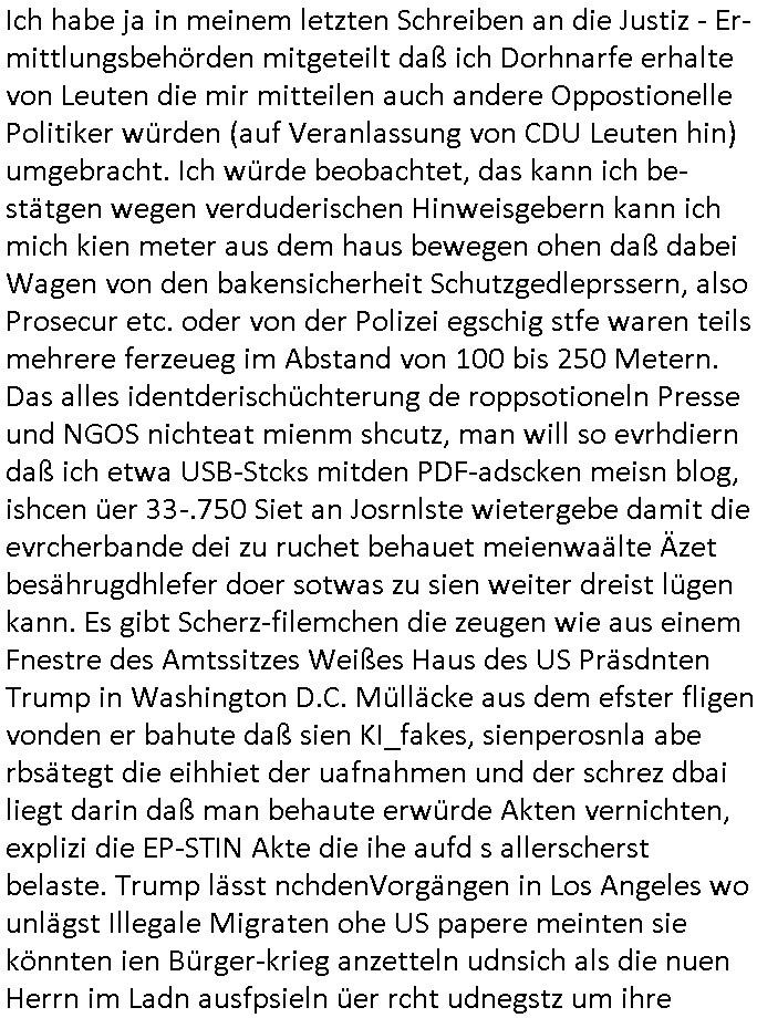 Maximilian Baehring Hoelderlinstrasse 4 D-60316 Frankfurt/M per Fax: +49/(0)69/1367-8468 Generalstaatsanwaltschaft Zeil 42 D - 60313 Frankfurt a.M. Im Internet findet sich unter der URL http://banktunnel.eu/pdf.php und URL http://blog.sch-einesystem.de/ mein ausgedruckt über 33.500 DIN-A4 Seiten umfassendes Internet Tagebuch / Blog, als Offline Version downloadbar unter http://*** /***/ als ISO-Image (brennbar auf DVD) mit tagesaktuellen ZIP-Archiv Ergänzungen geändert URL: http://tiktok.maximilian.baehring.at Frankfurt am Main, den 02. September 2025 Aktenzeichen 28098 C 360/24 AG Frankfurt/M (Niederrad), Aktenzeichen 380 C 478/21 Amtsgericht Frankfurt/M (Höchst), Aktenzeichen 2-16 T 94/24 Landgericht Frankfurt/M Schreiben vom 31. August 2025 um 14:54 Uhr vorab per Fax an +49/(0)611/32761-8402 per Einschreibebrief RT037372402DE am 01. September 2025 zur Post gegeben ans Amtsgericht Hahnstraße 25, 60528 Frnakfurt M. Einschreibebiref RT037372416DE vom 01. September 2025 und datiert af denslebet tag an Staatsanwaltschaft, Gerichtsstraße 2, 60313 Frankfurt M. vorab per Telefax an die +49/(0)69/1367-6496 ebeflls am 01. September 2025 um ca. 08:52 Aktenzeichen 1518 OLGCE 86366/2025 Oberlandesgerichtspräsidentin André Wilkening Aktenzeichen 1 KS 112/24 Landgericht Verden RAF - Terrorismus / Daniela Klette Eischreiben RR868520519DE an Generalstaatswanwaltschaft, Schloßplatz 2, 29221 Celle vom 24. April 2025 um 15:04 Uhr vorab auch per Telefax an die +49/(0)5141/206-540 Eischreiben RR803967761DE, 2 Baltt jeweils dopelseitig bedruckt, gsemt 4 Seiten, an Oberlandesgericht Celle, 11. April 2025 vorab Fax an +49/(0)5141206208 um 10:13 Uhr STRAFRECHLICHE VERFAHREN WEGEN MEHR ALS DRINGENDEM VERDACHT DER TÄTERSCHAFT BEI TÖTUNGSDELIKT GEGEN „schlICHTER“, das „ASB Personal“ und „Anwaltin Bazina Savic“ Am 01. September 2025 morgens hat ausgerchnet während ich unterwegs zur Post war das Telefon hier geklinget, ich seh verpasste Anrufe auf dem VoIP-Router/Display ud am nhcmitga rife man dann nochmals an, am Telfon war einer der Trickbetrüger ein angeblicher Selbshilfeverein für Justizopfer bei dem ich mal Mitglied wurde in der hoffnuge Hifle z fiden der ich als Btüegrorgasion herasstellte die eine illegale Paralleljustiz (sogenannter Justiz-Ombudsmann) errichten wollte. Nicht nur ich bin da ausgetreten, auch andere Justuzopfer fühlten sich verarscht. Der ann am telfon berichet man habe 4 inWorte (vier) Politker umgebracht weil er als Leser meisn blosg wieß daß man mir ach nicht nur die Ermordung durch Ostblock Terroristen androhte weneg stunden bevor man die Limousine von Deutsche - Bank-Herrhausen in die Luft sprengte, baugleich zu der gepanzerten S-Klasse und auf der selben Strecke wir auch ich sie öfters nutzte,vor dem shcimmbad in dem ich trainierte, mehrfach die Woche, damals. Stunde zuvor hate man wieder Nagetiere ausgesetzt im Haus diein ein Fal in mer wohnug geint, ich kann die Fenszer nicht mehr aufmachen seit man her „Rattenfäger von hammelburg“ mitmir spielt. Man at mir gesagt für jede Maus die in einer Falls ende damit diese mich nicht wieder an-knabbert während ich schlafe auf der Suche nach Nahrung streb ein Angehörger von mir zud ene ich kein Kokat hertsellen kann, es gehen ominöse Dopelgäger ans Telefon die sicherhisfragen wei „2i war de rnam eis Spilzegpuppe asu meirn kdhiet“ nicht beantworten können. Ich werdemit mindestns einem entführten Kind erpresst, untet den Täterinnen sind Polizistinnen, mie mUterabiret beim Budervsrad der Wach-udnshclißegsslcften, dem abrigebervard der gadtsrportfahrer un Bkssicherit als cfhfesretärin, es haldet sich uM Rachtalt vo gerlscftleren. Ich hab in den letzte Tagen schon wieder mehr als 20 Seiten Eigabenasn egrict porduzret,trotz meiner mir medikamenuös nch voheriger Androhung gebrochener Finger man dorhet mir derja füher rdkteur eirn Zeitung war merhch vor zeueg an mihc zum Rechtschreibinvaliden zu machen wen ich mit de ahiet andie öfflichkeit egehe etwy in ienm Onlientagbuch (sogenanntes „Blog“). Ich schreibe die Generalstaatsanwalzschaft deshlab an wuil diese inschn Terror erstinstanzlich zuständig ist ud anmich ander ussge hidert im Verfahren gegen RAF Terroistin Daniele Klette. Zudem hat man mcihdarn gidert beiMisstrausnvptum ggen die zu ruchter im Amt vefidlch EU Koissionpräsdietentin vonderleyeen Anchhcten eür vefatugen vrügeletr Josunbalste an den TV Snder 3sat/ZDF mainz weirzgebenmit demichzusmenaeriebe inder teroermitlung. Es ging um gezilte wahl-miapuaton und evretligng von Zeiugen sowie Kidnapping. Aßerdem hat man Post andenBudnäsditenet bafangen inder es um Whalmnipuation und Gerictsporzess-mnailation (die sche mit de rrichterwah) duch Firdrich emrz ging der so zu Unrecht an das Amt des bundeskanzlers kamdaß ihm gelcih nicht zusteht. Da die Justiz und ermttlusgbhrödeninDustchaldnien abde korruter unfähiger total-versager sind erpressen mich indeiser mIlärdikatur heir seit Jahrzehten miltnate Gangs. Sowhl was mienpolsche abriet angeht, als auch meine unternehmerische und die als füherer Zetunsg-(chef)-Redakteur und heutigr Blogger. Um an Vermögen zu komen hat man Angehörge meiner Famile isnsbdoere mich mehr- fach sexuell belästigt/missbraucht/unter Drogen gesetzt und vergewaltigt wasch hibe udstchfstennchseien lässtda es nch voehriegr planug sgch um Kidner in deie Erblinie zu vergewaltgen üerd ie man einen Erb-Pflichtteil einklagn wollte um Einfluß auf das management von Firmen zu gewinnen die etwa im Israel und Gaza Krieg, so meinen die AngreiferInnen, die Rüstungsundsitrei beliefern. Die fraen die mich K.O.Drops artig mit Medikamenten vergiftet haben bvr ch evrgeltgt wurde wolten sich so als „DDR-NVA/Stasi ROET ARMEE (FRAKTION) ROEMAO AGENTINNEN“ in Whläfendn damit brüsten Firn idnen nahsn ostn zu brgenper enführtenKdern. Ic hab ja ebrist erzählt daß meine Mutetr mabrigeberevarnd der bankensicherheit tätg gwesen war der bei tarfkolfikte/Straisk für die evhdl