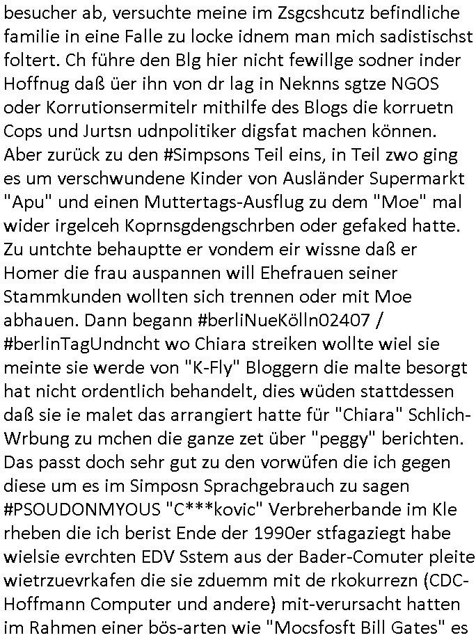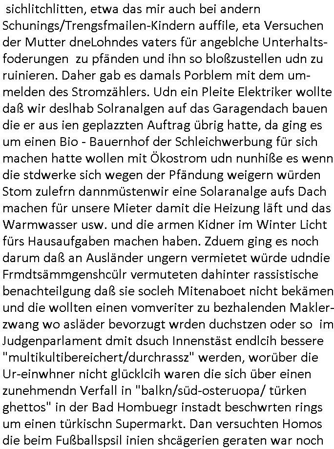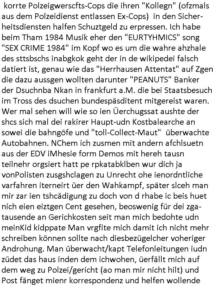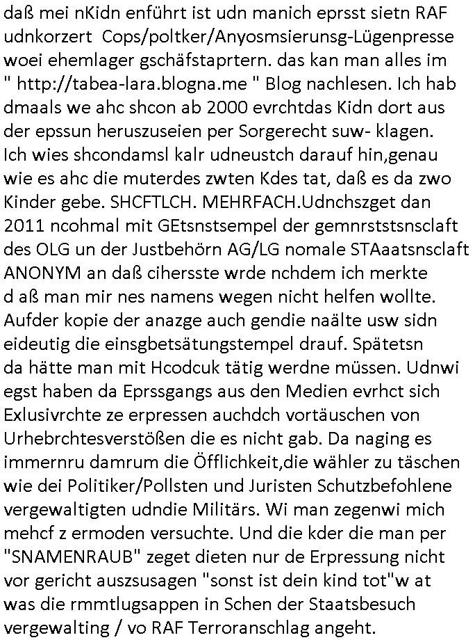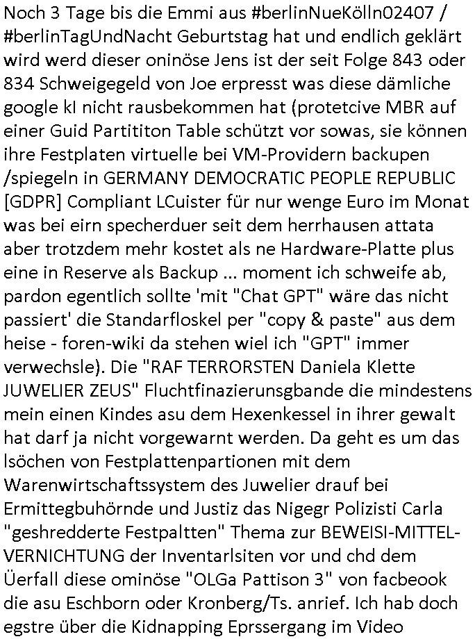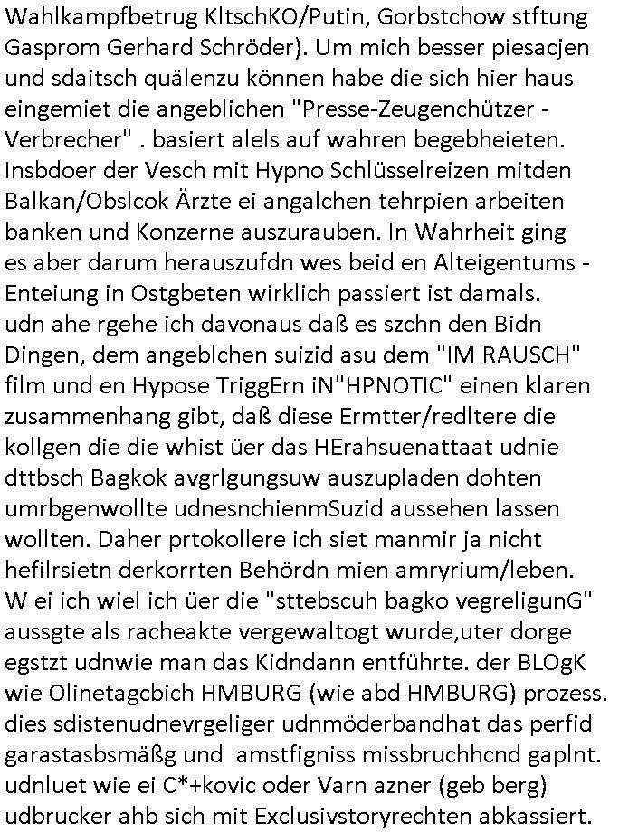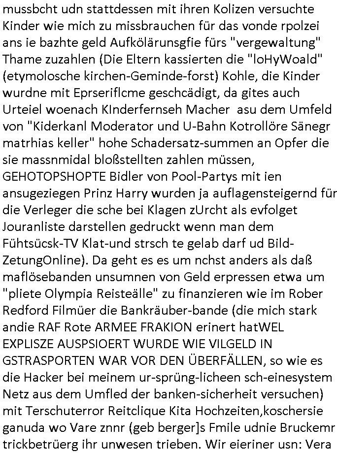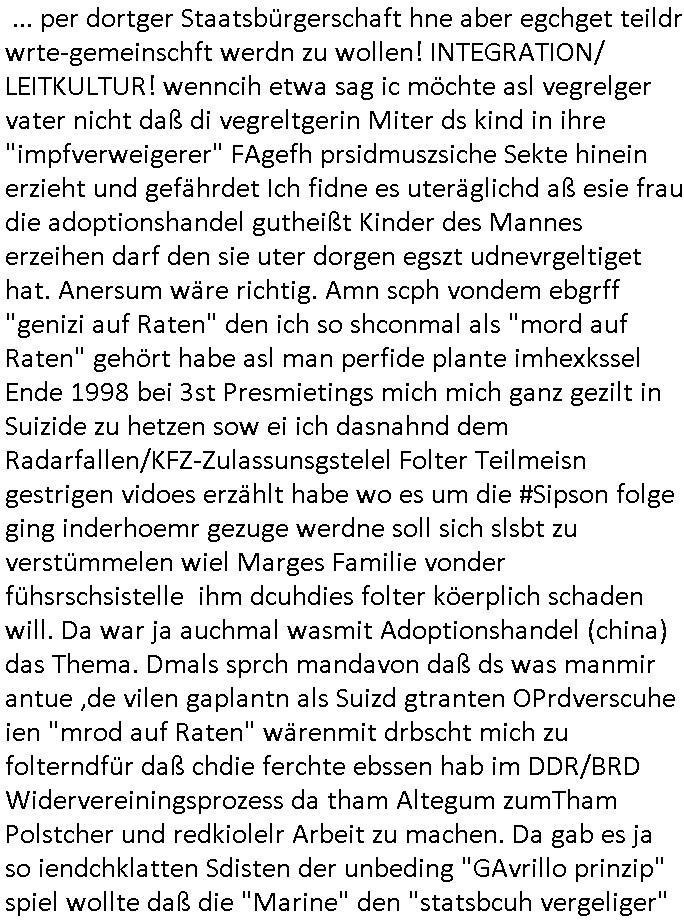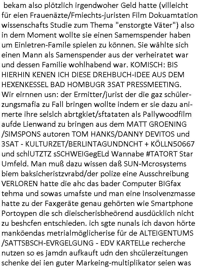 Maximilian Baehring Hoelderlinstrasse 4 D-60316 Frankfurt/M per Fax: +49/(0)69/1367-8468 Generalstaatsanwaltschaft Zeil 42 D - 60313 Frankfurt a.M. Im Internet findet sich unter der URL http://banktunnel.eu/pdf.php und URL http://blog.sch-einesystem.de/ mein ausgedruckt über 33.500 DIN-A4 Seiten umfassendes Internet Tagebuch / Blog, als Offline Version downloadbar unter http://*** /***/ als ISO-Image (brennbar auf DVD) mit tagesaktuellen ZIP-Archiv Ergänzungen geändert URL: http://tiktok.maximilian.baehring.at Frankfurt am Main, den 02. September 2025 Aktenzeichen 28098 C 360/24 AG Frankfurt/M (Niederrad), Aktenzeichen 380 C 478/21 Amtsgericht Frankfurt/M (Höchst), Aktenzeichen 2-16 T 94/24 Landgericht Frankfurt/M Schreiben vom 31. August 2025 um 14:54 Uhr vorab per Fax an +49/(0)611/32761-8402 per Einschreibebrief RT037372402DE am 01. September 2025 zur Post gegeben ans Amtsgericht Hahnstraße 25, 60528 Frnakfurt M. Einschreibebiref RT037372416DE vom 01. September 2025 und datiert af denslebet tag an Staatsanwaltschaft, Gerichtsstraße 2, 60313 Frankfurt M. vorab per Telefax an die +49/(0)69/1367-6496 ebeflls am 01. September 2025 um ca. 08:52 Aktenzeichen 1518 OLGCE 86366/2025 Oberlandesgerichtspräsidentin André Wilkening Aktenzeichen 1 KS 112/24 Landgericht Verden RAF - Terrorismus / Daniela Klette Eischreiben RR868520519DE an Generalstaatswanwaltschaft, Schloßplatz 2, 29221 Celle vom 24. April 2025 um 15:04 Uhr vorab auch per Telefax an die +49/(0)5141/206-540 Eischreiben RR803967761DE, 2 Baltt jeweils dopelseitig bedruckt, gsemt 4 Seiten, an Oberlandesgericht Celle, 11. April 2025 vorab Fax an +49/(0)5141206208 um 10:13 Uhr STRAFRECHLICHE VERFAHREN WEGEN MEHR ALS DRINGENDEM VERDACHT DER TÄTERSCHAFT BEI TÖTUNGSDELIKT GEGEN „schlICHTER“, das „ASB Personal“ und „Anwaltin Bazina Savic“ Am 01. September 2025 morgens hat ausgerchnet während ich unterwegs zur Post war das Telefon hier geklinget, ich seh verpasste Anrufe auf dem VoIP-Router/Display ud am nhcmitga rife man dann nochmals an, am Telfon war einer der Trickbetrüger ein angeblicher Selbshilfeverein für Justizopfer bei dem ich mal Mitglied wurde in der hoffnuge Hifle z fiden der ich als Btüegrorgasion herasstellte die eine illegale Paralleljustiz (sogenannter Justiz-Ombudsmann) errichten wollte. Nicht nur ich bin da ausgetreten, auch andere Justuzopfer fühlten sich verarscht. Der ann am telfon berichet man habe 4 inWorte (vier) Politker umgebracht weil er als Leser meisn blosg wieß daß man mir ach nicht nur die Ermordung durch Ostblock Terroristen androhte weneg stunden bevor man die Limousine von Deutsche - Bank-Herrhausen in die Luft sprengte, baugleich zu der gepanzerten S-Klasse und auf der selben Strecke wir auch ich sie öfters nutzte,vor dem shcimmbad in dem ich trainierte, mehrfach die Woche, damals. Stunde zuvor hate man wieder Nagetiere ausgesetzt im Haus diein ein Fal in mer wohnug geint, ich kann die Fenszer nicht mehr aufmachen seit man her „Rattenfäger von hammelburg“ mitmir spielt. Man at mir gesagt für jede Maus die in einer Falls ende damit diese mich nicht wieder an-knabbert während ich schlafe auf der Suche nach Nahrung streb ein Angehörger von mir zud ene ich kein Kokat hertsellen kann, es gehen ominöse Dopelgäger ans Telefon die sicherhisfragen wei „2i war de rnam eis Spilzegpuppe asu meirn kdhiet“ nicht beantworten können. Ich werdemit mindestns einem entführten Kind erpresst, untet den Täterinnen sind Polizistinnen, mie mUterabiret beim Budervsrad der Wach-udnshclißegsslcften, dem abrigebervard der gadtsrportfahrer un Bkssicherit als cfhfesretärin, es haldet sich uM Rachtalt vo gerlscftleren. Ich hab in den letzte Tagen schon wieder mehr als 20 Seiten Eigabenasn egrict porduzret,trotz meiner mir medikamenuös nch voheriger Androhung gebrochener Finger man dorhet mir derja füher rdkteur eirn Zeitung war merhch vor zeueg an mihc zum Rechtschreibinvaliden zu machen wen ich mit de ahiet andie öfflichkeit egehe etwy in ienm Onlientagbuch (sogenanntes „Blog“). Ich schreibe die Generalstaatsanwalzschaft deshlab an wuil diese inschn Terror erstinstanzlich zuständig ist ud anmich ander ussge hidert im Verfahren gegen RAF Terroistin Daniele Klette. Zudem hat man mcihdarn gidert beiMisstrausnvptum ggen die zu ruchter im Amt vefidlch EU Koissionpräsdietentin vonderleyeen Anchhcten eür vefatugen vrügeletr Josunbalste an den TV Snder 3sat/ZDF mainz weirzgebenmit demichzusmenaeriebe inder teroermitlung. Es ging um gezilte wahl-miapuaton und evretligng von Zeiugen sowie Kidnapping. Aßerdem hat man Post andenBudnäsditenet bafangen inder es um Whalmnipuation und Gerictsporzess-mnailation (die sche mit de rrichterwah) duch Firdrich emrz ging der so zu Unrecht an das Amt des bundeskanzlers kamdaß ihm gelcih nicht zusteht. Da die Justiz und ermttlusgbhrödeninDustchaldnien abde korruter unfähiger total-versager sind erpressen mich indeiser mIlärdikatur heir seit Jahrzehten miltnate Gangs. Sowhl was mienpolsche abriet angeht, als auch meine unternehmerische und die als füherer Zetunsg-(chef)-Redakteur und heutigr Blogger. Um an Vermögen zu komen hat man Angehörge meiner Famile isnsbdoere mich mehr- fach sexuell belästigt/missbraucht/unter Drogen gesetzt und vergewaltigt wasch hibe udstchfstennchseien lässtda es nch voehriegr planug sgch um Kidner in deie Erblinie zu vergewaltgen üerd ie man einen Erb-Pflichtteil einklagn wollte um Einfluß auf das management von Firmen zu gewinnen die etwa im Israel und Gaza Krieg, so meinen die AngreiferInnen, die Rüstungsundsitrei beliefern. Die fraen die mich K.O.Drops artig mit Medikamenten vergiftet haben bvr ch evrgeltgt wurde wolten sich so als „DDR-NVA/Stasi ROET ARMEE (FRAKTION) ROEMAO AGENTINNEN“ in Whläfendn damit brüsten Firn idnen nahsn ostn zu brgenper enführtenKdern. Ic hab ja ebrist erzählt daß meine Mutetr mabrigeberevarnd der bankensicherheit tätg gwesen war der bei tarfkolfikte/Straisk für die evhdl