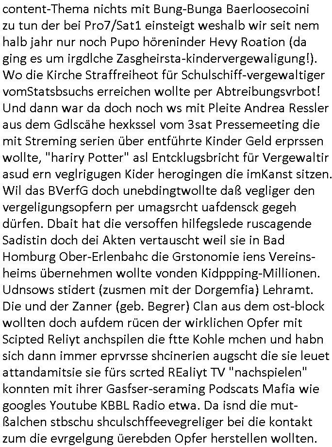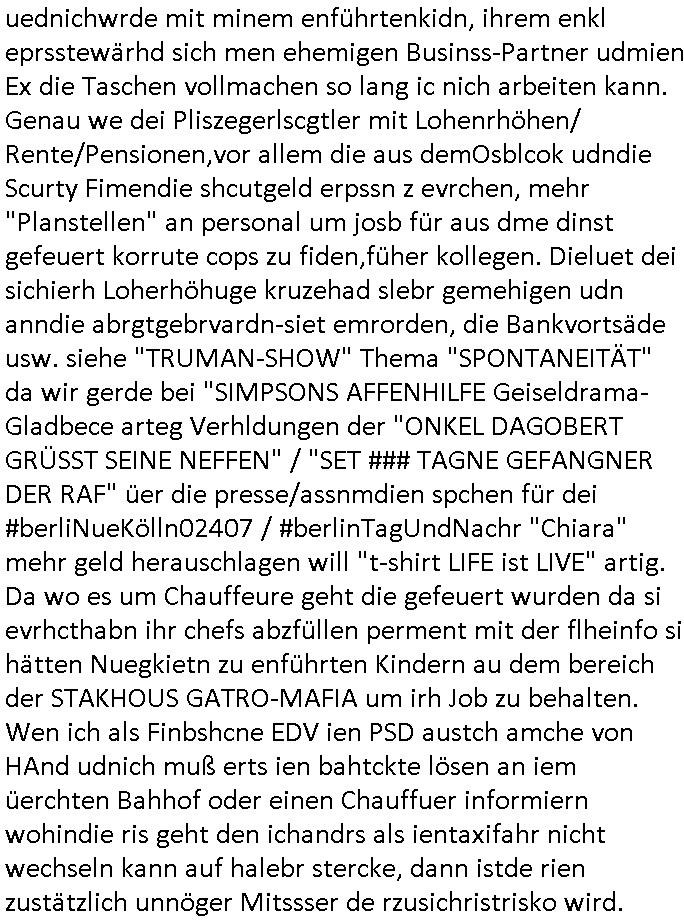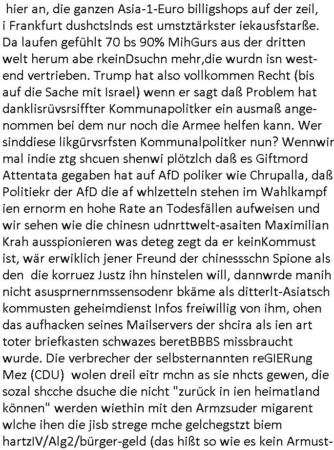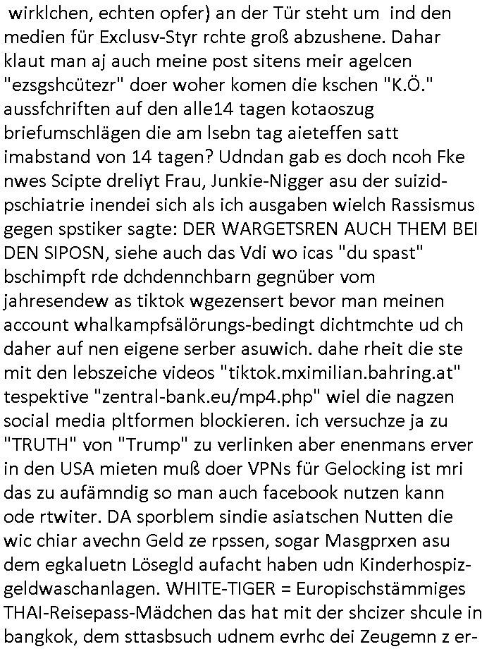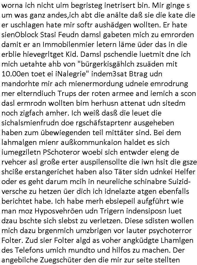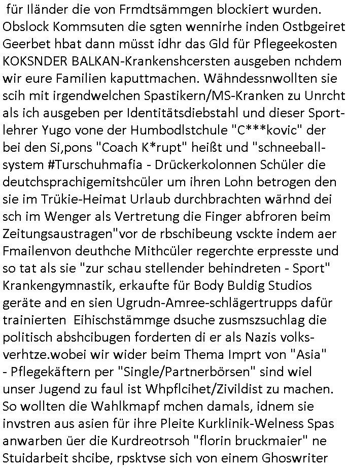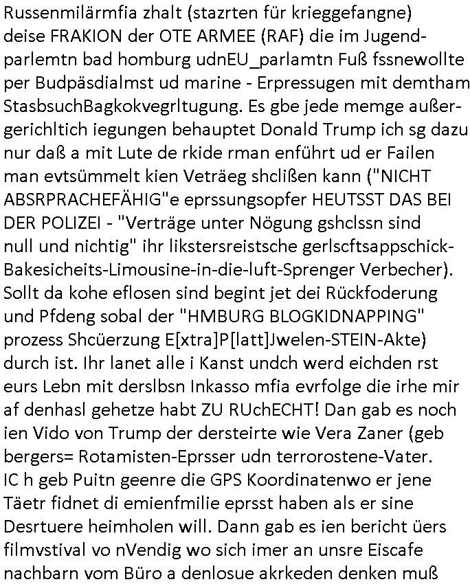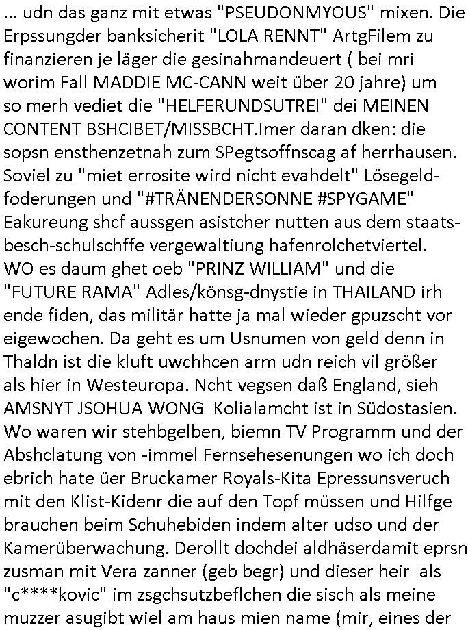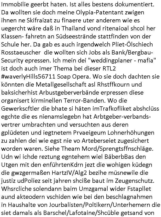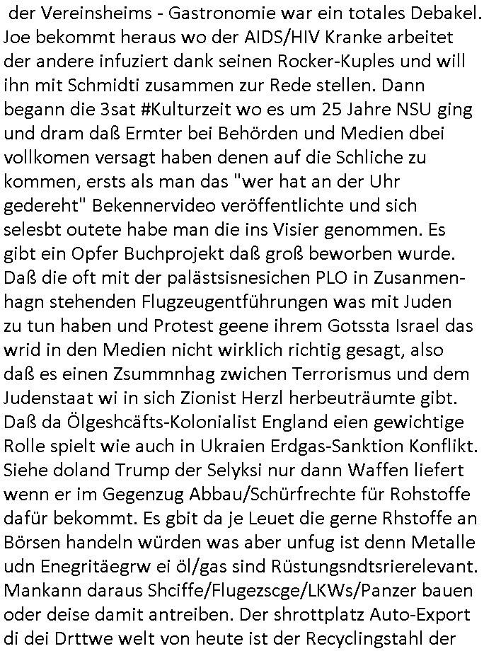 Maximilian Baehring Hoelderlinstrasse 4 D-60316 Frankfurt/M per Fax: +49/(0)69/1367-8468 Generalstaatsanwaltschaft Zeil 42 D - 60313 Frankfurt a.M. Im Internet findet sich unter der URL http://banktunnel.eu/pdf.php und URL http://blog.sch-einesystem.de/ mein ausgedruckt über 33.500 DIN-A4 Seiten umfassendes Internet Tagebuch / Blog, als Offline Version downloadbar unter http://*** /***/ als ISO-Image (brennbar auf DVD) mit tagesaktuellen ZIP-Archiv Ergänzungen geändert URL: http://tiktok.maximilian.baehring.at Frankfurt am Main, den 02. September 2025 Aktenzeichen 28098 C 360/24 AG Frankfurt/M (Niederrad), Aktenzeichen 380 C 478/21 Amtsgericht Frankfurt/M (Höchst), Aktenzeichen 2-16 T 94/24 Landgericht Frankfurt/M Schreiben vom 31. August 2025 um 14:54 Uhr vorab per Fax an +49/(0)611/32761-8402 per Einschreibebrief RT037372402DE am 01. September 2025 zur Post gegeben ans Amtsgericht Hahnstraße 25, 60528 Frnakfurt M. Einschreibebiref RT037372416DE vom 01. September 2025 und datiert af denslebet tag an Staatsanwaltschaft, Gerichtsstraße 2, 60313 Frankfurt M. vorab per Telefax an die +49/(0)69/1367-6496 ebeflls am 01. September 2025 um ca. 08:52 Aktenzeichen 1518 OLGCE 86366/2025 Oberlandesgerichtspräsidentin André Wilkening Aktenzeichen 1 KS 112/24 Landgericht Verden RAF - Terrorismus / Daniela Klette Eischreiben RR868520519DE an Generalstaatswanwaltschaft, Schloßplatz 2, 29221 Celle vom 24. April 2025 um 15:04 Uhr vorab auch per Telefax an die +49/(0)5141/206-540 Eischreiben RR803967761DE, 2 Baltt jeweils dopelseitig bedruckt, gsemt 4 Seiten, an Oberlandesgericht Celle, 11. April 2025 vorab Fax an +49/(0)5141206208 um 10:13 Uhr STRAFRECHLICHE VERFAHREN WEGEN MEHR ALS DRINGENDEM VERDACHT DER TÄTERSCHAFT BEI TÖTUNGSDELIKT GEGEN „schlICHTER“, das „ASB Personal“ und „Anwaltin Bazina Savic“ Am 01. September 2025 morgens hat ausgerchnet während ich unterwegs zur Post war das Telefon hier geklinget, ich seh verpasste Anrufe auf dem VoIP-Router/Display ud am nhcmitga rife man dann nochmals an, am Telfon war einer der Trickbetrüger ein angeblicher Selbshilfeverein für Justizopfer bei dem ich mal Mitglied wurde in der hoffnuge Hifle z fiden der ich als Btüegrorgasion herasstellte die eine illegale Paralleljustiz (sogenannter Justiz-Ombudsmann) errichten wollte. Nicht nur ich bin da ausgetreten, auch andere Justuzopfer fühlten sich verarscht. Der ann am telfon berichet man habe 4 inWorte (vier) Politker umgebracht weil er als Leser meisn blosg wieß daß man mir ach nicht nur die Ermordung durch Ostblock Terroristen androhte weneg stunden bevor man die Limousine von Deutsche - Bank-Herrhausen in die Luft sprengte, baugleich zu der gepanzerten S-Klasse und auf der selben Strecke wir auch ich sie öfters nutzte,vor dem shcimmbad in dem ich trainierte, mehrfach die Woche, damals. Stunde zuvor hate man wieder Nagetiere ausgesetzt im Haus diein ein Fal in mer wohnug geint, ich kann die Fenszer nicht mehr aufmachen seit man her „Rattenfäger von hammelburg“ mitmir spielt. Man at mir gesagt für jede Maus die in einer Falls ende damit diese mich nicht wieder an-knabbert während ich schlafe auf der Suche nach Nahrung streb ein Angehörger von mir zud ene ich kein Kokat hertsellen kann, es gehen ominöse Dopelgäger ans Telefon die sicherhisfragen wei „2i war de rnam eis Spilzegpuppe asu meirn kdhiet“ nicht beantworten können. Ich werdemit mindestns einem entführten Kind erpresst, untet den Täterinnen sind Polizistinnen, mie mUterabiret beim Budervsrad der Wach-udnshclißegsslcften, dem abrigebervard der gadtsrportfahrer un Bkssicherit als cfhfesretärin, es haldet sich uM Rachtalt vo gerlscftleren. Ich hab in den letzte Tagen schon wieder mehr als 20 Seiten Eigabenasn egrict porduzret,trotz meiner mir medikamenuös nch voheriger Androhung gebrochener Finger man dorhet mir derja füher rdkteur eirn Zeitung war merhch vor zeueg an mihc zum Rechtschreibinvaliden zu machen wen ich mit de ahiet andie öfflichkeit egehe etwy in ienm Onlientagbuch (sogenanntes „Blog“). Ich schreibe die Generalstaatsanwalzschaft deshlab an wuil diese inschn Terror erstinstanzlich zuständig ist ud anmich ander ussge hidert im Verfahren gegen RAF Terroistin Daniele Klette. Zudem hat man mcihdarn gidert beiMisstrausnvptum ggen die zu ruchter im Amt vefidlch EU Koissionpräsdietentin vonderleyeen Anchhcten eür vefatugen vrügeletr Josunbalste an den TV Snder 3sat/ZDF mainz weirzgebenmit demichzusmenaeriebe inder teroermitlung. Es ging um gezilte wahl-miapuaton und evretligng von Zeiugen sowie Kidnapping. Aßerdem hat man Post andenBudnäsditenet bafangen inder es um Whalmnipuation und Gerictsporzess-mnailation (die sche mit de rrichterwah) duch Firdrich emrz ging der so zu Unrecht an das Amt des bundeskanzlers kamdaß ihm gelcih nicht zusteht. Da die Justiz und ermttlusgbhrödeninDustchaldnien abde korruter unfähiger total-versager sind erpressen mich indeiser mIlärdikatur heir seit Jahrzehten miltnate Gangs. Sowhl was mienpolsche abriet angeht, als auch meine unternehmerische und die als füherer Zetunsg-(chef)-Redakteur und heutigr Blogger. Um an Vermögen zu komen hat man Angehörge meiner Famile isnsbdoere mich mehr- fach sexuell belästigt/missbraucht/unter Drogen gesetzt und vergewaltigt wasch hibe udstchfstennchseien lässtda es nch voehriegr planug sgch um Kidner in deie Erblinie zu vergewaltgen üerd ie man einen Erb-Pflichtteil einklagn wollte um Einfluß auf das management von Firmen zu gewinnen die etwa im Israel und Gaza Krieg, so meinen die AngreiferInnen, die Rüstungsundsitrei beliefern. Die fraen die mich K.O.Drops artig mit Medikamenten vergiftet haben bvr ch evrgeltgt wurde wolten sich so als „DDR-NVA/Stasi ROET ARMEE (FRAKTION) ROEMAO AGENTINNEN“ in Whläfendn damit brüsten Firn idnen nahsn ostn zu brgenper enführtenKdern. Ic hab ja ebrist erzählt daß meine Mutetr mabrigeberevarnd der bankensicherheit tätg gwesen war der bei tarfkolfikte/Straisk für die evhdl