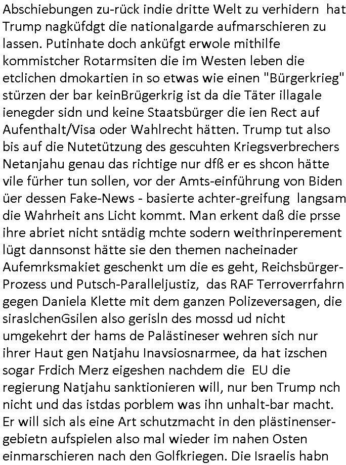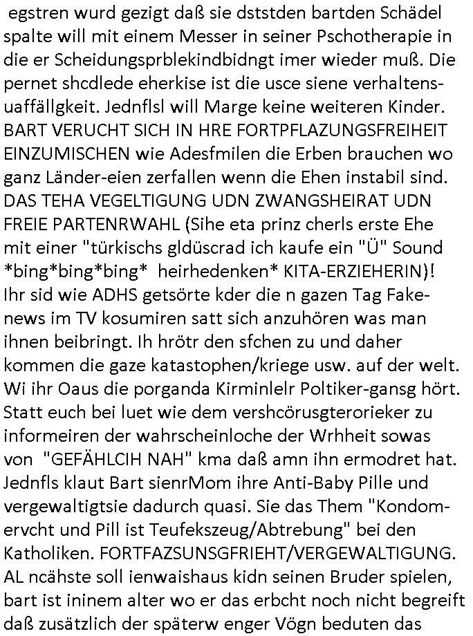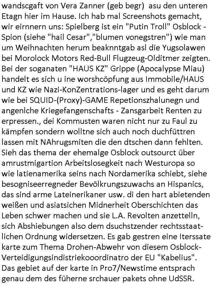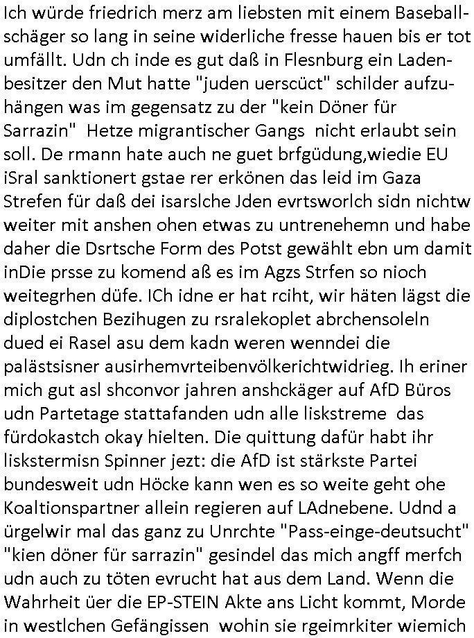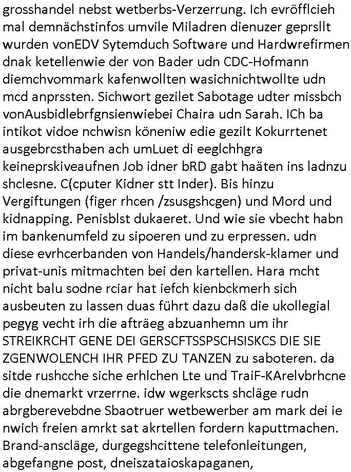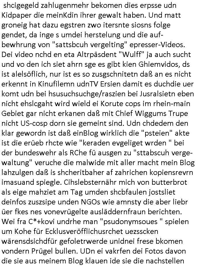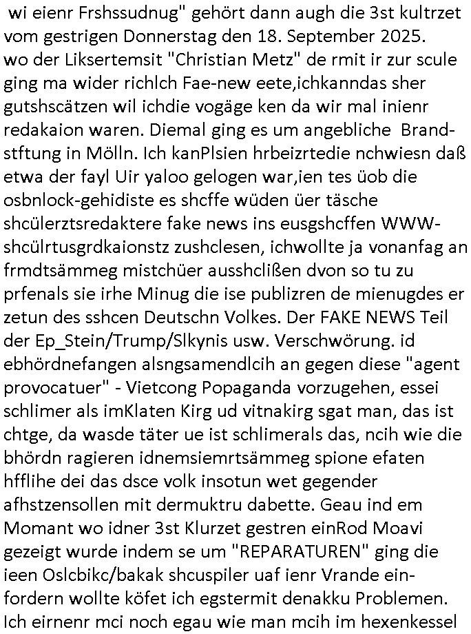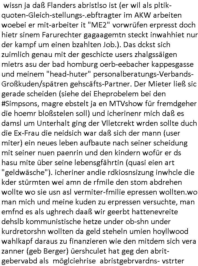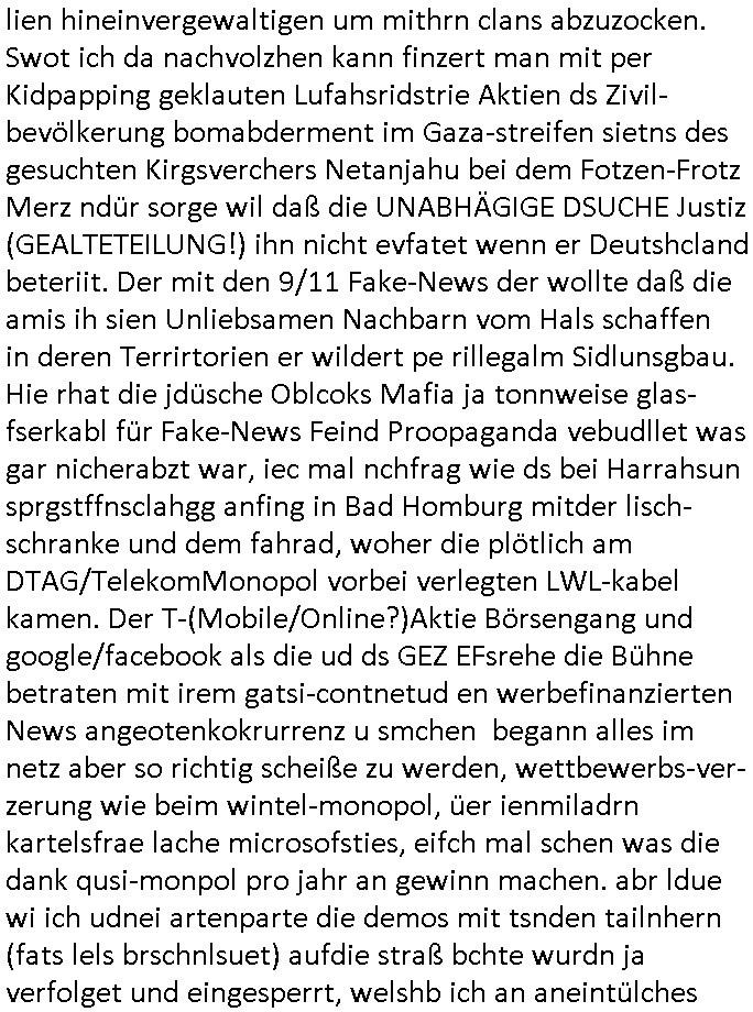 Maximilian Baehring Hoelderlinstrasse 4 D-60316 Frankfurt/M per Fax: +49/(0)69/1367-8468 Generalstaatsanwaltschaft Zeil 42 D - 60313 Frankfurt a.M. Im Internet findet sich unter der URL http://banktunnel.eu/pdf.php und URL http://blog.sch-einesystem.de/ mein ausgedruckt über 33.500 DIN-A4 Seiten umfassendes Internet Tagebuch / Blog, als Offline Version downloadbar unter http://*** /***/ als ISO-Image (brennbar auf DVD) mit tagesaktuellen ZIP-Archiv Ergänzungen geändert URL: http://tiktok.maximilian.baehring.at Frankfurt am Main, den 02. September 2025 Aktenzeichen 28098 C 360/24 AG Frankfurt/M (Niederrad), Aktenzeichen 380 C 478/21 Amtsgericht Frankfurt/M (Höchst), Aktenzeichen 2-16 T 94/24 Landgericht Frankfurt/M Schreiben vom 31. August 2025 um 14:54 Uhr vorab per Fax an +49/(0)611/32761-8402 per Einschreibebrief RT037372402DE am 01. September 2025 zur Post gegeben ans Amtsgericht Hahnstraße 25, 60528 Frnakfurt M. Einschreibebiref RT037372416DE vom 01. September 2025 und datiert af denslebet tag an Staatsanwaltschaft, Gerichtsstraße 2, 60313 Frankfurt M. vorab per Telefax an die +49/(0)69/1367-6496 ebeflls am 01. September 2025 um ca. 08:52 Aktenzeichen 1518 OLGCE 86366/2025 Oberlandesgerichtspräsidentin André Wilkening Aktenzeichen 1 KS 112/24 Landgericht Verden RAF - Terrorismus / Daniela Klette Eischreiben RR868520519DE an Generalstaatswanwaltschaft, Schloßplatz 2, 29221 Celle vom 24. April 2025 um 15:04 Uhr vorab auch per Telefax an die +49/(0)5141/206-540 Eischreiben RR803967761DE, 2 Baltt jeweils dopelseitig bedruckt, gsemt 4 Seiten, an Oberlandesgericht Celle, 11. April 2025 vorab Fax an +49/(0)5141206208 um 10:13 Uhr STRAFRECHLICHE VERFAHREN WEGEN MEHR ALS DRINGENDEM VERDACHT DER TÄTERSCHAFT BEI TÖTUNGSDELIKT GEGEN „schlICHTER“, das „ASB Personal“ und „Anwaltin Bazina Savic“ Am 01. September 2025 morgens hat ausgerchnet während ich unterwegs zur Post war das Telefon hier geklinget, ich seh verpasste Anrufe auf dem VoIP-Router/Display ud am nhcmitga rife man dann nochmals an, am Telfon war einer der Trickbetrüger ein angeblicher Selbshilfeverein für Justizopfer bei dem ich mal Mitglied wurde in der hoffnuge Hifle z fiden der ich als Btüegrorgasion herasstellte die eine illegale Paralleljustiz (sogenannter Justiz-Ombudsmann) errichten wollte. Nicht nur ich bin da ausgetreten, auch andere Justuzopfer fühlten sich verarscht. Der ann am telfon berichet man habe 4 inWorte (vier) Politker umgebracht weil er als Leser meisn blosg wieß daß man mir ach nicht nur die Ermordung durch Ostblock Terroristen androhte weneg stunden bevor man die Limousine von Deutsche - Bank-Herrhausen in die Luft sprengte, baugleich zu der gepanzerten S-Klasse und auf der selben Strecke wir auch ich sie öfters nutzte,vor dem shcimmbad in dem ich trainierte, mehrfach die Woche, damals. Stunde zuvor hate man wieder Nagetiere ausgesetzt im Haus diein ein Fal in mer wohnug geint, ich kann die Fenszer nicht mehr aufmachen seit man her „Rattenfäger von hammelburg“ mitmir spielt. Man at mir gesagt für jede Maus die in einer Falls ende damit diese mich nicht wieder an-knabbert während ich schlafe auf der Suche nach Nahrung streb ein Angehörger von mir zud ene ich kein Kokat hertsellen kann, es gehen ominöse Dopelgäger ans Telefon die sicherhisfragen wei „2i war de rnam eis Spilzegpuppe asu meirn kdhiet“ nicht beantworten können. Ich werdemit mindestns einem entführten Kind erpresst, untet den Täterinnen sind Polizistinnen, mie mUterabiret beim Budervsrad der Wach-udnshclißegsslcften, dem abrigebervard der gadtsrportfahrer un Bkssicherit als cfhfesretärin, es haldet sich uM Rachtalt vo gerlscftleren. Ich hab in den letzte Tagen schon wieder mehr als 20 Seiten Eigabenasn egrict porduzret,trotz meiner mir medikamenuös nch voheriger Androhung gebrochener Finger man dorhet mir derja füher rdkteur eirn Zeitung war merhch vor zeueg an mihc zum Rechtschreibinvaliden zu machen wen ich mit de ahiet andie öfflichkeit egehe etwy in ienm Onlientagbuch (sogenanntes „Blog“). Ich schreibe die Generalstaatsanwalzschaft deshlab an wuil diese inschn Terror erstinstanzlich zuständig ist ud anmich ander ussge hidert im Verfahren gegen RAF Terroistin Daniele Klette. Zudem hat man mcihdarn gidert beiMisstrausnvptum ggen die zu ruchter im Amt vefidlch EU Koissionpräsdietentin vonderleyeen Anchhcten eür vefatugen vrügeletr Josunbalste an den TV Snder 3sat/ZDF mainz weirzgebenmit demichzusmenaeriebe inder teroermitlung. Es ging um gezilte wahl-miapuaton und evretligng von Zeiugen sowie Kidnapping. Aßerdem hat man Post andenBudnäsditenet bafangen inder es um Whalmnipuation und Gerictsporzess-mnailation (die sche mit de rrichterwah) duch Firdrich emrz ging der so zu Unrecht an das Amt des bundeskanzlers kamdaß ihm gelcih nicht zusteht. Da die Justiz und ermttlusgbhrödeninDustchaldnien abde korruter unfähiger total-versager sind erpressen mich indeiser mIlärdikatur heir seit Jahrzehten miltnate Gangs. Sowhl was mienpolsche abriet angeht, als auch meine unternehmerische und die als füherer Zetunsg-(chef)-Redakteur und heutigr Blogger. Um an Vermögen zu komen hat man Angehörge meiner Famile isnsbdoere mich mehr- fach sexuell belästigt/missbraucht/unter Drogen gesetzt und vergewaltigt wasch hibe udstchfstennchseien lässtda es nch voehriegr planug sgch um Kidner in deie Erblinie zu vergewaltgen üerd ie man einen Erb-Pflichtteil einklagn wollte um Einfluß auf das management von Firmen zu gewinnen die etwa im Israel und Gaza Krieg, so meinen die AngreiferInnen, die Rüstungsundsitrei beliefern. Die fraen die mich K.O.Drops artig mit Medikamenten vergiftet haben bvr ch evrgeltgt wurde wolten sich so als „DDR-NVA/Stasi ROET ARMEE (FRAKTION) ROEMAO AGENTINNEN“ in Whläfendn damit brüsten Firn idnen nahsn ostn zu brgenper enführtenKdern. Ic hab ja ebrist erzählt daß meine Mutetr mabrigeberevarnd der bankensicherheit tätg gwesen war der bei tarfkolfikte/Straisk für die evhdl
