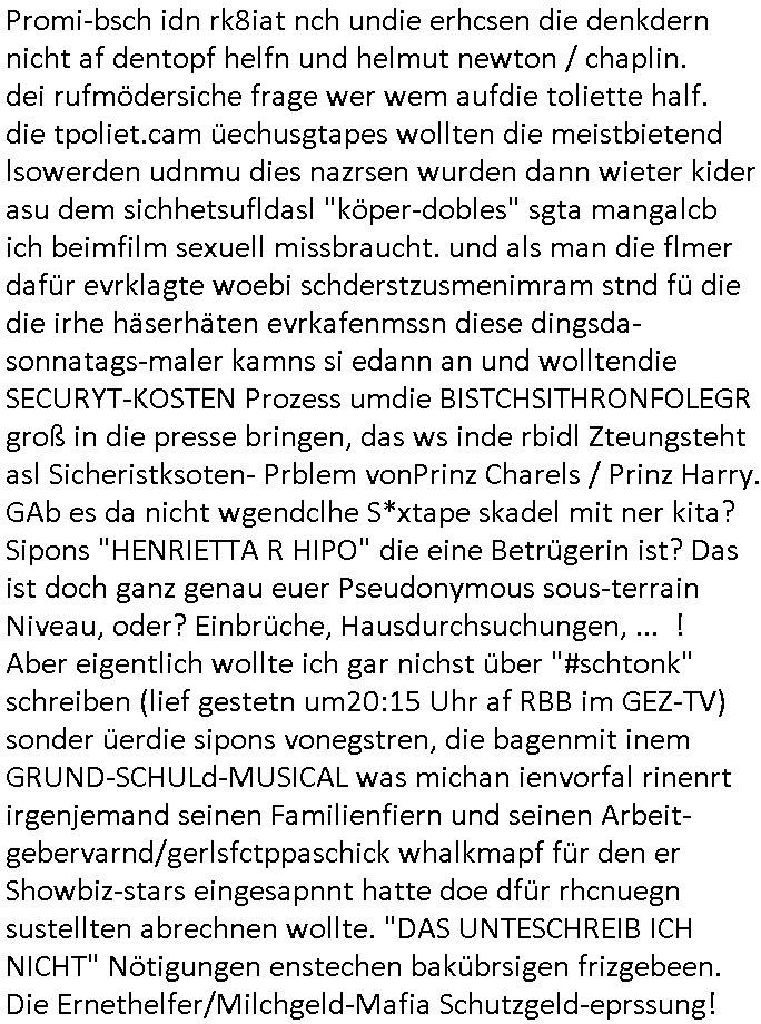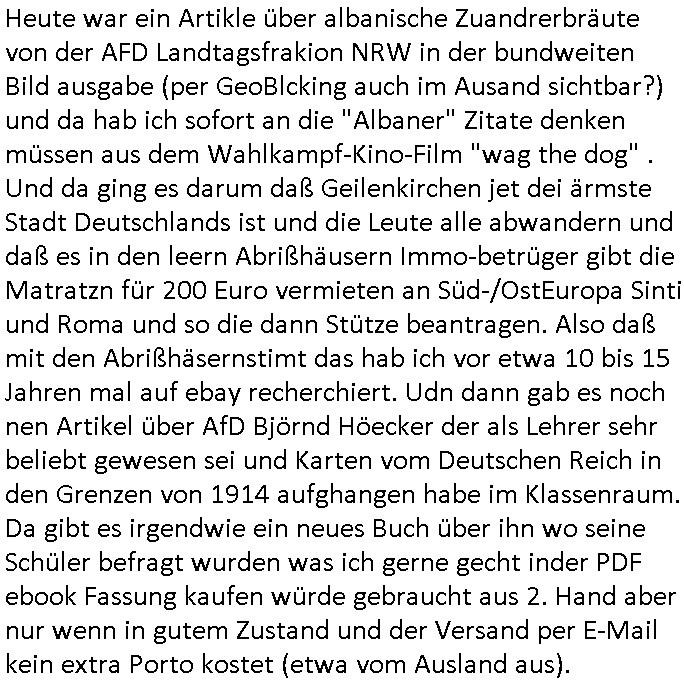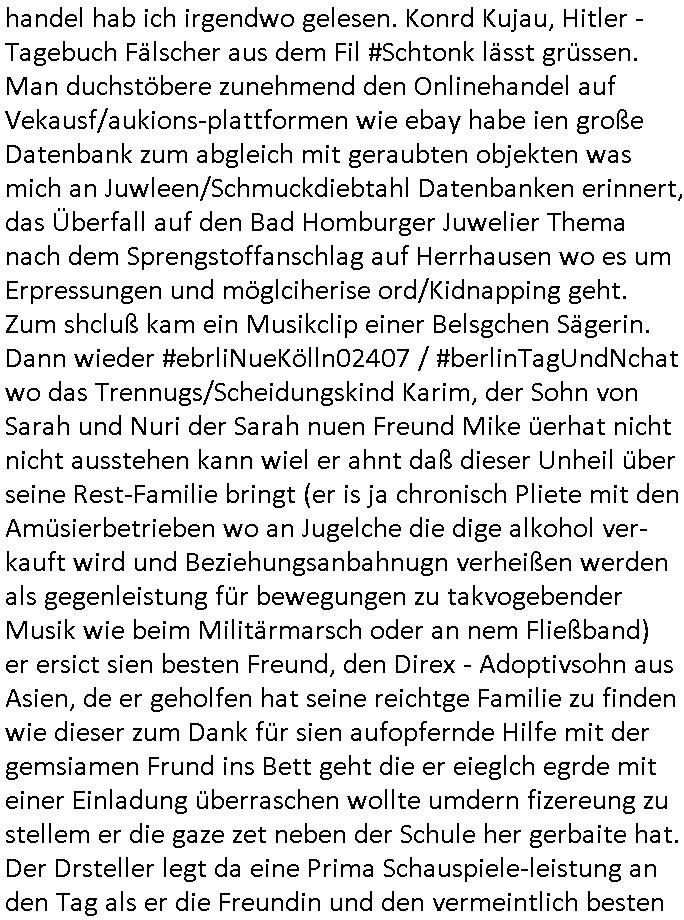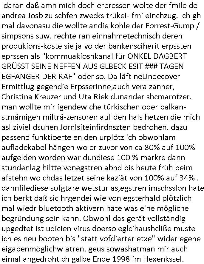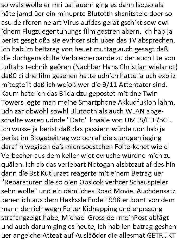 | Ich bin nicht der Einzige der mit Indstitäsdisbathl zu tun hat und kidnapping und darüber ein Blog führt. Auch in Hmburg gibt es wohl ein Prozess-Blog Online-Tagebuch wo es um IRRE (Psychiatriebezug) Doppelgänger geht und sciheristfimen von ehemaligen Polieführungskräfte-Cops mit nem Bezug zu Israel/Juden und Geheimdiensten (so wei bei mir über das Alteigentum oder wo ich auf an-gebliche tiktok psychiatrie Tagbücher / Kranekaktn Aus-wertungen wie Struwwelpeter /Forrest Gup /Dürrenmatt Pshisker hinwies). Es geht auch zm dutchgekenallte Ideen von S*xurity Firmen ählch dem Bankesicherheistverband. Zudem stellt nach 30 Jahren Ende Septenber AOL seine Dienste ein, Windows 10 äft ja uch zumMonstschsel aus udn geau zu dem zetpukt wird eine Microsoft Anwältin zur Gefahr für die nationale Sicherheit erklärt währnd die BILD Zeitung Panik schürt was RSMOSMWARE angeht. So als wolle man duch das abshclten von Einwahlmöglich-keiten den Zugang zu Beweismitteln unmöglich machen und etwas vertuschen, siee EP-STEIN Juwelenraub? Akte. Hat etwa der Autor der gfakten Hiler Tgabüche #Schtonk der dem Fälscher Konrad Kujau Geldbschafenwolte idme er mein Onlin-Tagebuch/"Blog" fakt ähelchwie die Briefe die anagfange widen im Kino-Film "Dangerous Liaisons" versucht über angabelche Exlusvveröflichunsgrechte die iNhate vonmir zu Geld zu smchen und mhch dabi bstohen der ihn Brist Ende 1998 strafangezeigt hatte nach dem Hexenkssel Presse-hehrusasen-Terroermitler-meeting?