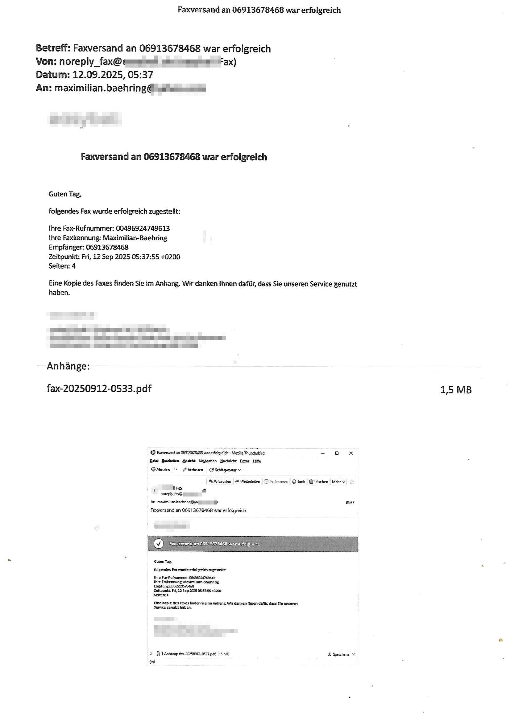 Betreff: Faxversand an 06913678468 war erfolgreich Datum: Tue, 02 Sep 2025 01:54:47 +0000 (UTC) Von: Fax <noreply_fax@> An: maximilian.baehring@ Web2Fax Faxversand an 06913678468 war erfolgreich Guten Tag, folgendes Fax wurde erfolgreich zugestellt: Ihre Fax-Rufnummer: 00496924749613 Ihre Faxkennung: Maximilian-Baehring Empfänger: 06913678468 Zeitpunkt: Tue, 2 Sep 2025 03:54:46 +0200 Seiten: 4 Eine Kopie des Faxes finden Sie im Anhang. Wir danken Ihnen dafür, dass Sie unseren Service genutzt haben. | |