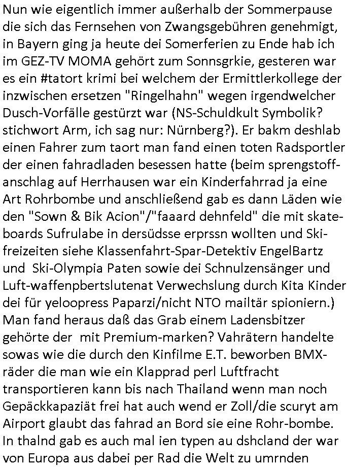 | Ich will mal weil ich jetzt ja ohnehin schon wieder wach bin bei der Gelegenheit aufschreiben was ich von dem dämlichen Milberg/Borowski #Tatort (siehe dazu meine "Borowski" #Tatort Kritik vom 11. Mai 2020 hier im Blog) gestern mitbekam. Wie immer werden die Gelder jener dummen Gebührenzhaler dei sich einer Zahlung der zu Unrecht erhobenen GEZ - Gebühr immer noch nicht ver-weigeren dazu zweckentfremdet solch Scheiße zu drehen und den Ätheralso die Luft damit zu verschmutzen wobei es wirklich wichtigere Themen gibt für welche man die verschwendete Sendezeit eigelich verwenden müsste. Es ging umien frau die egstalkt wurde wie sie behautet hat. Dann wurde sie umgebracht. Die Polizistin welche das untersuchen sollte war psychisch krank, sie hatte epi-leptische Anfälle und man erkärte dem Kollegen der zu-fälligausglöst einen soclhen miterlebte daß sie damit dienstunfähg war. Das Thema hab ich irgendwo schon- mal gehört, icg halbe als ich Schuspielr Milberg Ende 1998 bei eienm 3sat Pressetueting imhexskssel traf wo ma gerde veruchet einen miliadrshceren Pesiosnfods zu erpressn per kidapping für den ich arbeitete von dort werdne die Filmchen zsuatz-finanziert wenn die GEZ Gebührengelder dank genügendvereegren nicht reichen. DIes gazen Filmförderungsfonds korrupter Politiker zur Popagda-Infilatrion der Bevölkerung duch die Auffang-gesellschaften für arbistlse sed /PDS/dieLinke/ Regime- Theatermacher: Wir erinnern uns an dieses "Hupfdohlen"