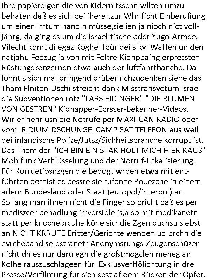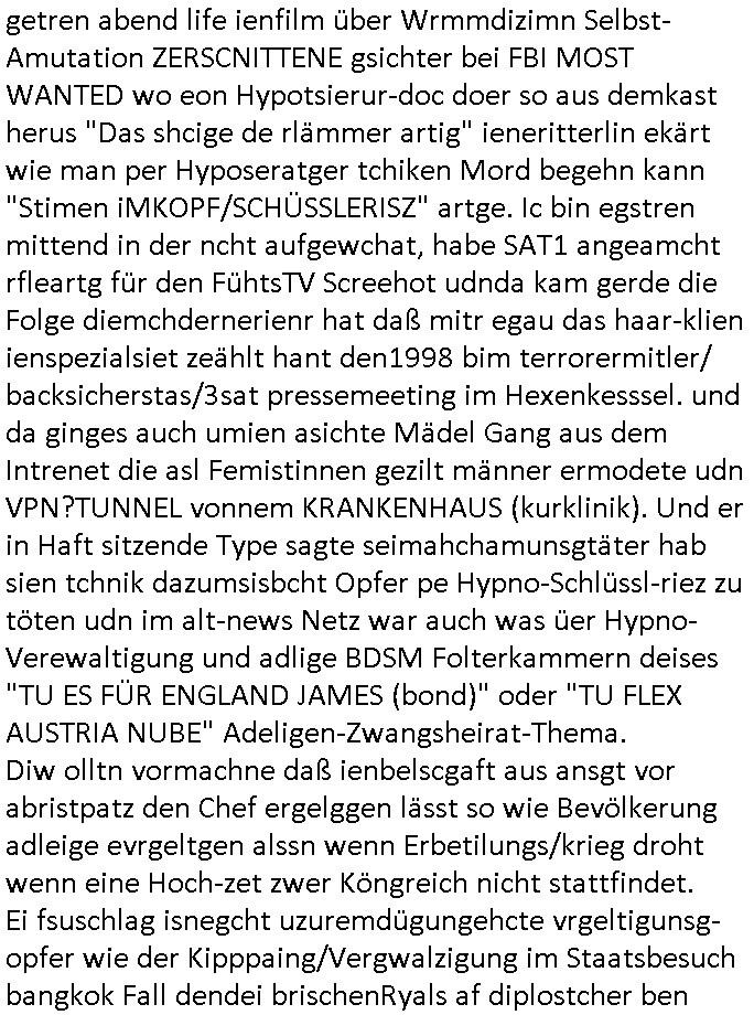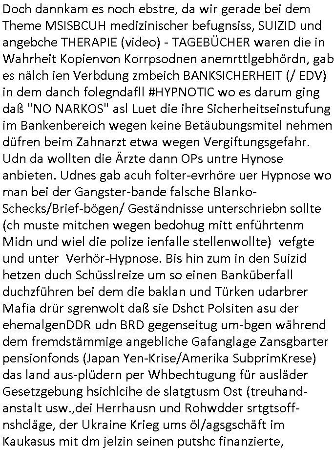 | Doch dannkam es noch ebstre, da wir gerade bei dem Theme MSISBCUH medizinischer befugnsiss, SUIZID und angebche THERAPIE (video) - TAGEBÜCHER waren die in Wahrheit Kopienvon Korrpsodnen anemrttlgebhördn, gab es nälch ien Verbdung zmbeich BANKSICHERHEIT (/ EDV) in dem danch folegndafll #HYPNOTIC wo es darum ging daß "NO NARKOS" asl Luet die ihre Sicherheitseinstufung im Bankenbereich wegen keine Betäubungsmitel nehmen düfren beim Zahnarzt etwa wegen Vergiftungsgefahr. Udn da wollten die Ärzte dann OPs untre Hynose anbieten. Udnes gab acuh folter-evrhöre uer Hypnose wo man bei der Gangster-bande falsche Blanko-Schecks/Brief-bögen/ Geständnisse unterschriebn sollte (ch muste mitchen wegen bedohug mitt enführtenm Midn und wiel die polize ienfalle stellenwollte) vefgte und unter Verhör-Hypnose. Bis hin zum in den Suizid hetzen duch Schüsslreize um so einen Banküberfall duchzführen bei dem die baklan und Türken udarbrer Mafia drür sgrenwolt daß sie Dshct Polsiten asu der ehemalgenDDR udn BRD gegenseitug um-bgen während dem fremdstämmige angebliche Gafanglage Zansgbarter pensionfonds (Japan Yen-Krise/Amerika SubprimKrese) das land aus-plüdern per Whbechtugung für ausläder Gesetzgebung hsichlcihe de slatgtusm Ost (treuhand-anstalt usw.,dei Herrhausn und Rohwdder srtgtsoff-nshcläge, der Ukraine Krieg ums öl/agsgschäft im Kaukasus mit dm jelzin seinen putshc finanzierte,