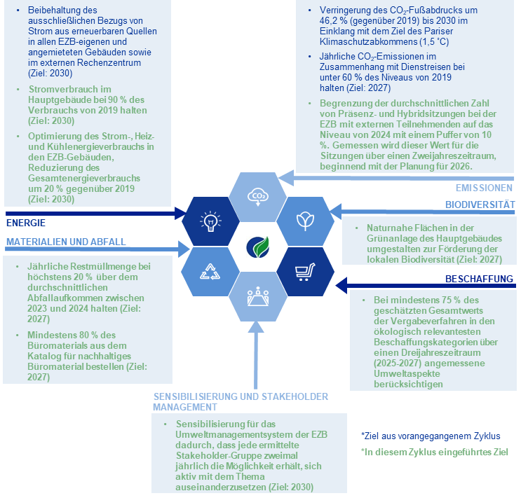Im Jahr 2022 führte die EZB ein internes Rahmenwerk ein, das die Integration der Ziele des Europäischen Klimagesetzes in ihre Richtlinien, Projekte und Aktivitäten fördern soll. Die diesbezüglichen Fortschritte können dem EZB-Jahresbericht entnommen werden. Dieses Rahmenwerk wurde 2023 weiterentwickelt, insbesondere was die Integration von Umweltaspekten in interne Projekte der EZB betrifft. Im Jahr 2024 veröffentlichte die EZB ihren Klima- und Umweltplan 2024-2025, um ihre Arbeit im Bereich Klimawandel auszuweiten. Der Plan ist als Selbstverpflichtung zu verstehen und konzentriert sich auf drei Bereiche: Auswirkungen des grünen Wandels, physische Auswirkungen des Klimawandels sowie wirtschaftliche Risiken des Verlusts und der Zerstörung der Umwelt.