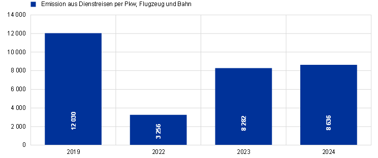 2024 war das zweite Jahr, in dem der Betrieb der EZB wieder komplett ohne pandemiebedingte Einschränkungen ablief. In den Jahren 2020 bis 2022 waren diese Einschränkungen deutlich zu spüren: Dienstreisen waren zu der Zeit nur sehr begrenzt möglich, und auch die Präsenzarbeit in den EZB-Bürogebäuden war eingeschränkt. 2023 wurden die Einschränkungen aufgehoben und die EZB kehrte zum normalen Geschäftsbetrieb zurück. Infolgedessen vergrößerte sich ihr CO2-Fußabdruck wieder, insbesondere wegen des Anstiegs der Emissionen aus Dienstreisen. Diese Emissionsart legte 2024 leicht um 5 % zu, während die Emissionen aus Reisen wegen Konferenzteilnahme um 6 % gegenüber dem Vorjahr abnahmen. Diese beiden Emissionsquellen bleiben wichtige Arbeitsschwerpunkte für die EZB bei den Anstrengungen zur weiteren Verringerung ihrer Klimaauswirkungen (siehe Kapitel 5.2 – Indirekte Emissionen).