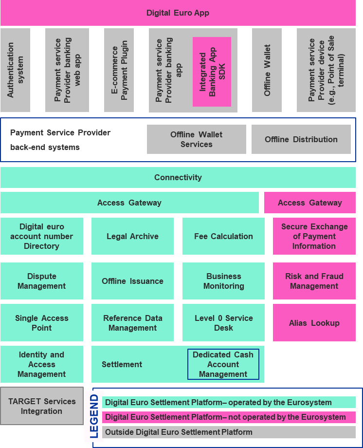 In parallel with the procurement of external components, the ECB conducted a call for offer among all Eurosystem NCBs to deliver core components such as clearing and settlement and issuance. As a result, a group of six NCBs (Banca d’Italia, Banco de España, Banque de France, Deutsche Bundesbank, Lietuvos Bankas and Oesterreichische Nationalbank) was selected by the Governing Council on 23 July 2025[21] as the provider for the core components.