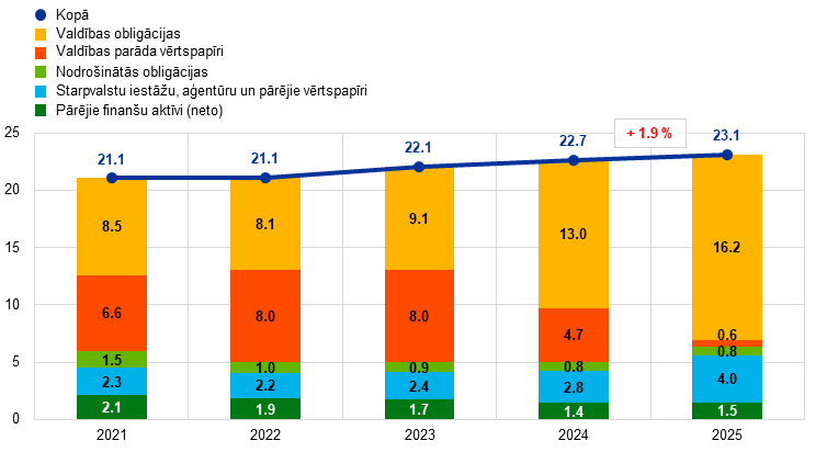 2025. gadā ECB bilance samazinājās par 37.3 mljrd. euro, un to galvenokārt noteica monetārās politikas vērtspapīru sarukums, jo Eurosistēma vairs atkārtoti neieguldīja AIP un PĀAIP ietvaros turēto vērtspapīru, kuriem pienācis dzēšanas termiņš, pamatsummas maksājumus.