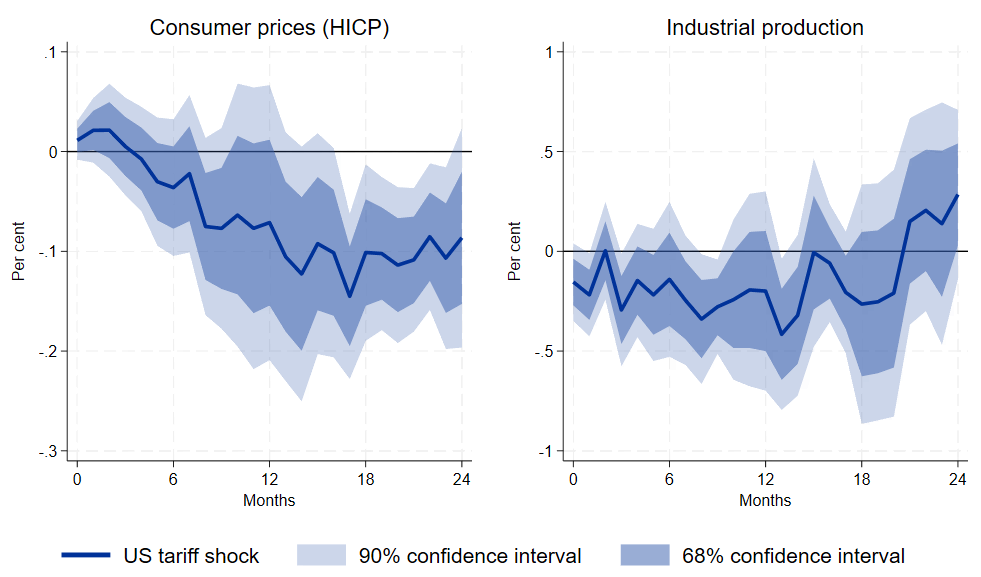 All of this means that the consequences of one country’s import tariffs for other countries’ economies are influenced by a wide range of partly opposing effects. In this blog, we analyse which of these effects dominates, on balance. We estimate how declining trade volumes with the US following increases in US tariffs affect the euro area. When trade falls by more than expected after a rise in tariffs – a situation we call a “tariff-related trade surprise” (TTS) – euro area inflation declines and economic activity weakens over the medium term. Our results therefore suggest that the effects of the drop in demand due to US tariffs on the euro area outweigh any inflation-boosting supply effects.[3]