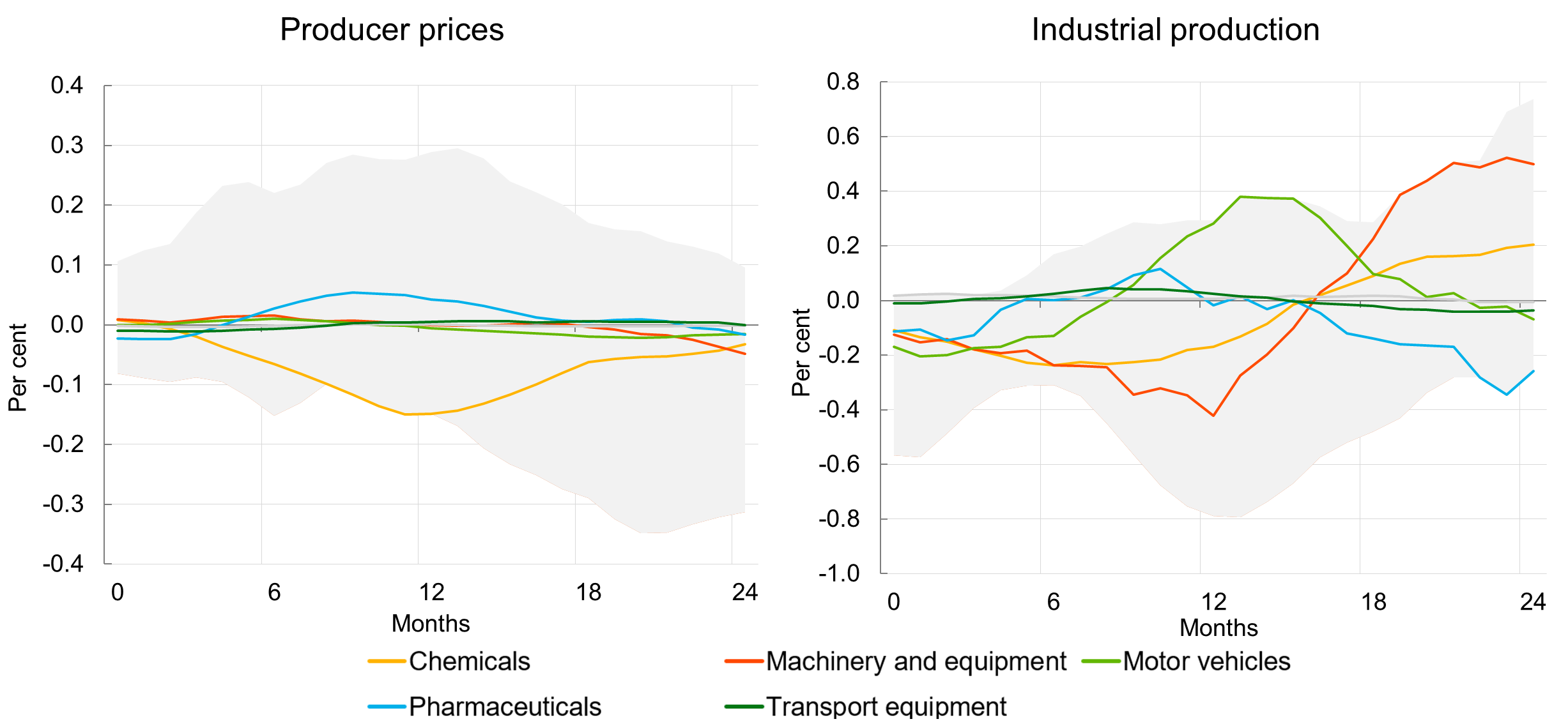Notes: Impulse responses are derived by local projections estimated in long-differences (see for example Jorda and Taylor, 2024). Tariff-related trade surprises (TTSs) are identified following the same two-step approach as described in the notes to Chart 1 and are scaled to a 1% trough decline in bilateral sector-specific exports of euro area countries to the United States in the first year after the shock. The local projections include the first six lags of several euro area macroeconomic and financial market control variables, including industrial production, bilateral euro area exports to/imports from the United States and China, the HICP, the unemployment rate, the EUR/USD exchange rate, the euro area Composite Indicator of Systemic Stress, the three-month overnight index swap rate, GDP-weighted ten-year sovereign bond yields, the IMF commodities price index, and the aggregate TTSs as identified for the aggregate results presented in Chart 1. The grey area covers the min-max range of impulse responses estimated for a reference set of other manufacturing sectors.