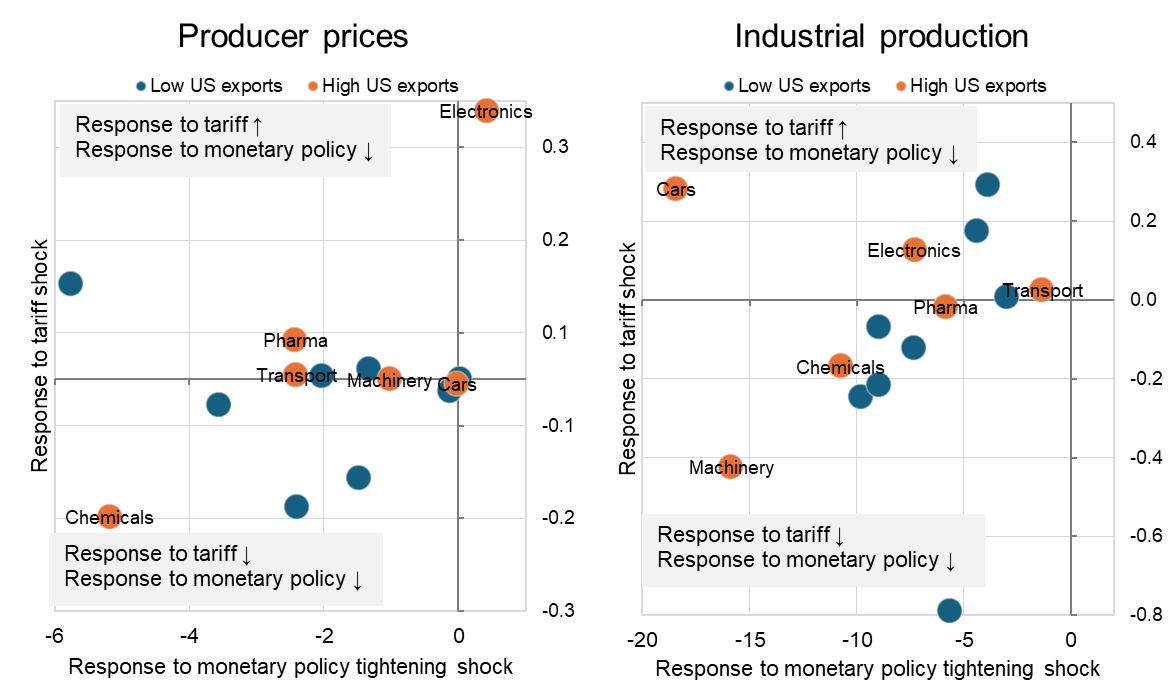 Monetary policy can soften these effects. We find that the impact of US tariffs differs notably between sectors. Those sectors hit hardest by TTSs are also those that respond most strongly to interest rate changes. Consequently, monetary policy can help counter the adverse effects of higher trade barriers.
