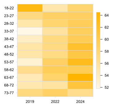 In addition to period and age effects, we also assess if specific generational cohorts (people born around the same time) display unique behavioural or attitudinal trajectories. This involves assessing two key considerations: (1) whether a specific birth cohort consistently behaves differently to other cohorts of the same age and in the same period (inter-cohort effect) and (2) whether their behaviour has changed as they age (intra-cohort effect)?[18] Identifying these two cohort effects matters, as it ensures that patterns primarily driven by generational differences are not misattributed solely to age or period. This ultimately enables more accurate decomposition of the observed developments.[19]