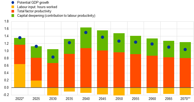 Notes: The data refer to average growth in the specified year and the following four years. Capital deepening refers to changes in the ratio of capital to labour. * For 2022, the data refer to average growth in the period 2022-24. ** For 2070, the data refer to annual growth in the year 2070.