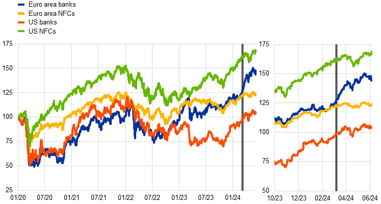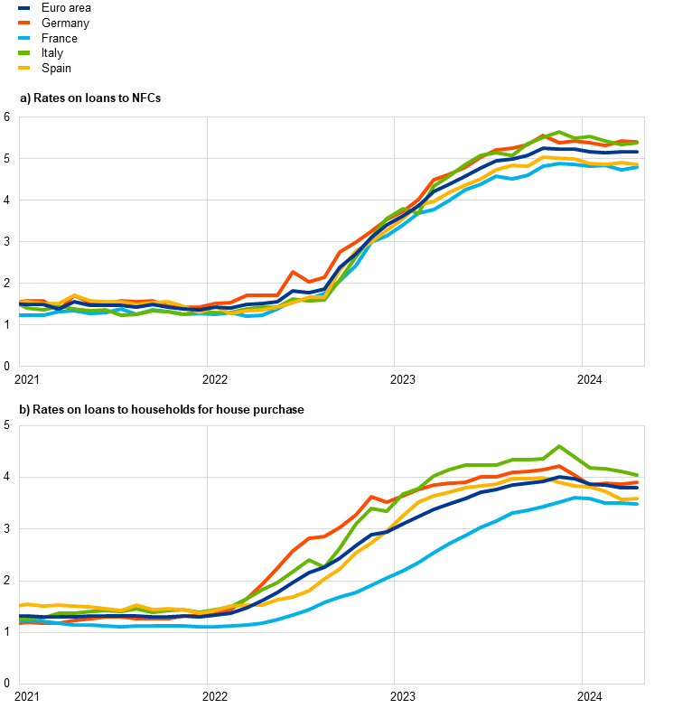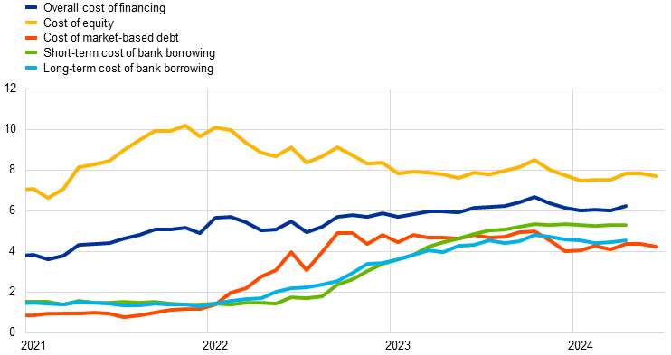 13. Owing to lags in data availability for the cost of borrowing from banks, data on the overall cost of financing for NFCs are only available up to April 2024.