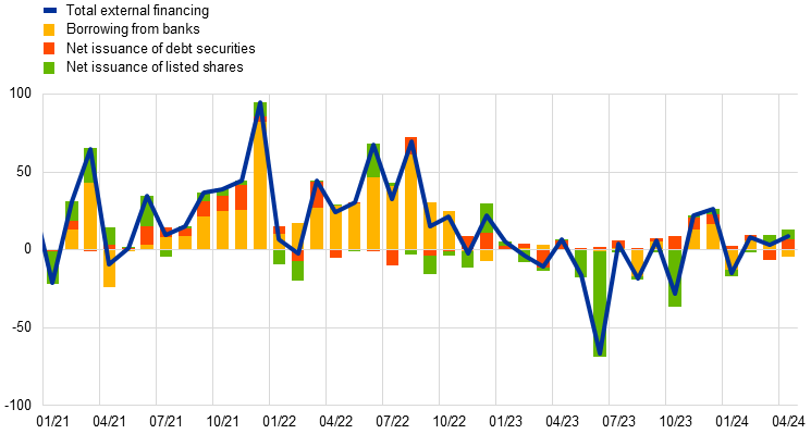 Notes: Net external financing is the sum of borrowing from banks (MFI loans), net issuance of debt securities and net issuance of listed shares. MFI loans are adjusted for loan sales, securitisation and cash-pooling activities. The latest observations are for April 2024.