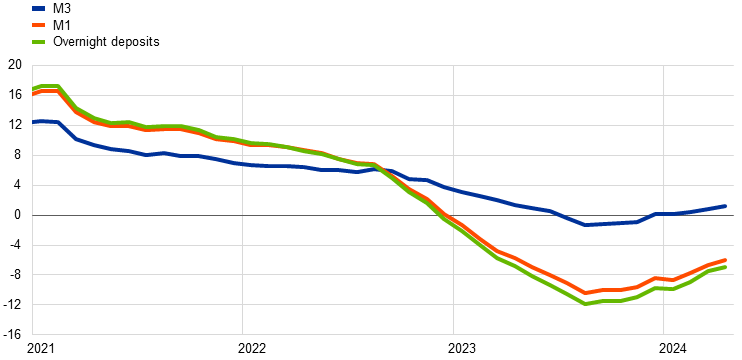 The annual growth rate of broad money (M3) continued its gradual recovery in April 2024, driven by another sizeable net foreign inflow. Money growth has been gradually increasing over recent months, even though loans to households and firms remained weak. In April M3 growth in the euro area increased to 1.3%, up from 0.9% in March (Chart 20). Annual growth of narrow money (M1) – which comprises the most liquid assets of M3 – stayed in negative territory, but increased further, rising to ‑6.0% in April compared with ‑6.6% in March. In April money creation was driven by a large foreign inflow, amid the ongoing current account surplus from weak imports, and was supported by a large net issuance of euro area governments bonds. These inflows were partially offset by the continuing contraction of the Eurosystem balance sheet, while the contribution of lending to firms and households continued to be muted.